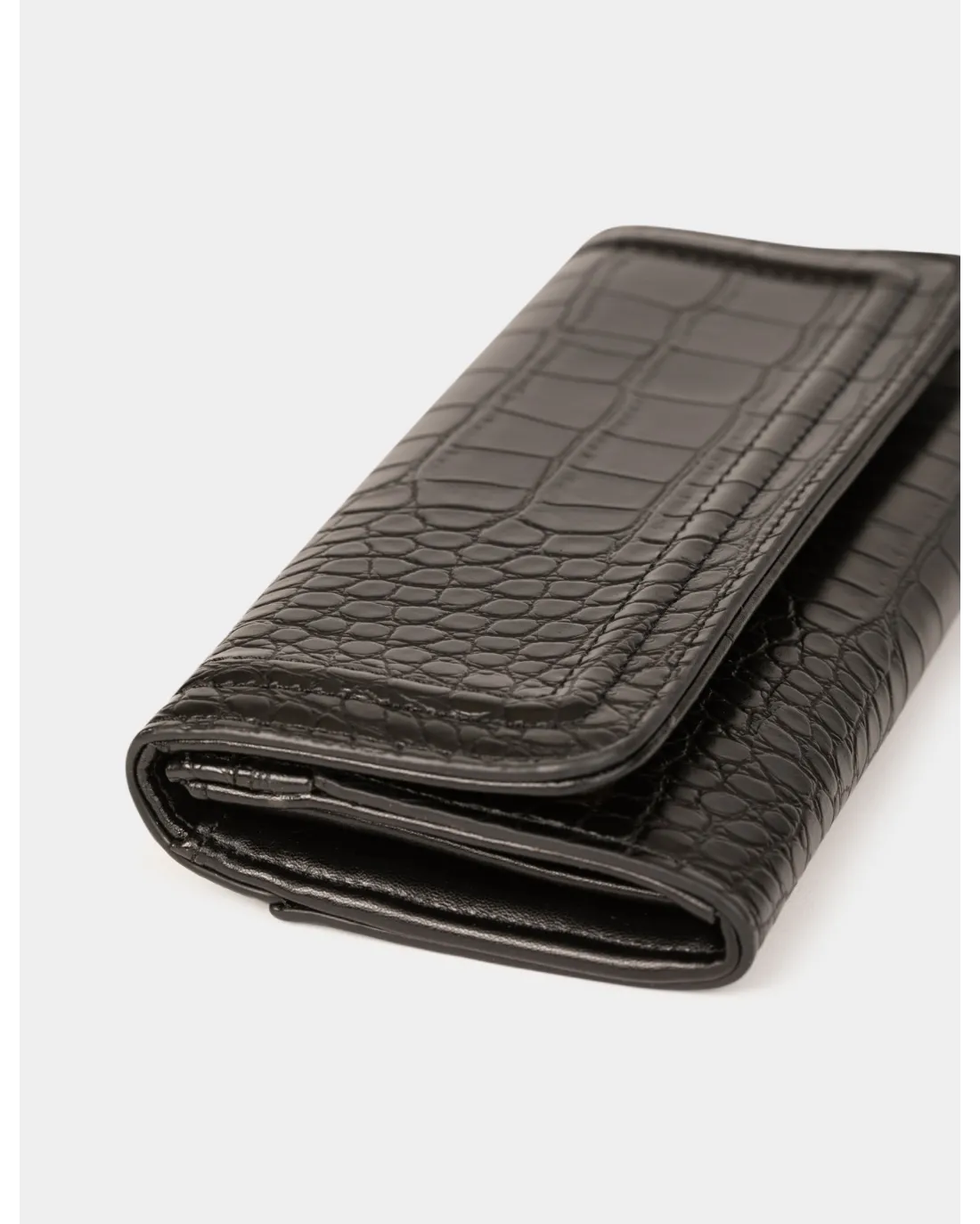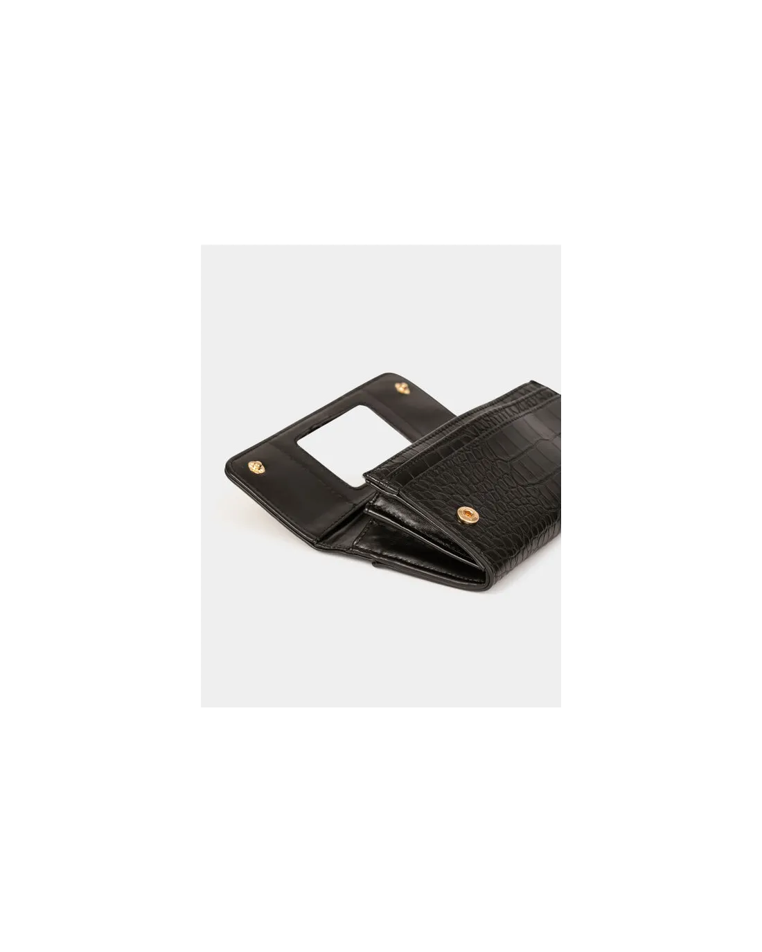 Cartera efecto piel de cocodrilo con un compartimento con cremallera y apartados para las tarjeras y un espejo interior.