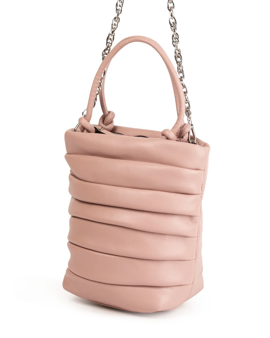 Bolso bombonera con fruncidos con asas para llevar en mano y cadena. Cierre de cremallera y bolsillo interior.