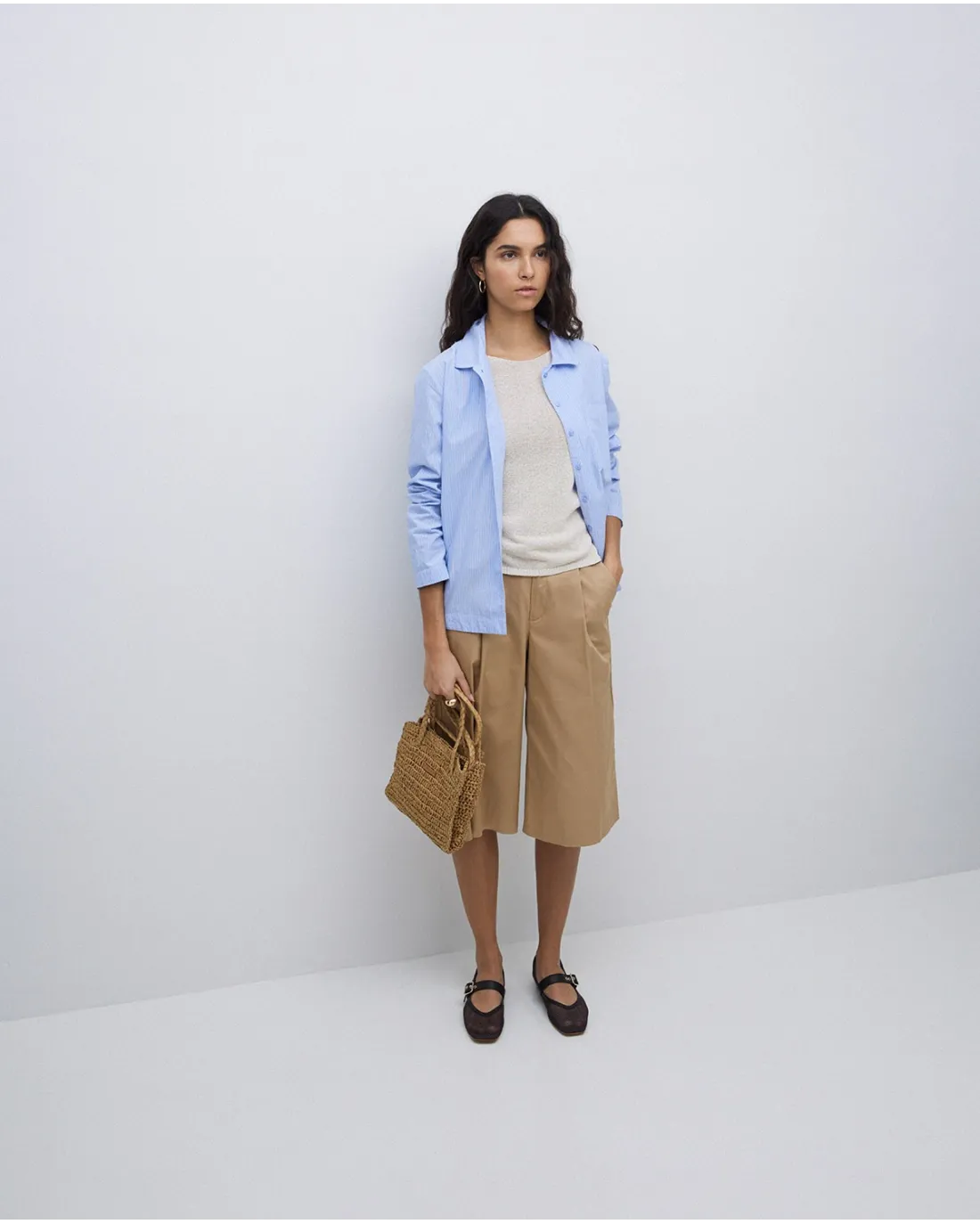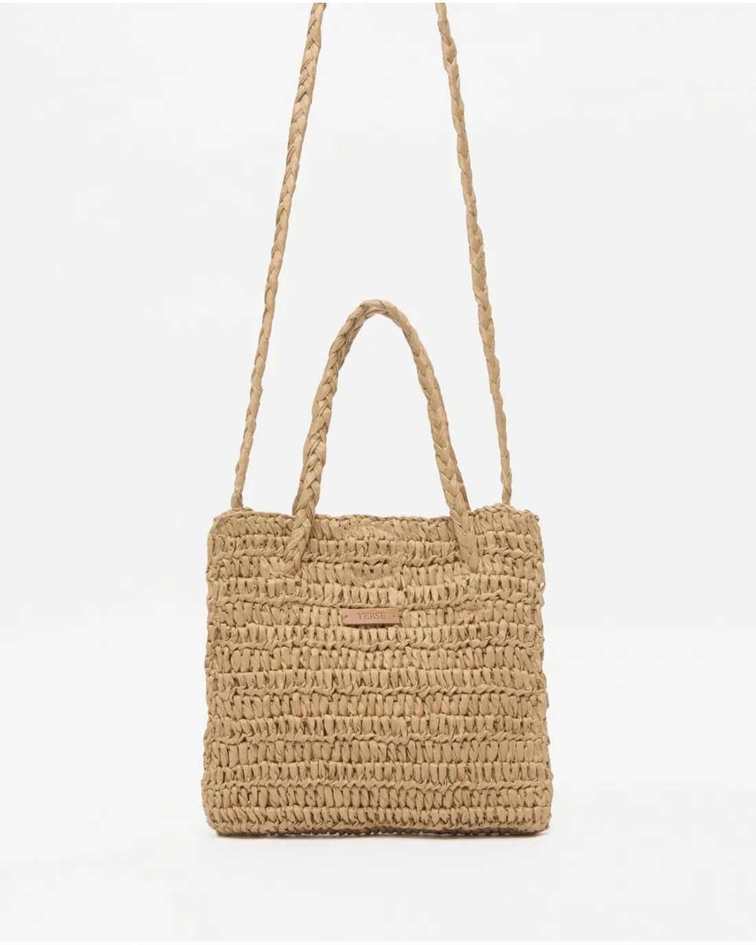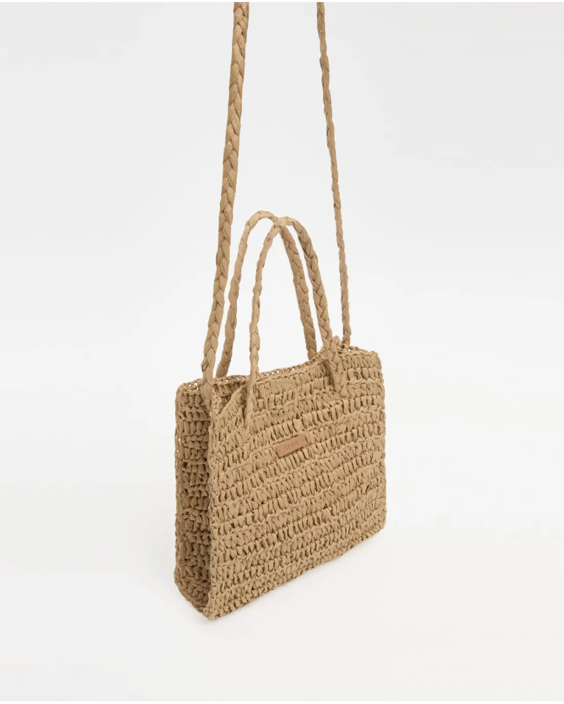 Bolso shopper confeccionado en redecilla de algodón y piel. Su cierre es de cremallera en el interior y botón.