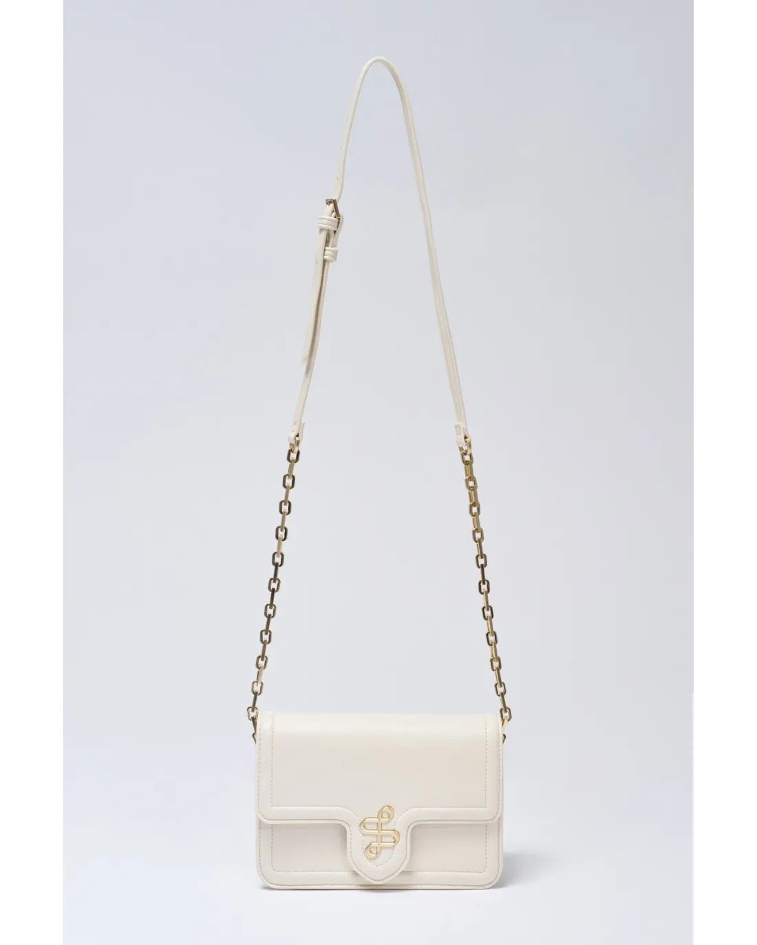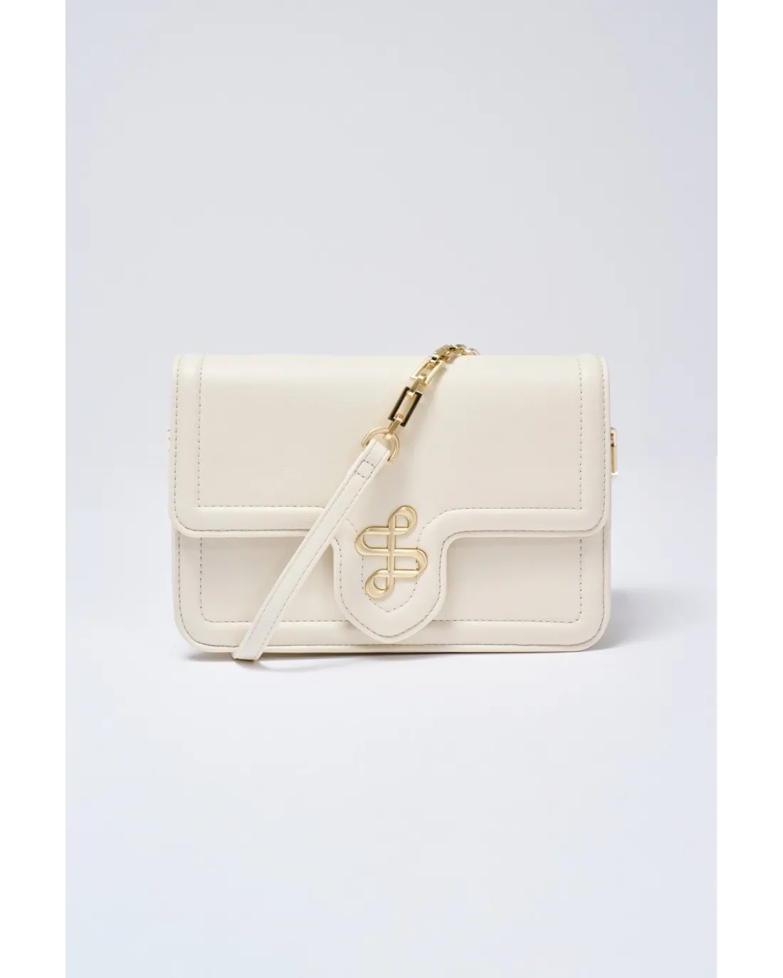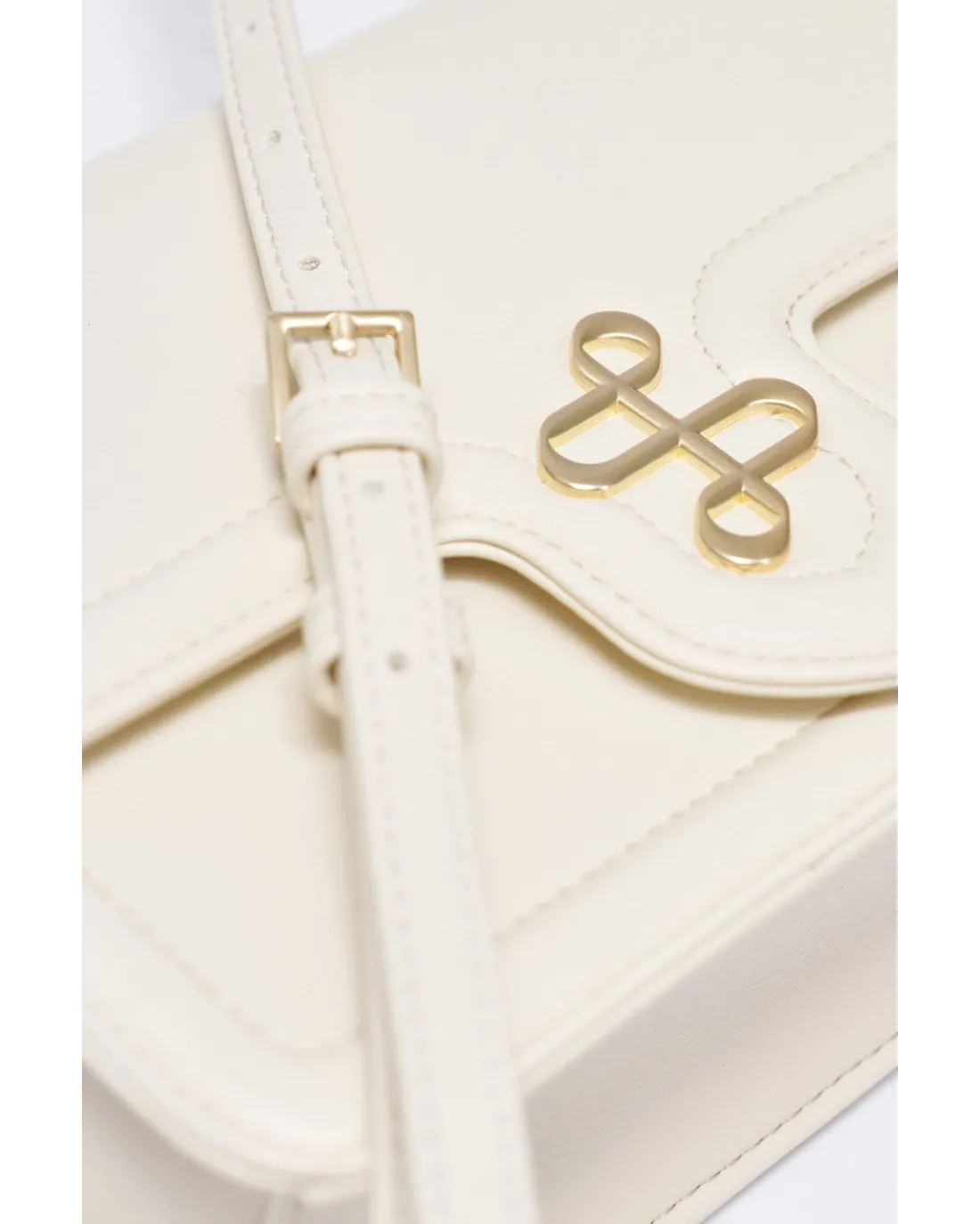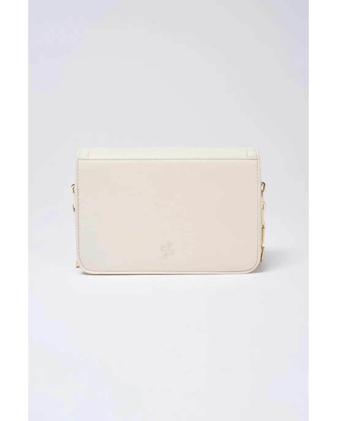 Bolso con tapa y logo con dorado con bandolera ajustable y compartimento en el interior.