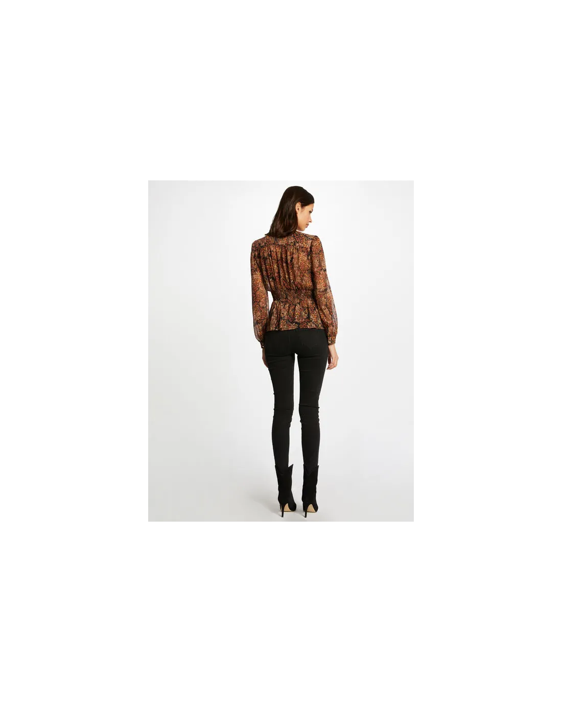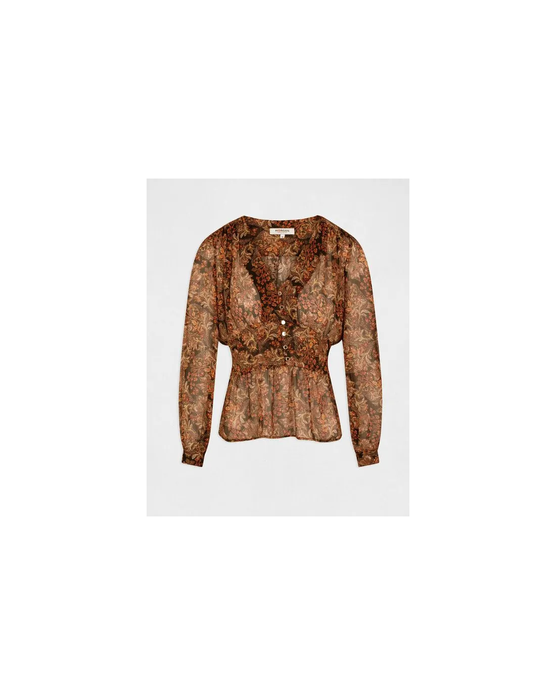 Blusa de manga larga estampada cachemira con escote en V, apliques en los hombros y mangas abullonadas.