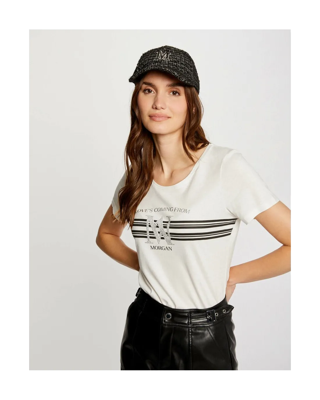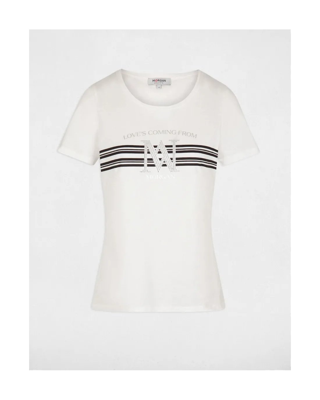 Camiseta de manga corta y cuello redondo con strass y mensaje LOVE´S COMING FROM MORGAN en la parte delantera.