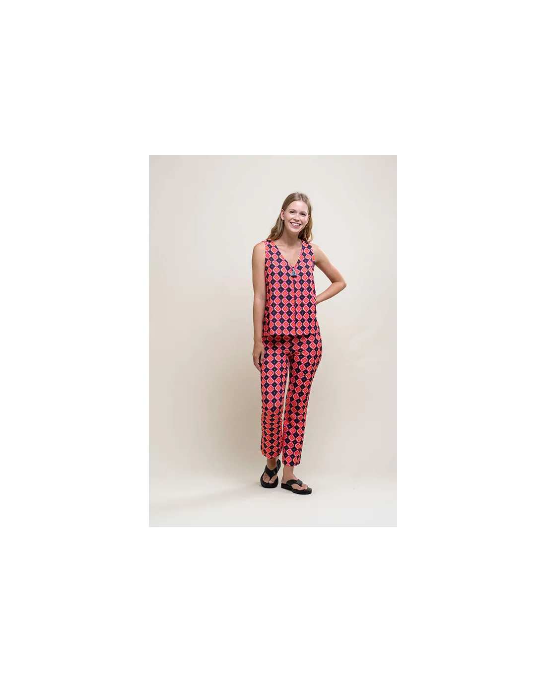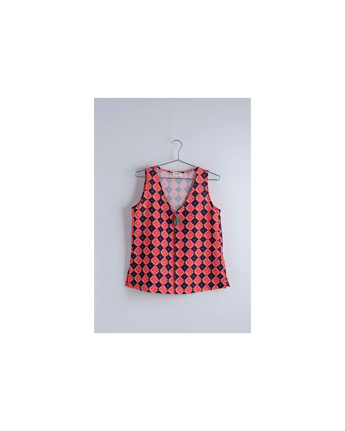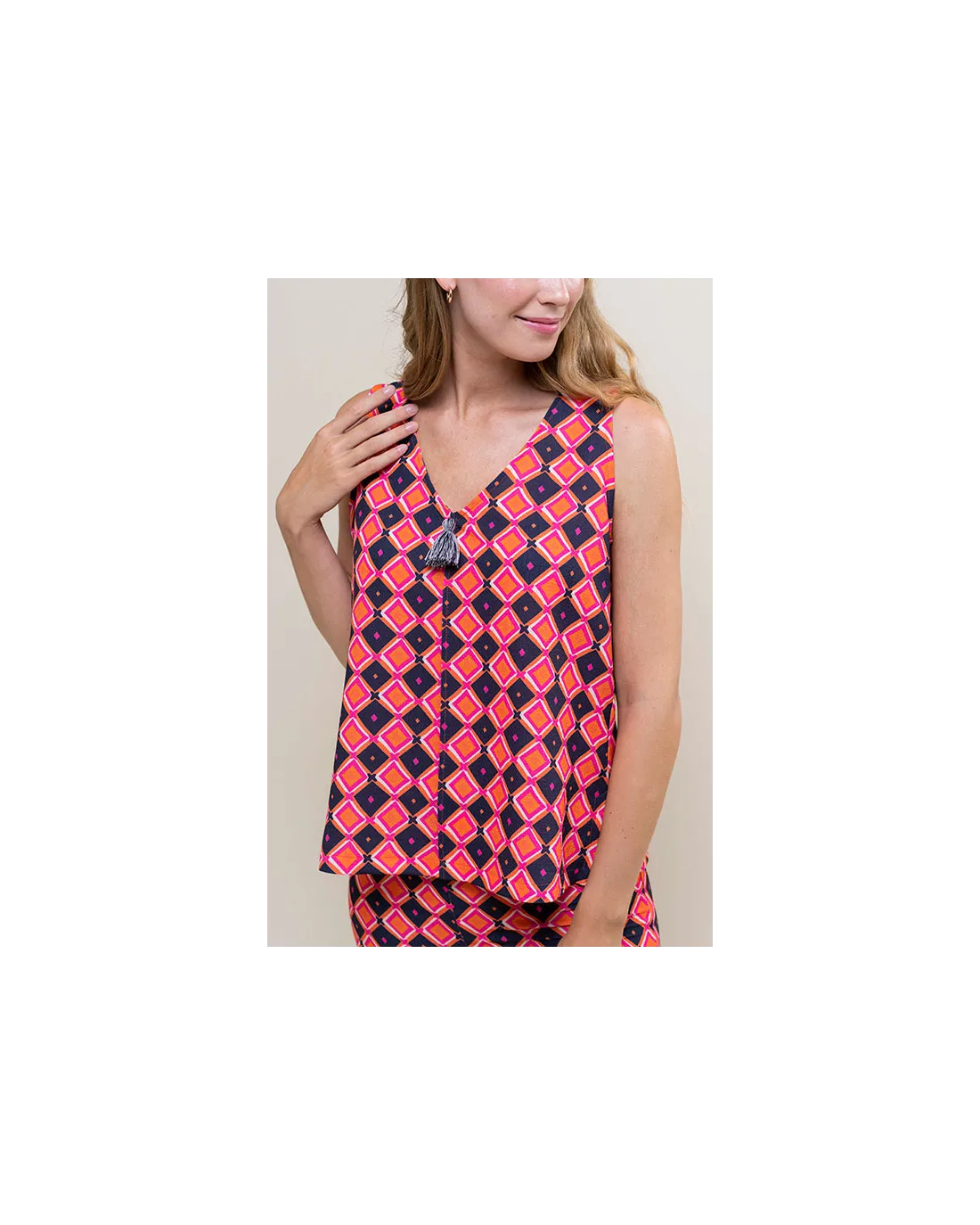 Top con estampación geométrica de tirantes anchos, escote en V con pestaña central y borla a contraste.