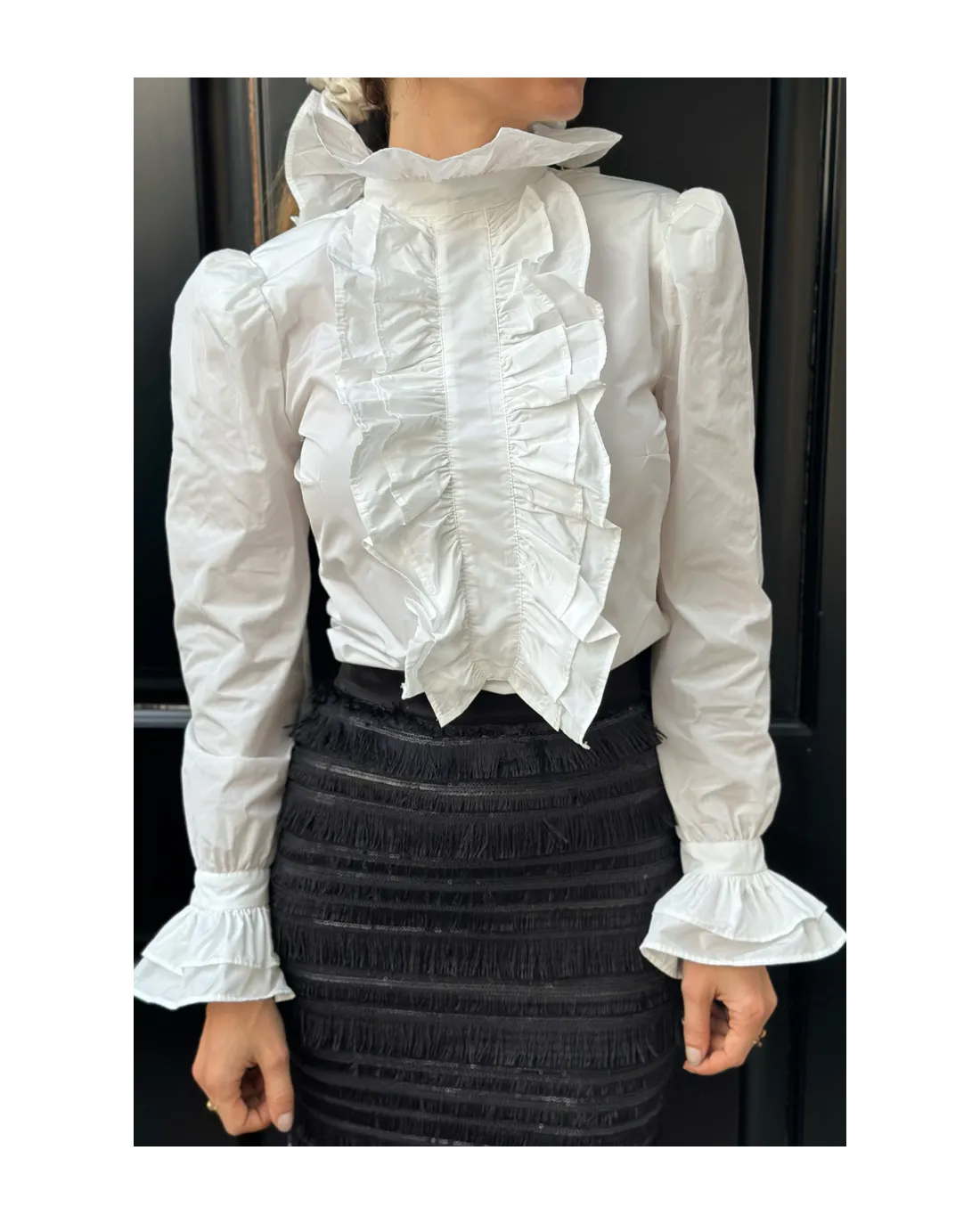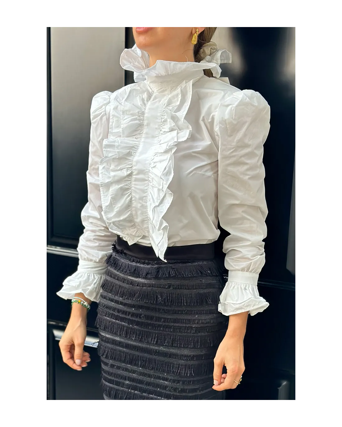 Camisa larga con un maxi lazo para hacer lazada y mangas ligeramente abullonadas acabadas en puño.