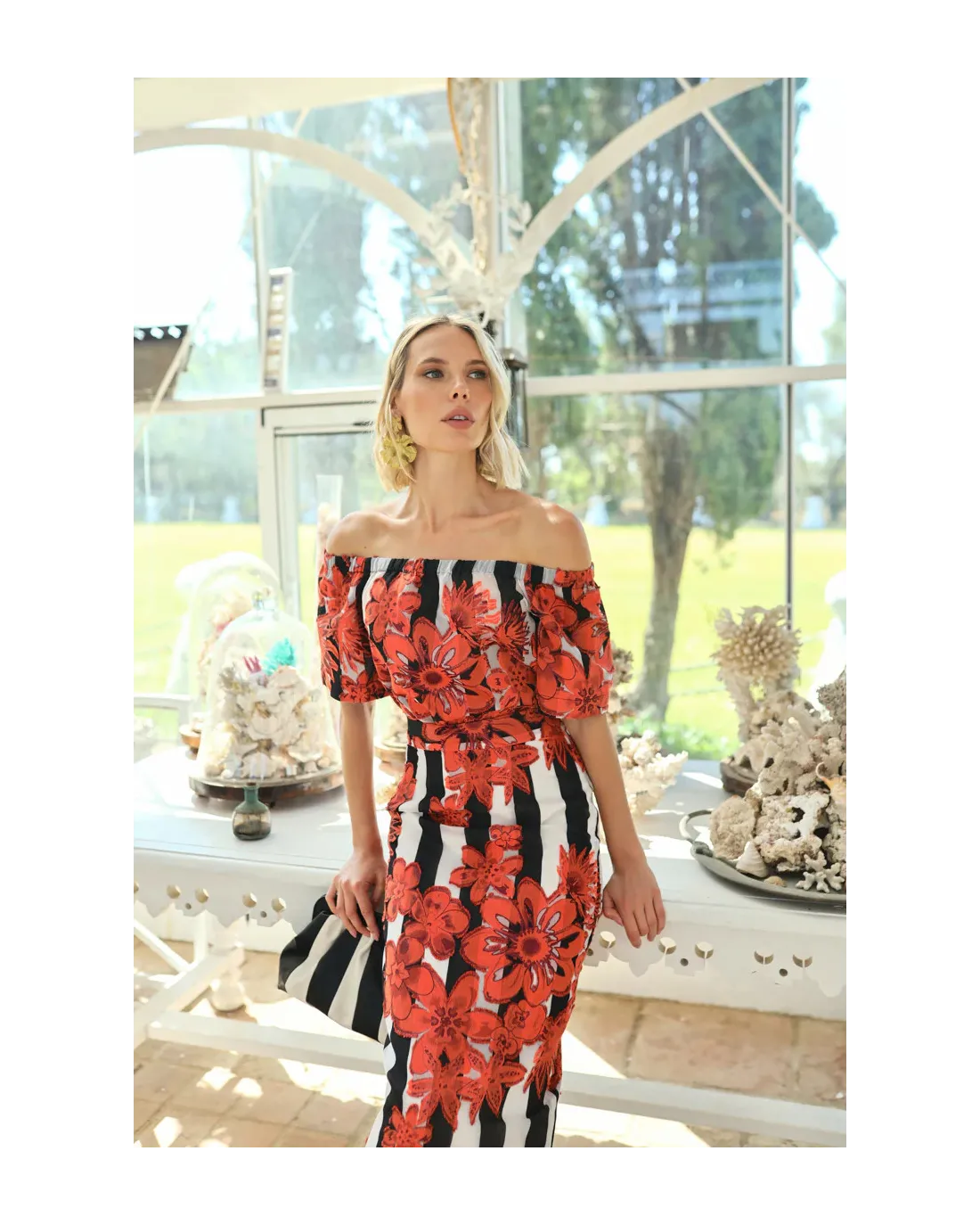 Falda de largo midi y corte entubado con rayas y estampado a contraste. La cinturilla es alta con cierre de cremallera trasera invisible. Perfecta para combinar con top CAGUAS.
