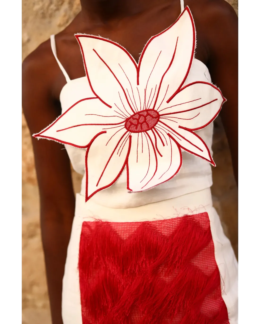 Top confeccionado en tejido de lino con tirantes finos. En la parte delantera lleva una maxi flor a relieve y a su espalda es ajustada con elástico.
