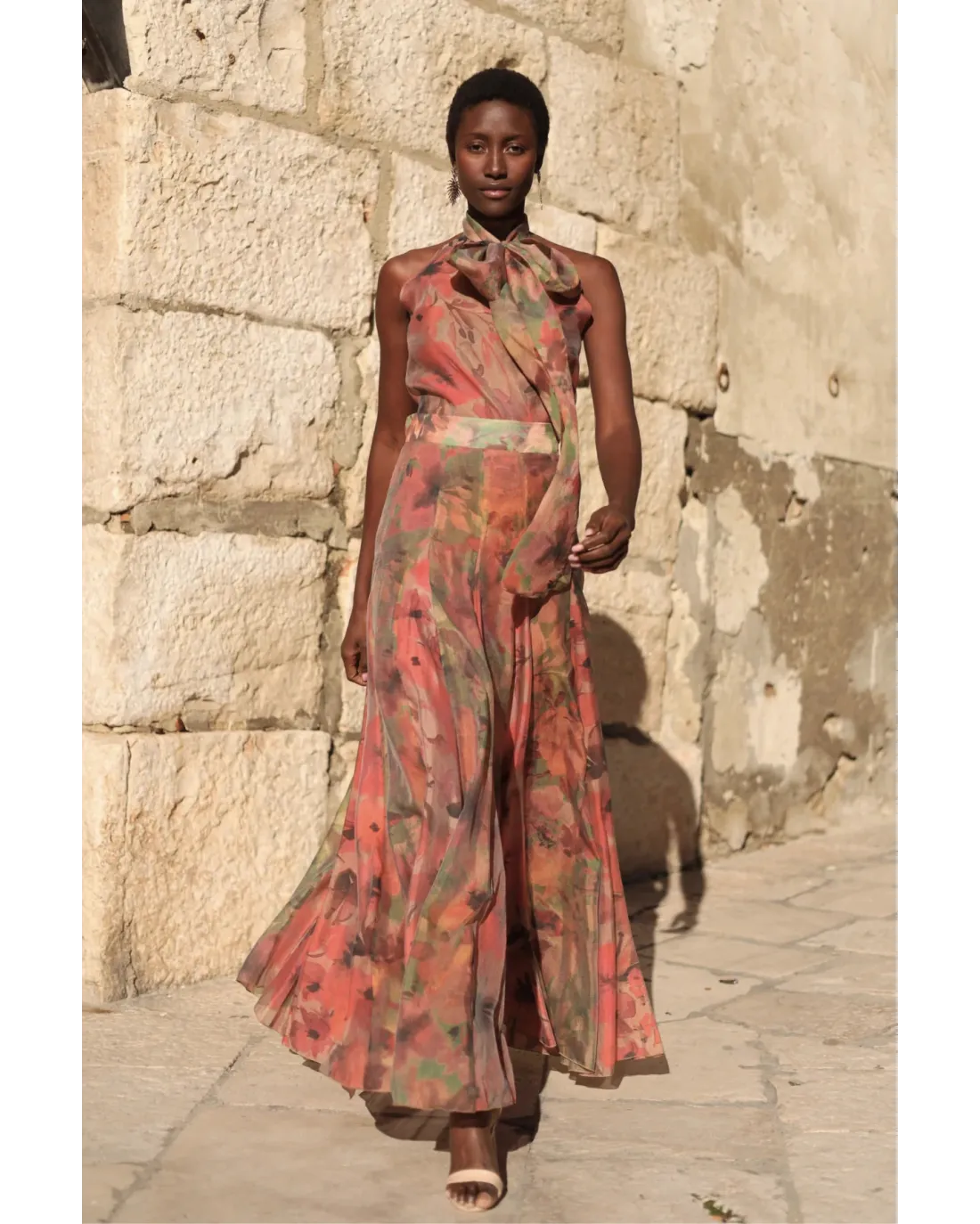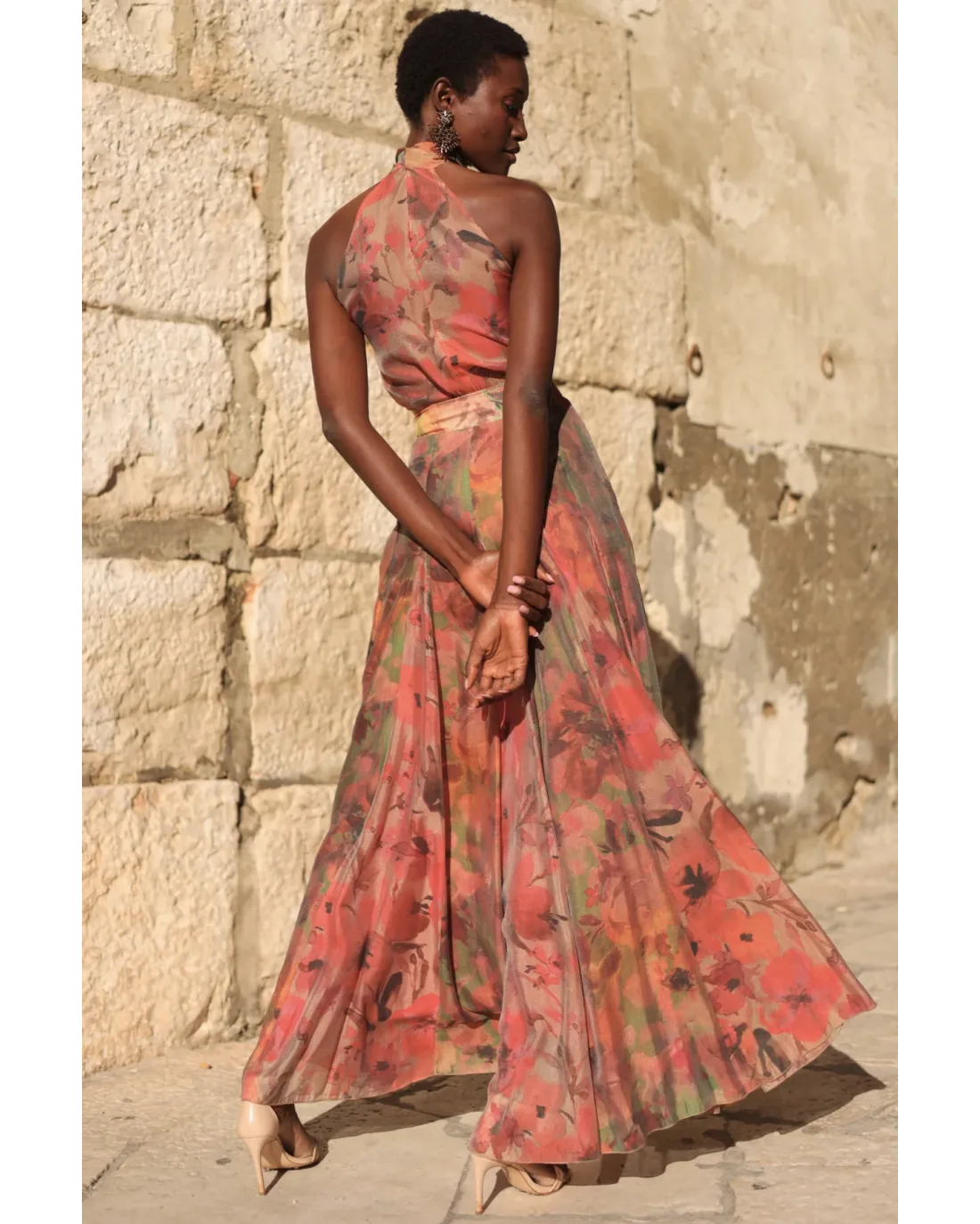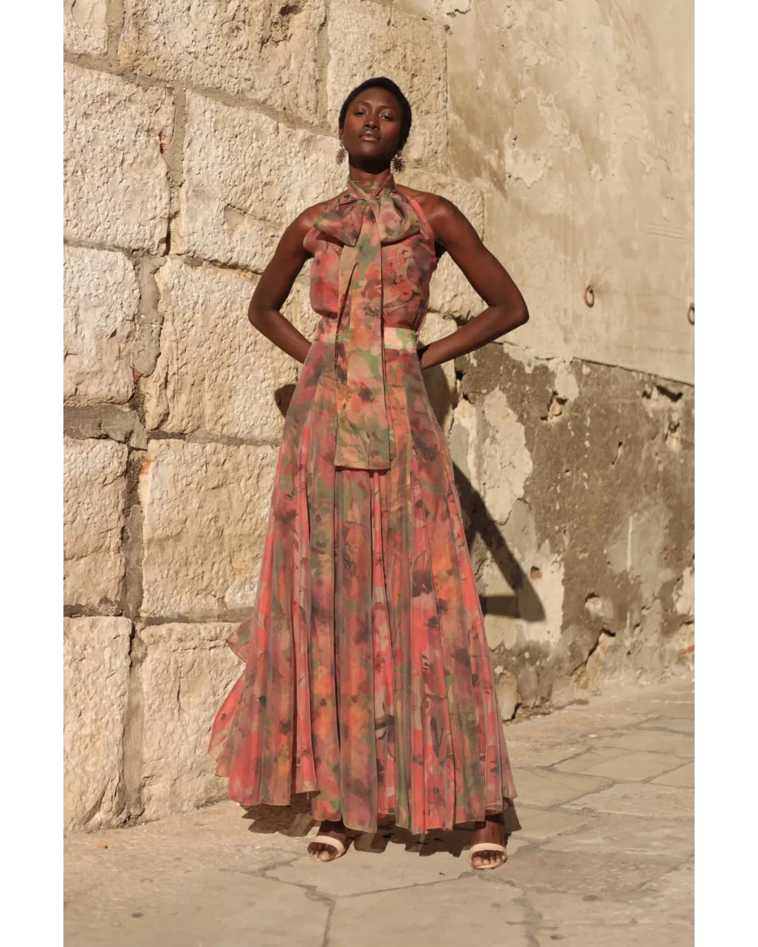 Falda estampada confeccionada en tejido de organza con vuelo y mucho movimiento al andar. La falda lleva cinturilla y cremallera lateral invisible.