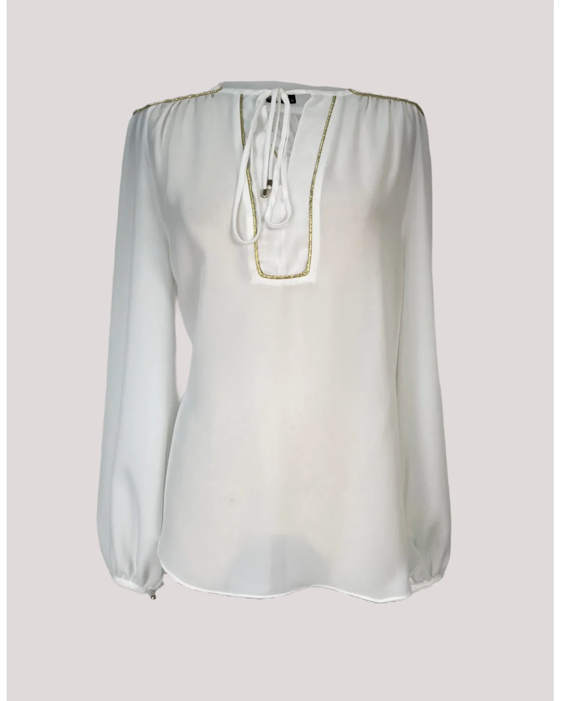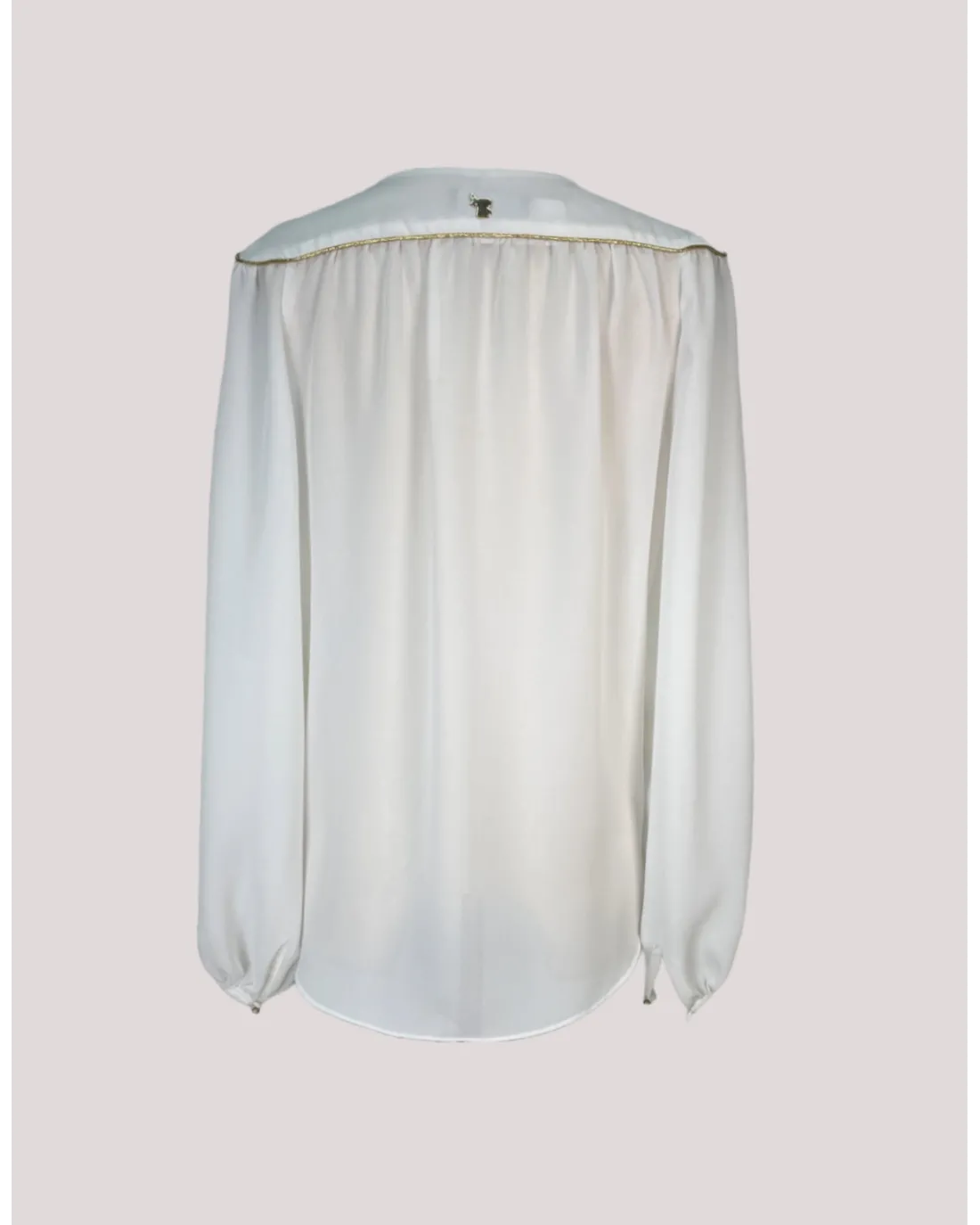 Blusa confeccionada en tejido crepé, de manga larga con escote en V y cierre con cadena dorada en el pecho.