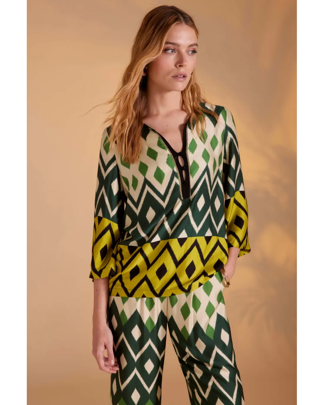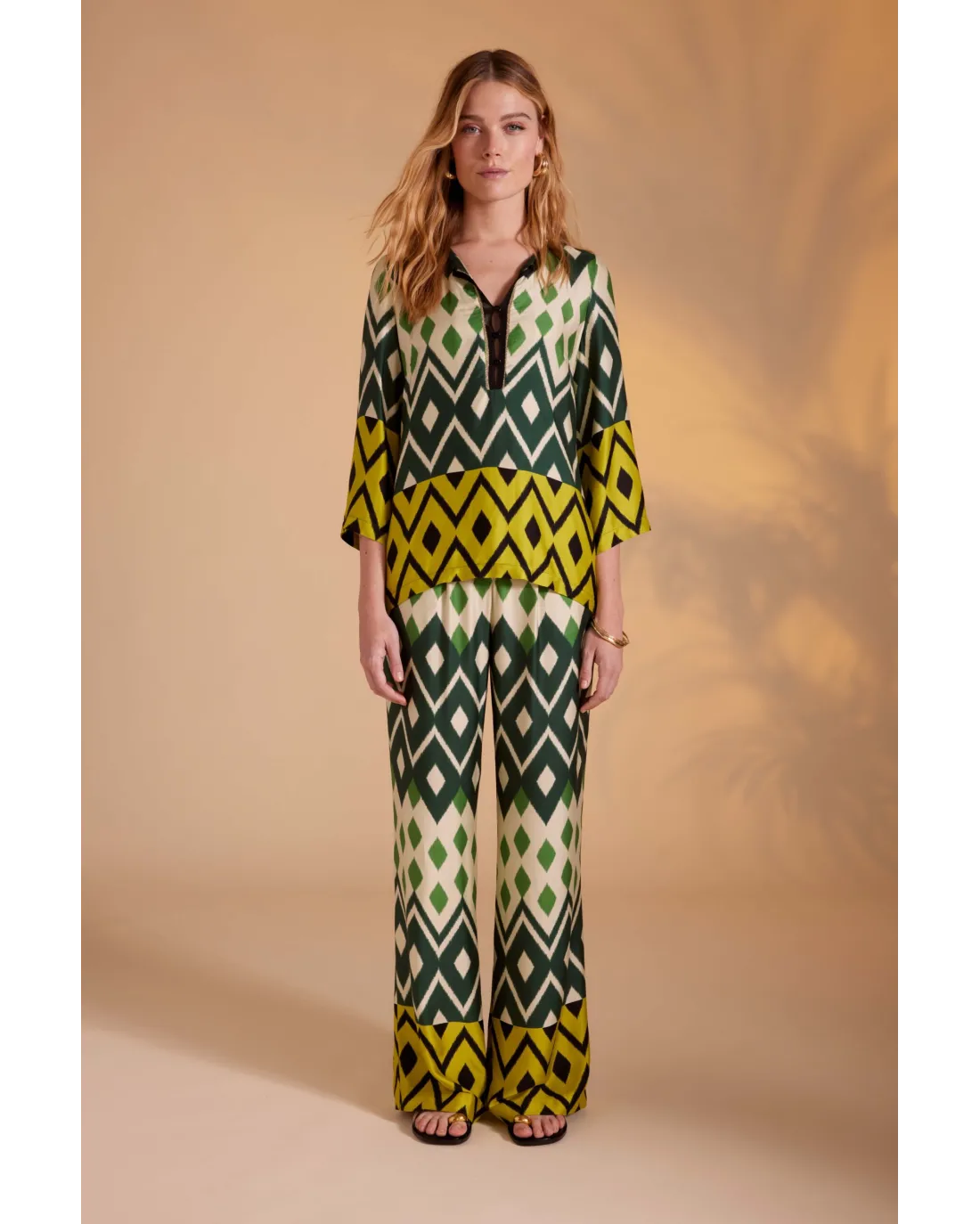 Pantalón confeccionado en un ligero tejido con estampación étnica, de corte ancho y cinturilla. Perfectos para combinar con blusa 48658.