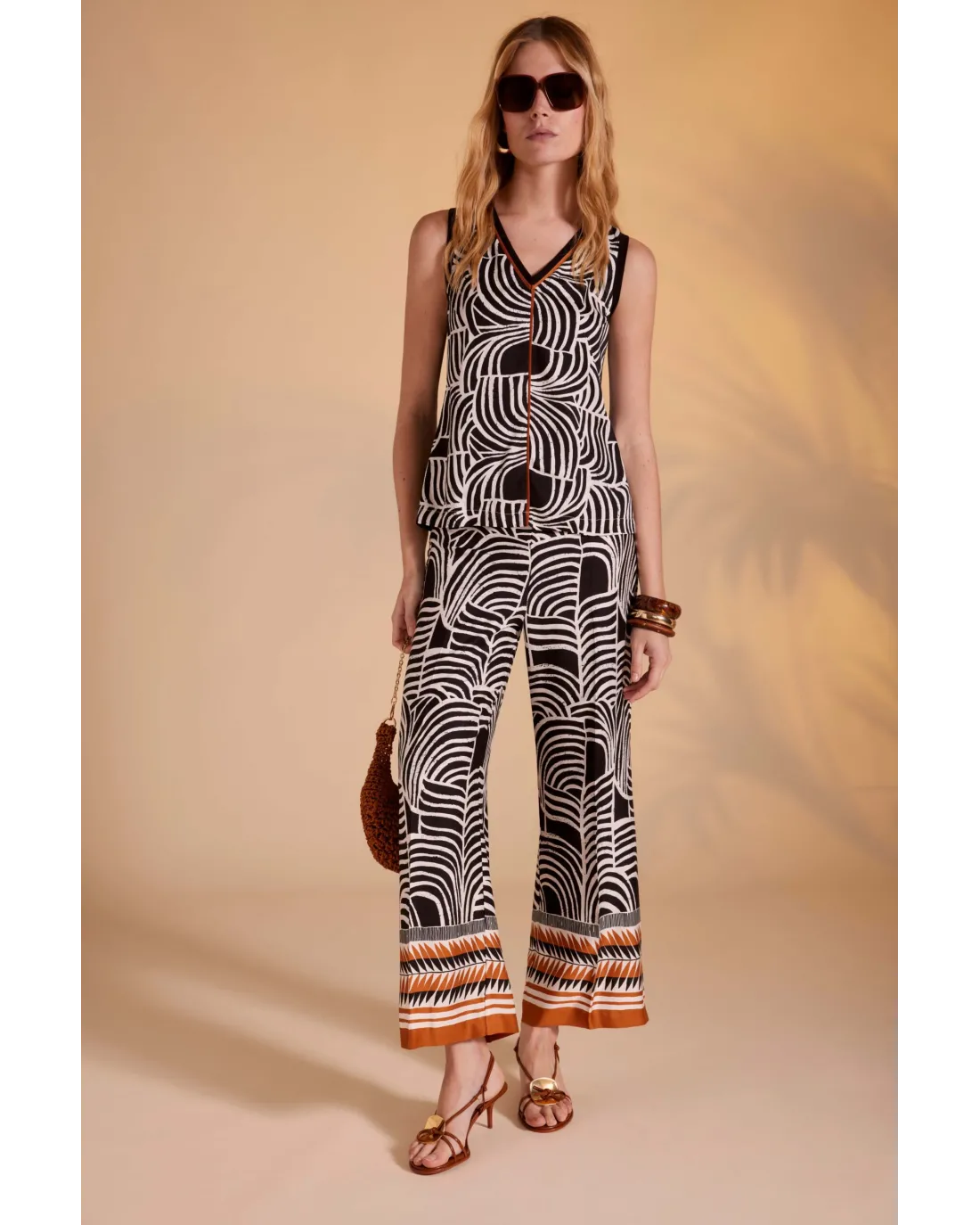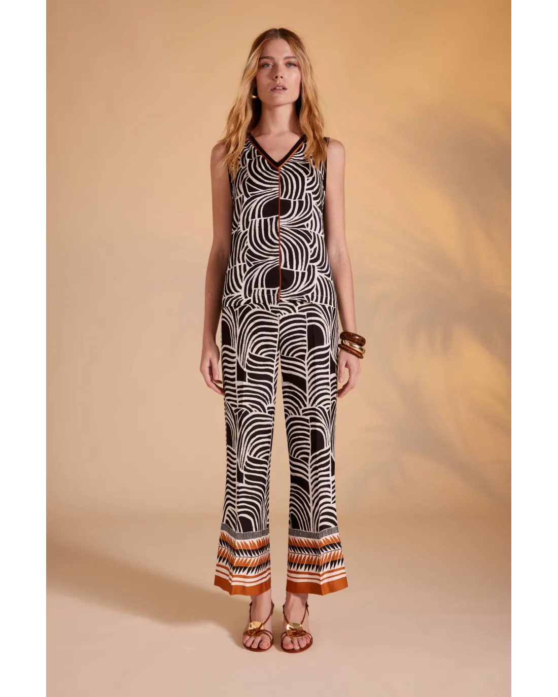 Conjunto de blusa y pantalón confeccionado en un ligero tejido con estampación de cebra. La blusa manga 3/4 con escote en V y de corte holgada. Pantalón ancho con caída acabado en zócalo de colores a contraste.