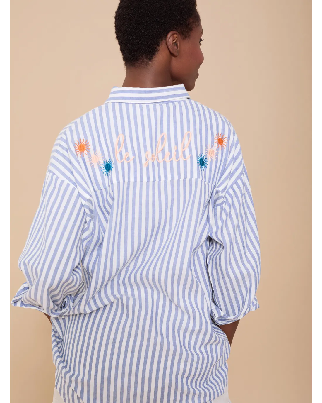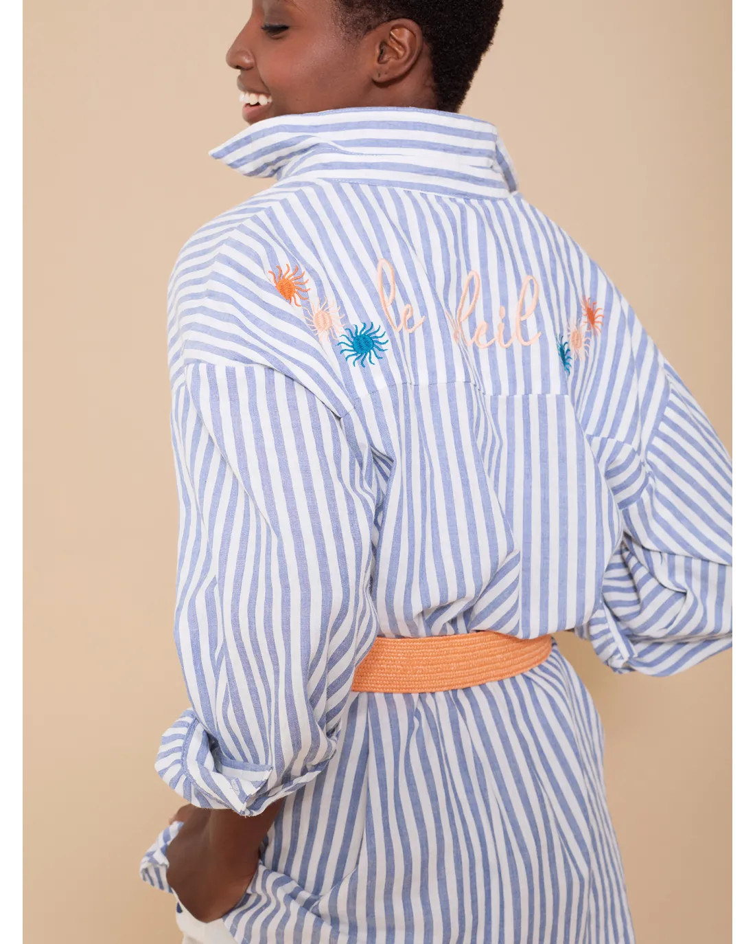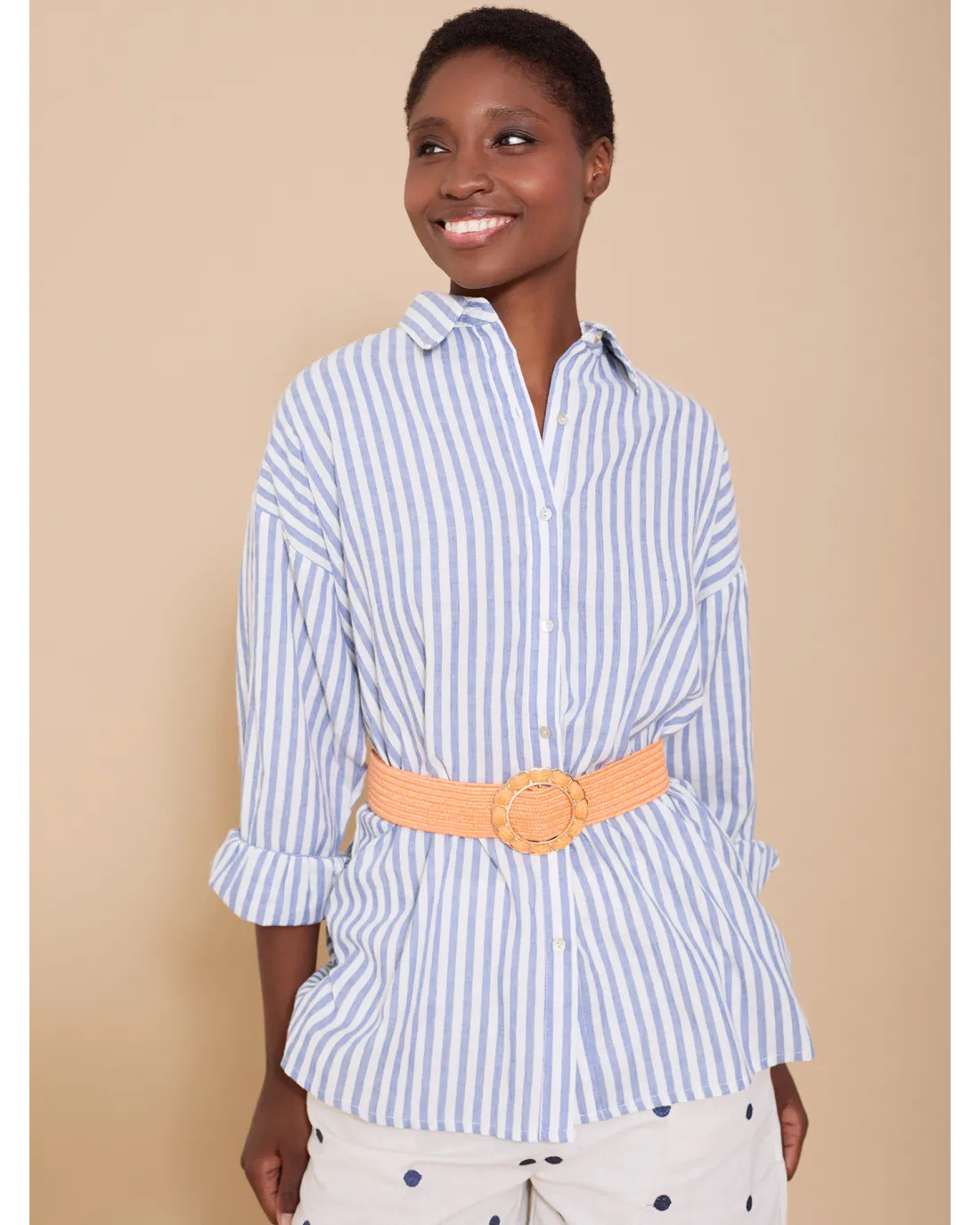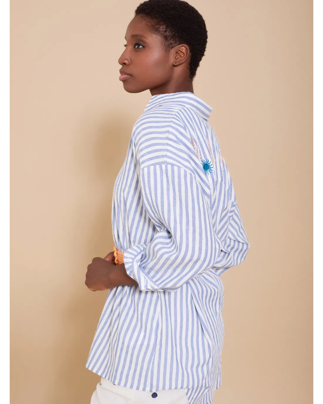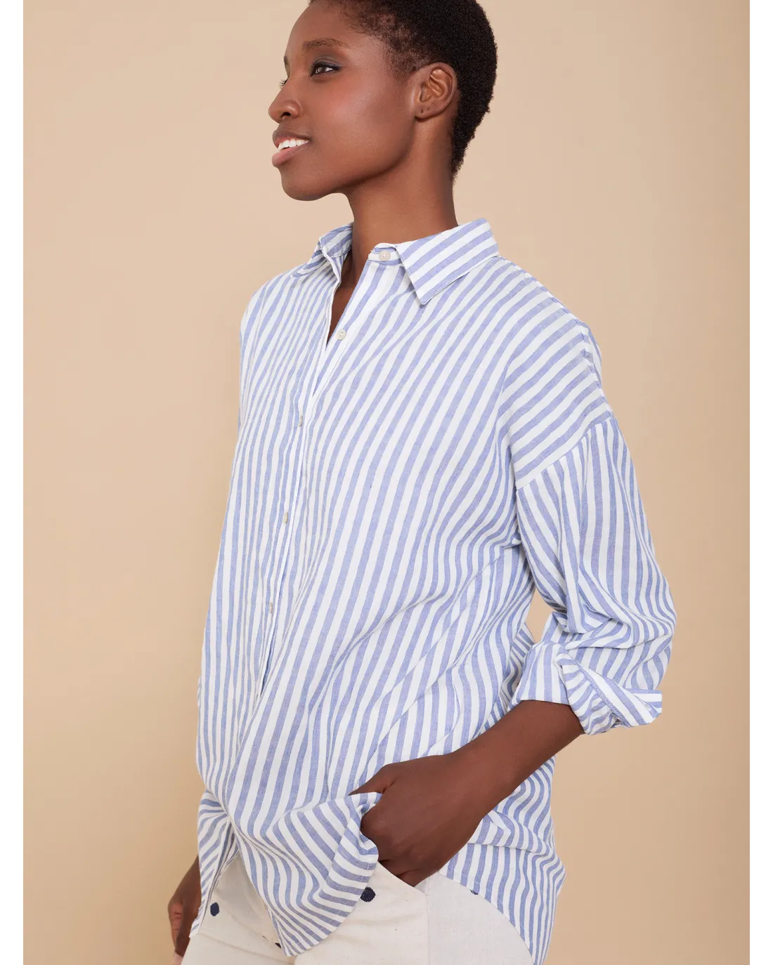 Camisa oversize de manga larga acabada en puño a rayas marino y marrón con bolsillos delanteros.