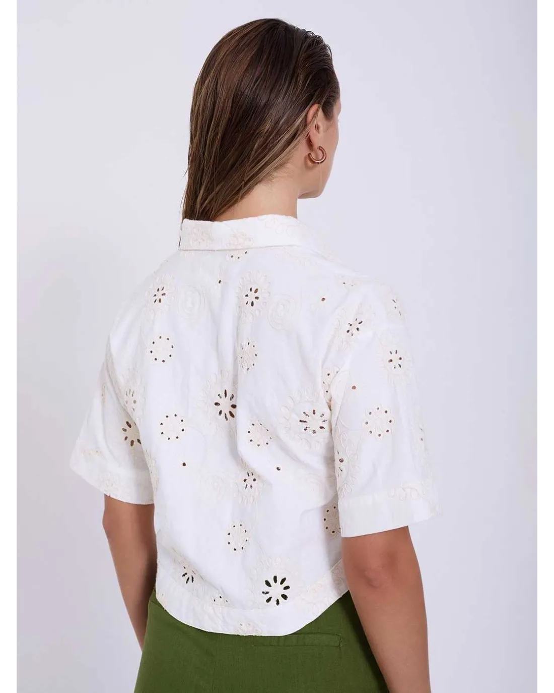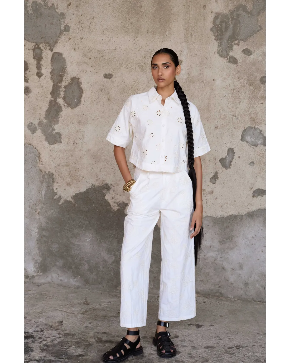 Pantalón bordado confeccionado en algodón, de corte recto con bolsillos, cinturilla con trabillas y cierre de botón y cremallera delanteros.