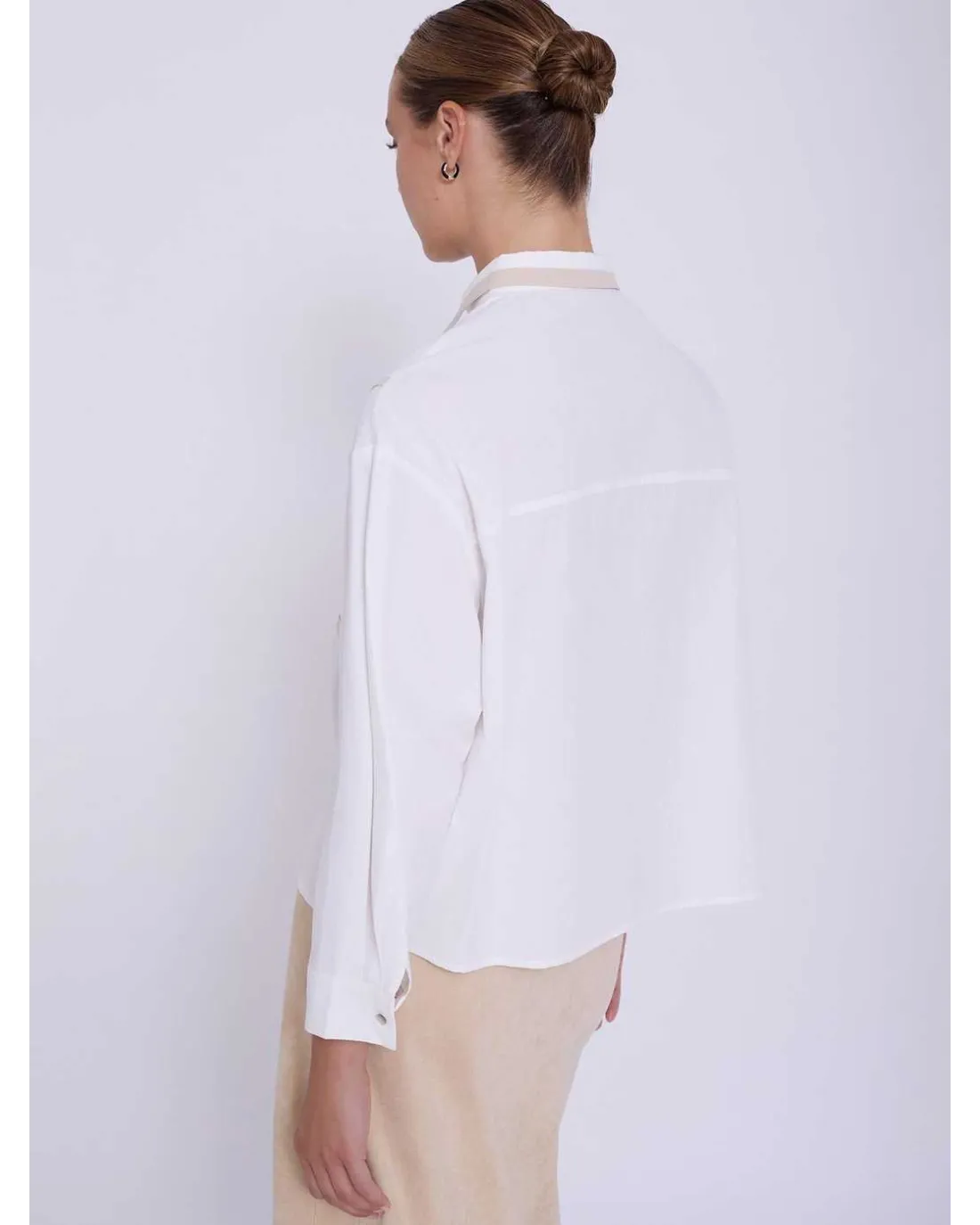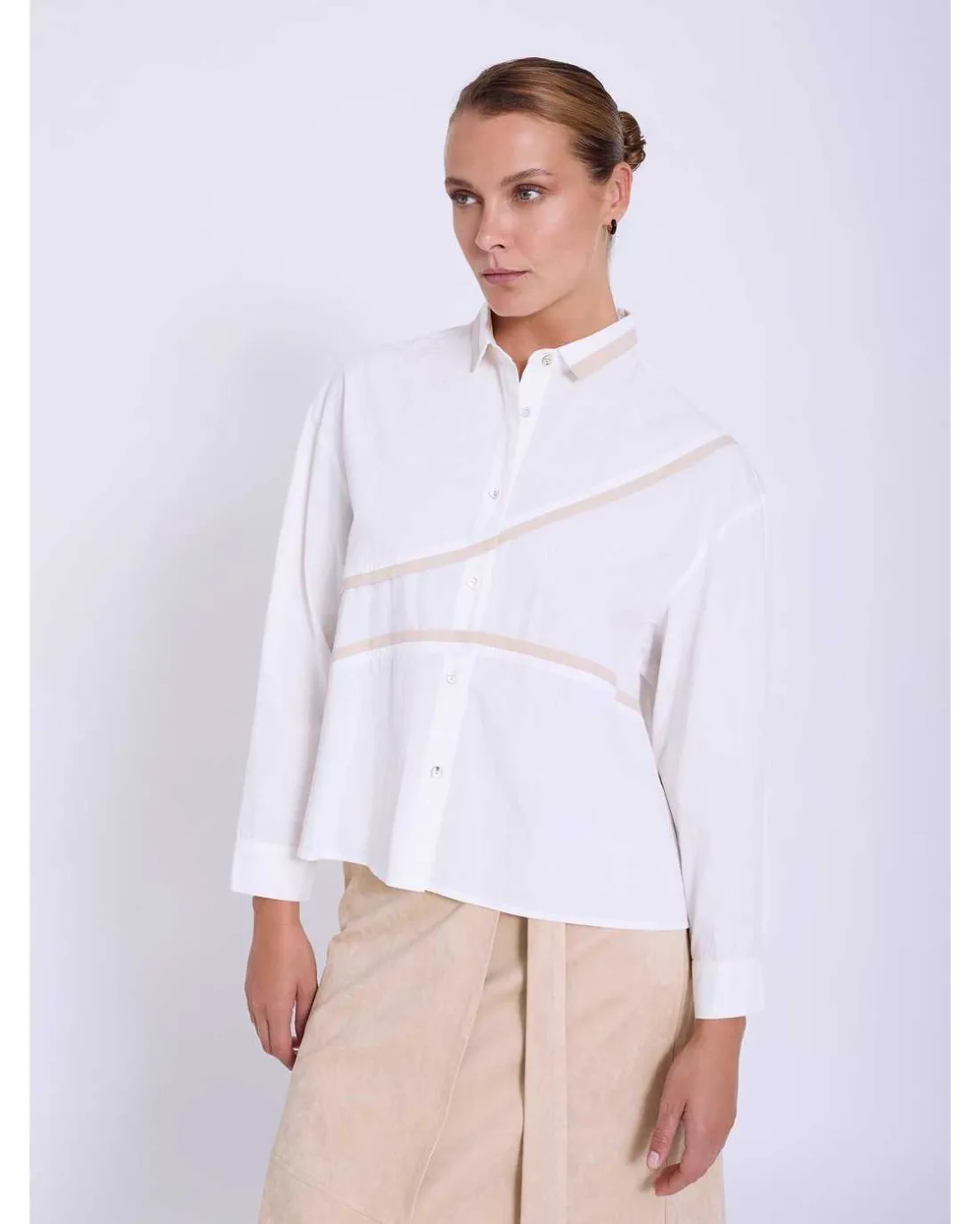 Camisa confeccionada en tejido de algodón de corte holgado con manga larga y franjas a contraste que cruzan la camisa por la parte delantera.