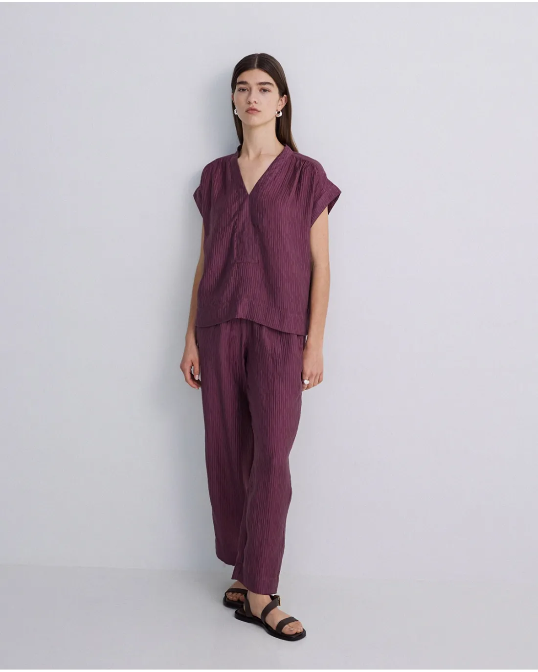 Pantalón efecto ondulado de corte wide leg con bolsillos laterales y cintura elástica fruncida.