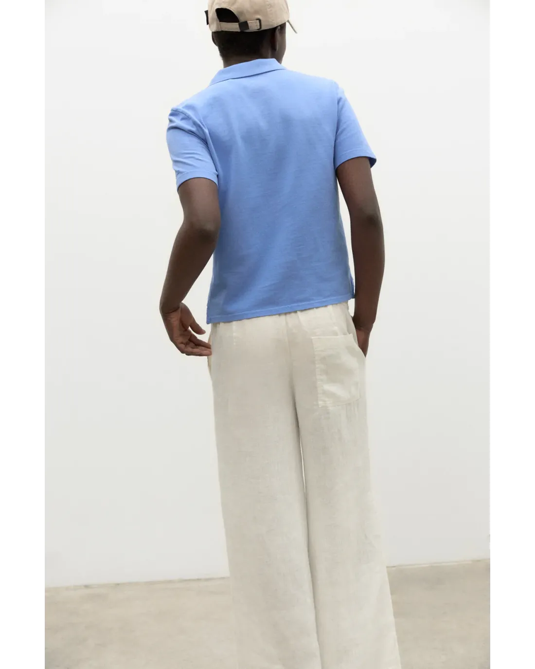 Camiseta de manga corta confeccionada en tejidos reciclados con cuello camisero y cierre de botones.