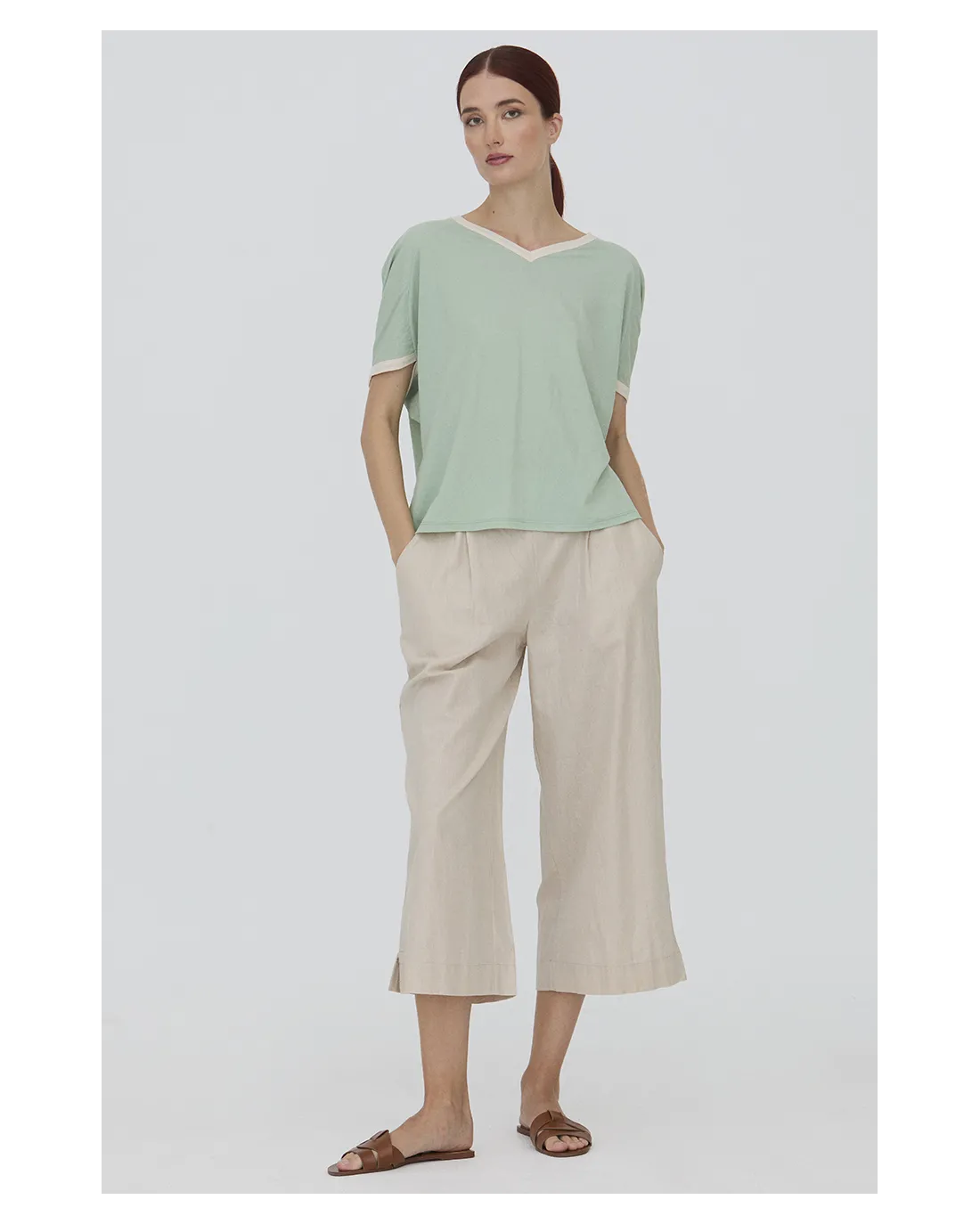 Camiseta sin mangas donde lleva un bordado, cuello redondo y de corte holgado.