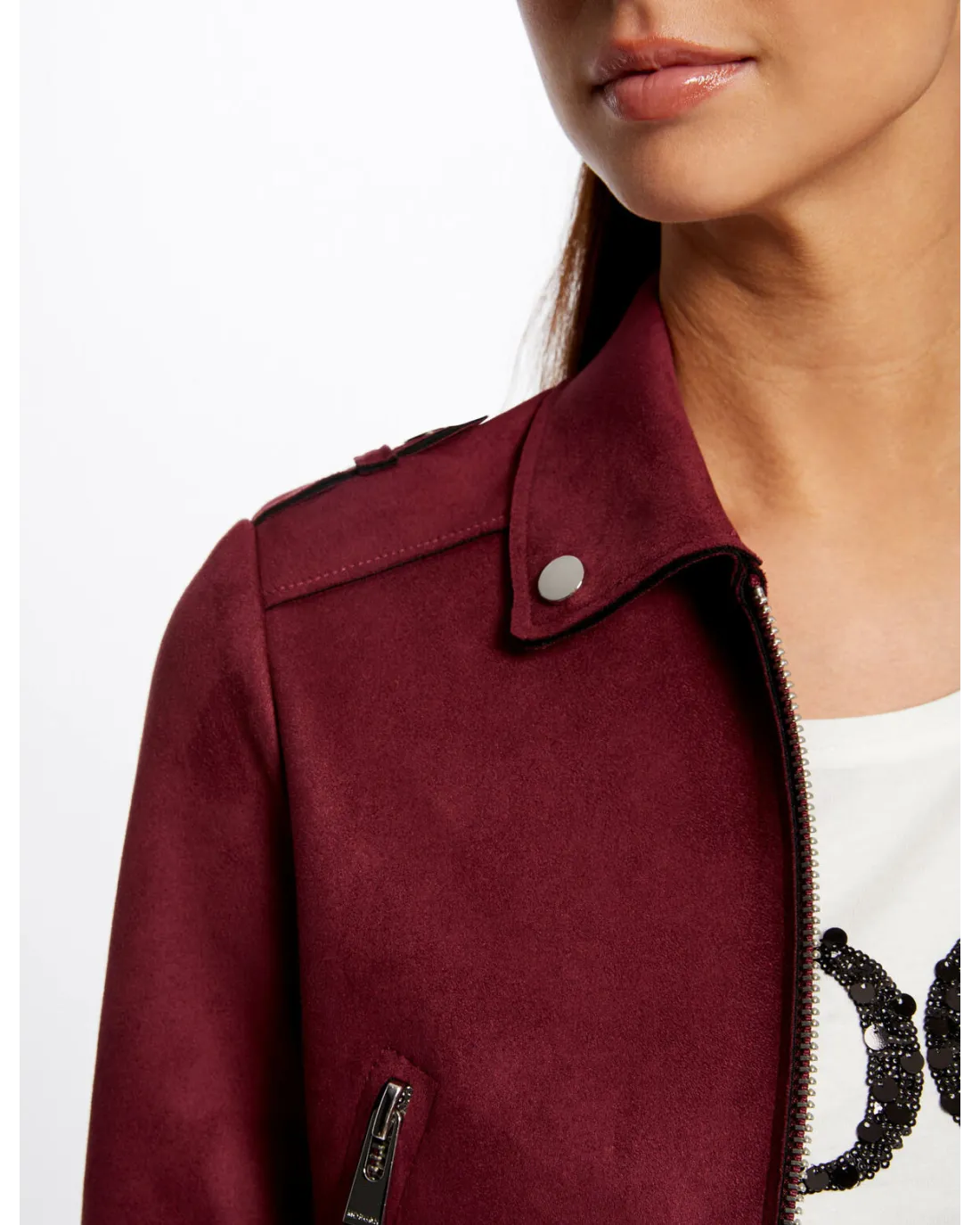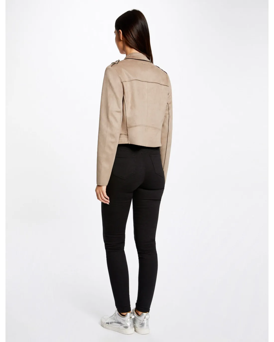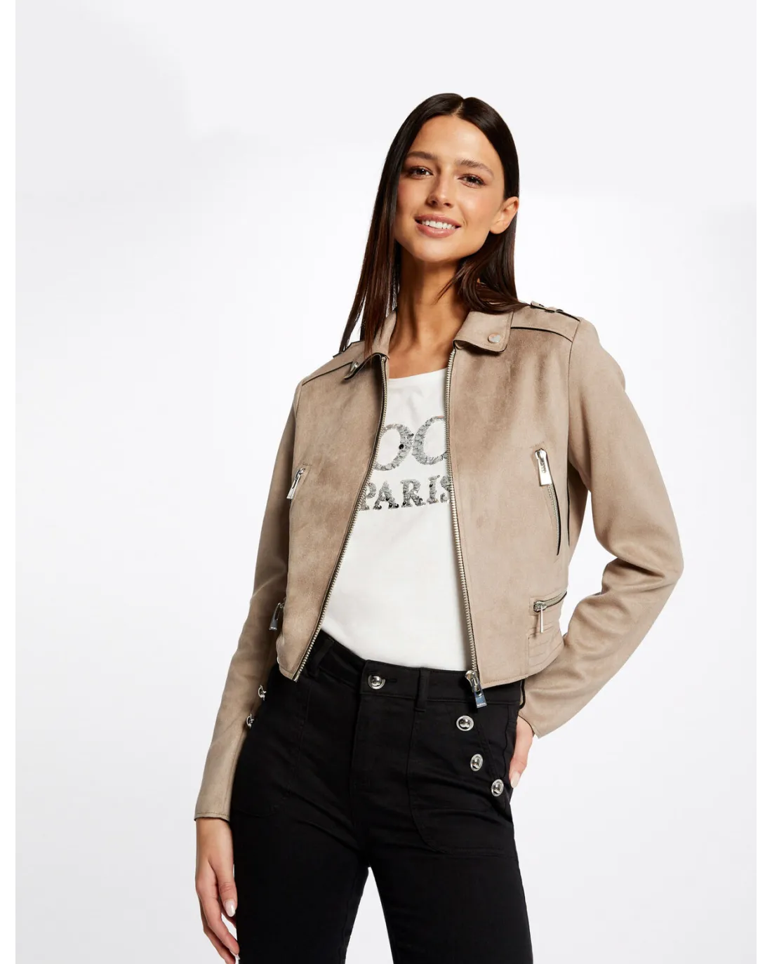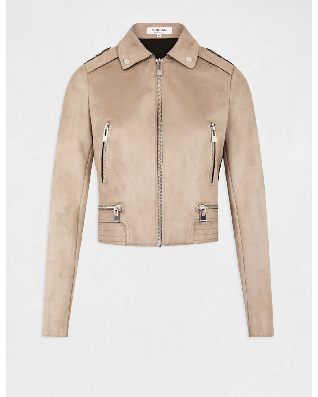 Chaqueta corta efecto antelina de manga larga con cuello de solapas y detalles de cremallera en el pecho con cierre de cremallera central.