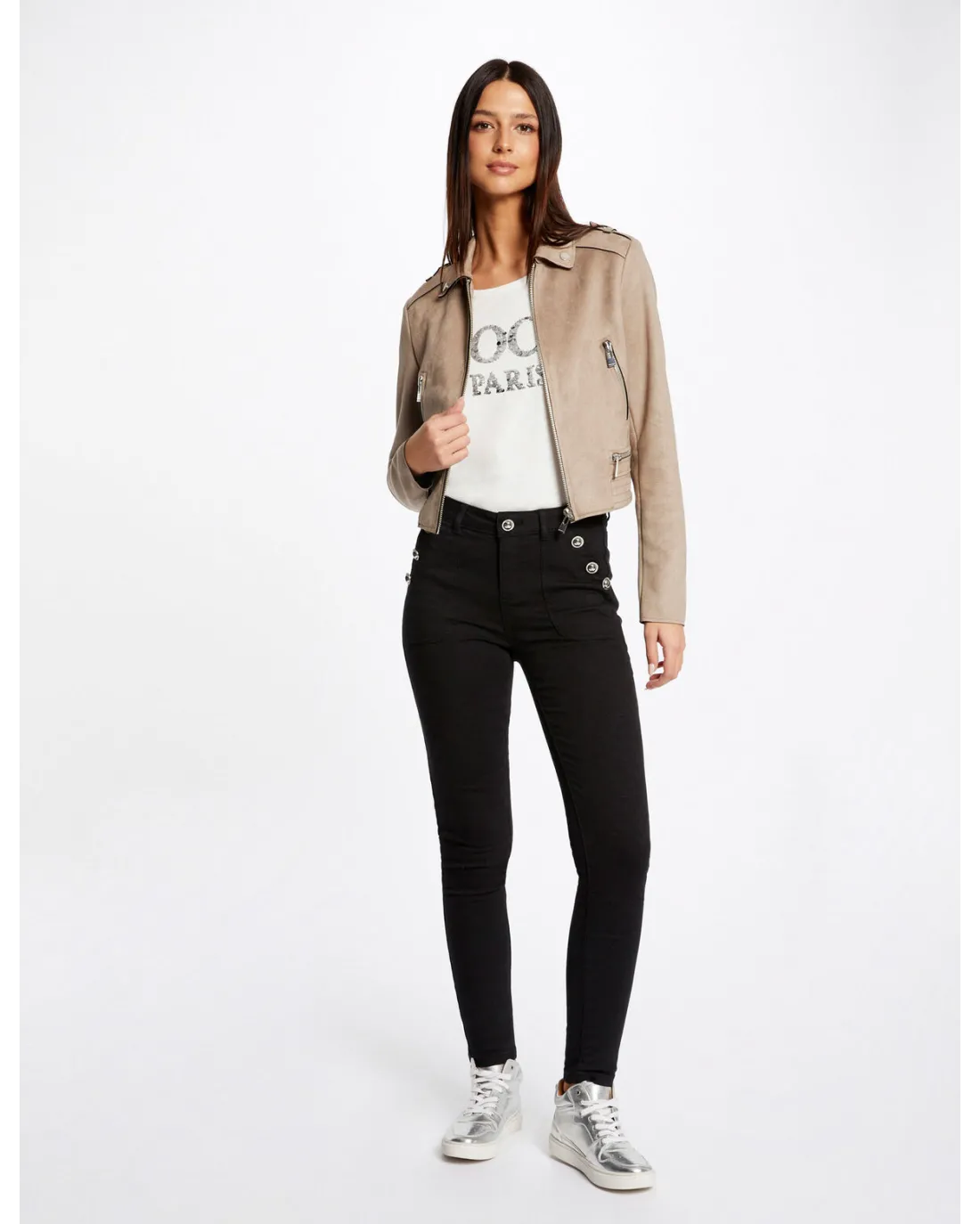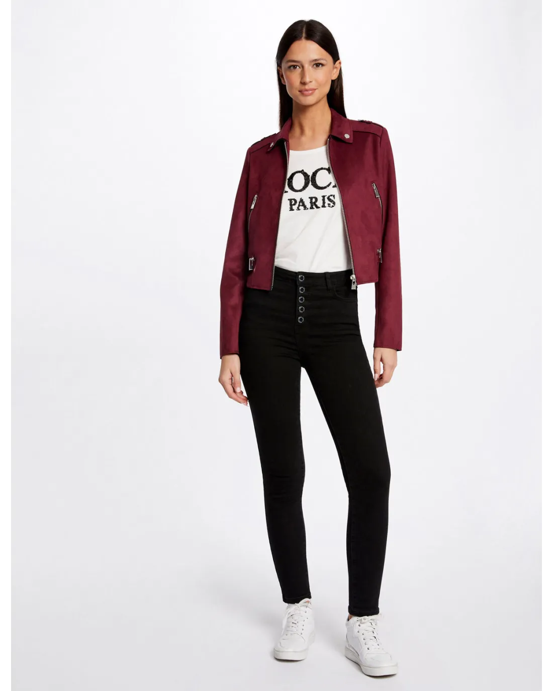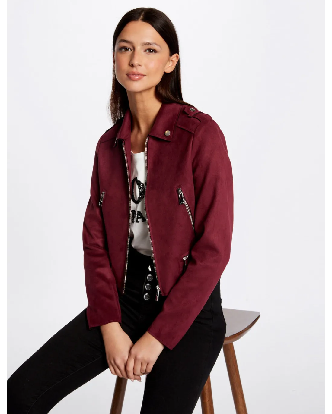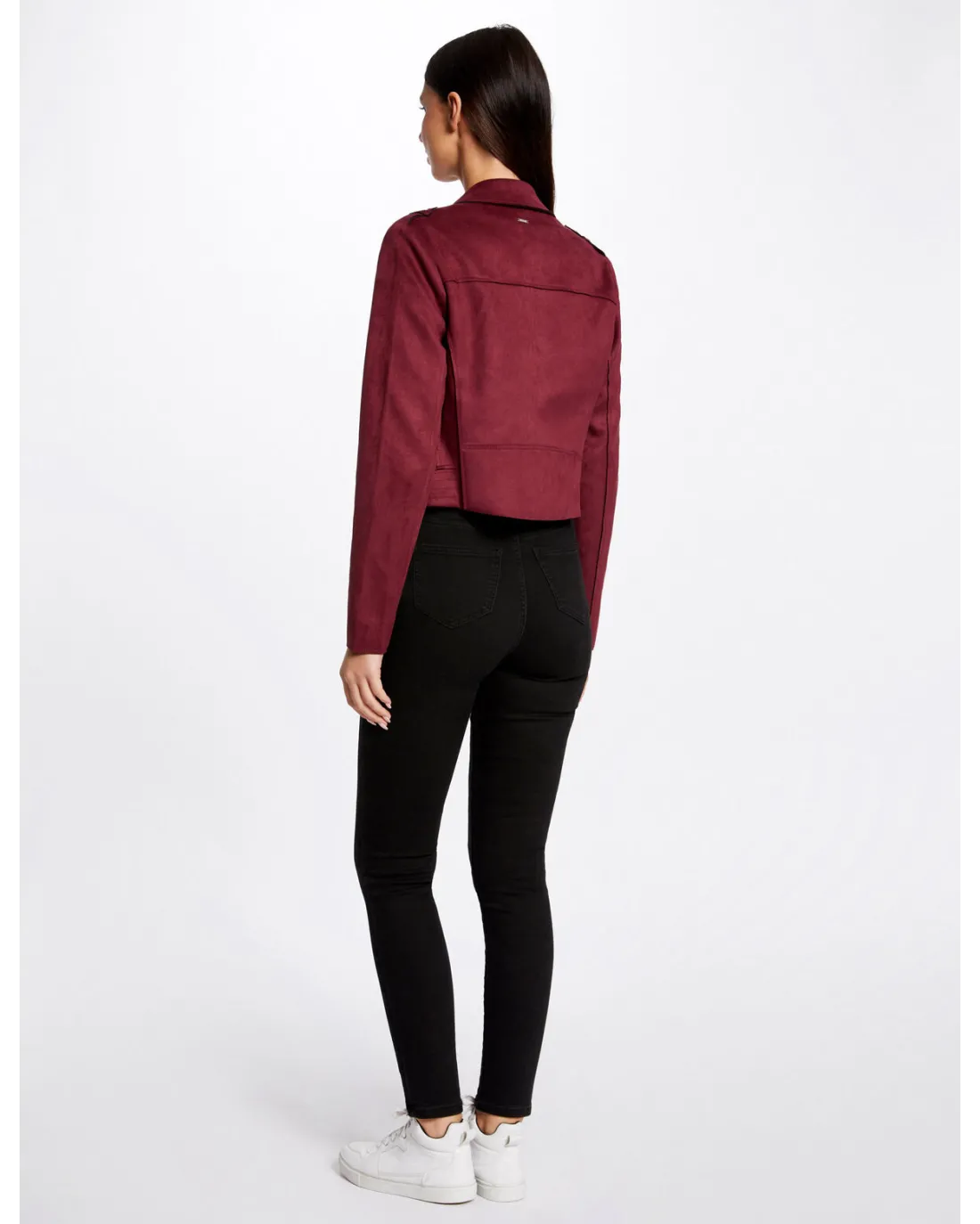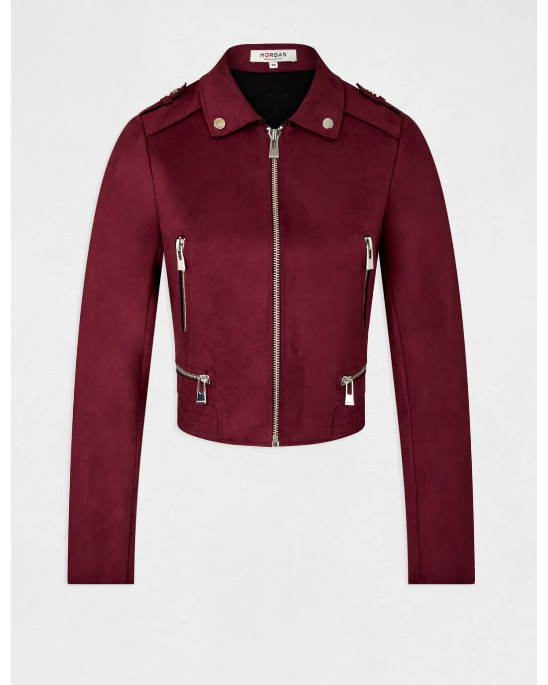 Chaqueta corta efecto antelina de manga larga con cuello de solapas y detalles de cremallera en el pecho con cierre de cremallera central.