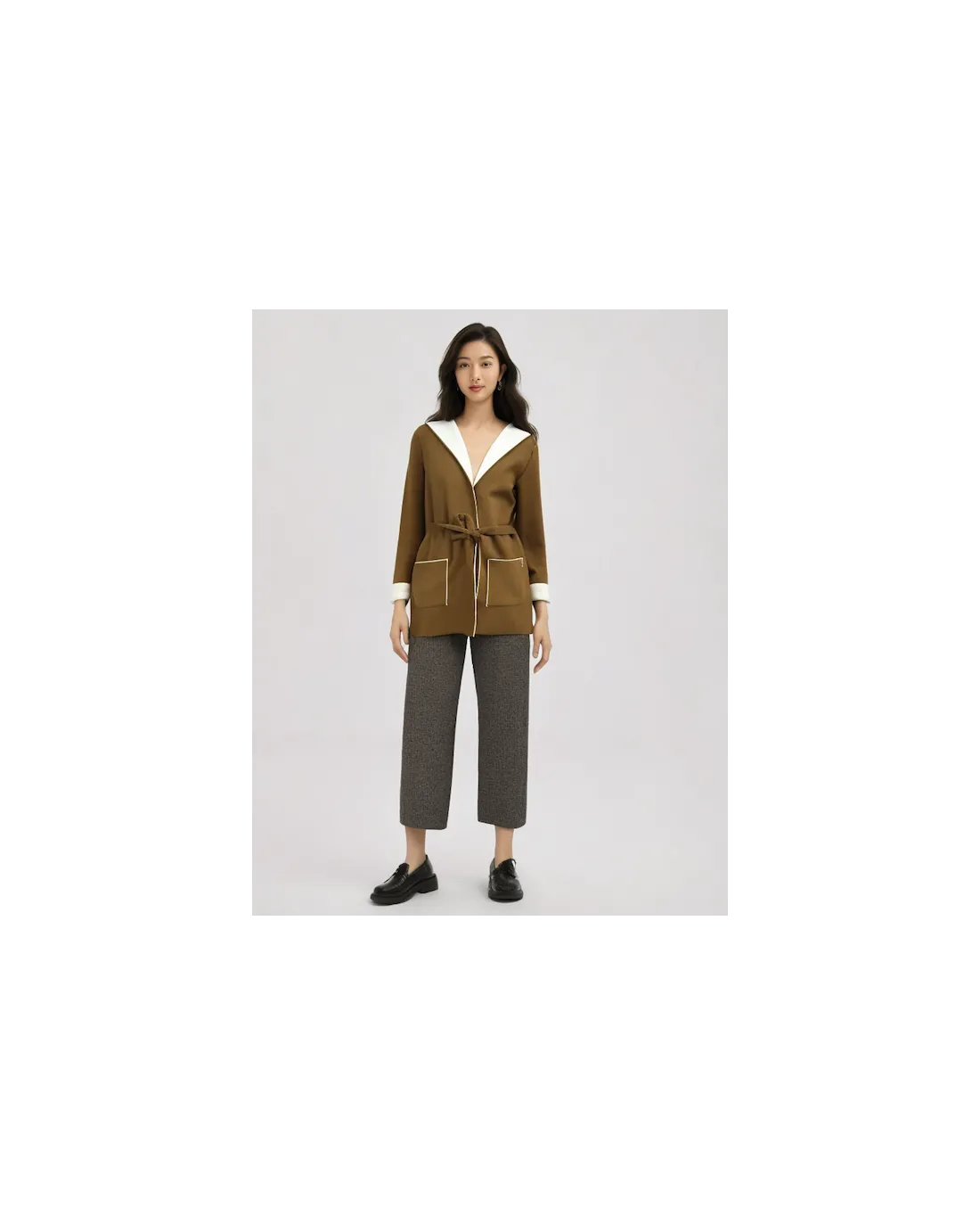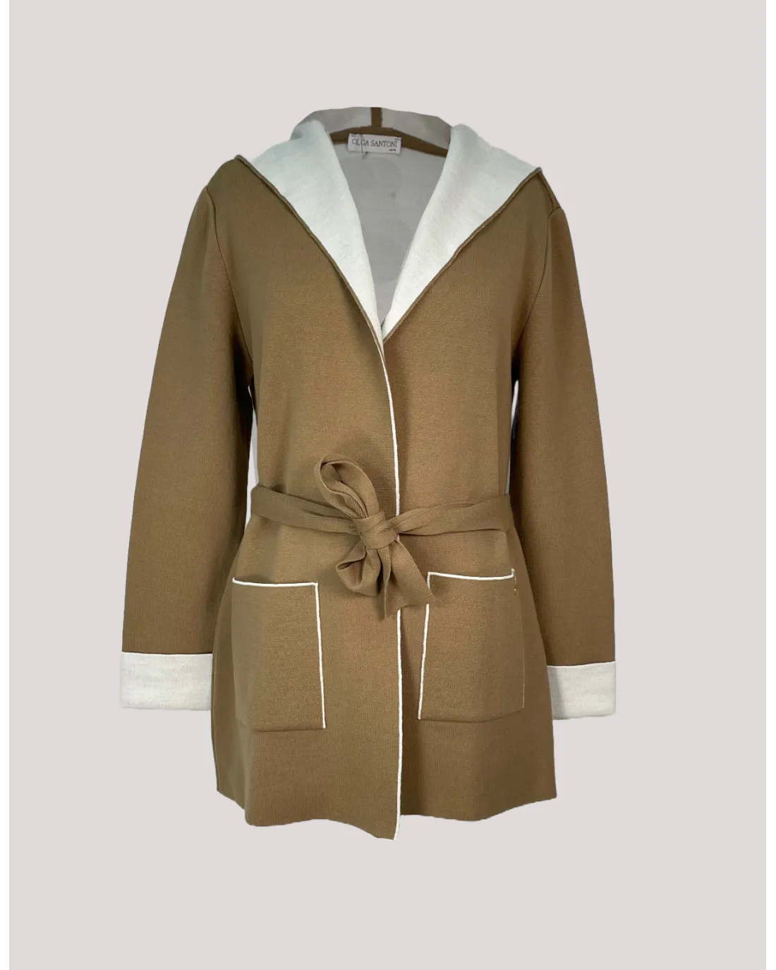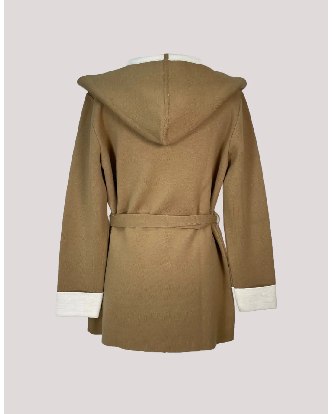 Chaqueta confeccionada de punto medio de manga larga con capucha, bolsillos frontales y lazada al tono.