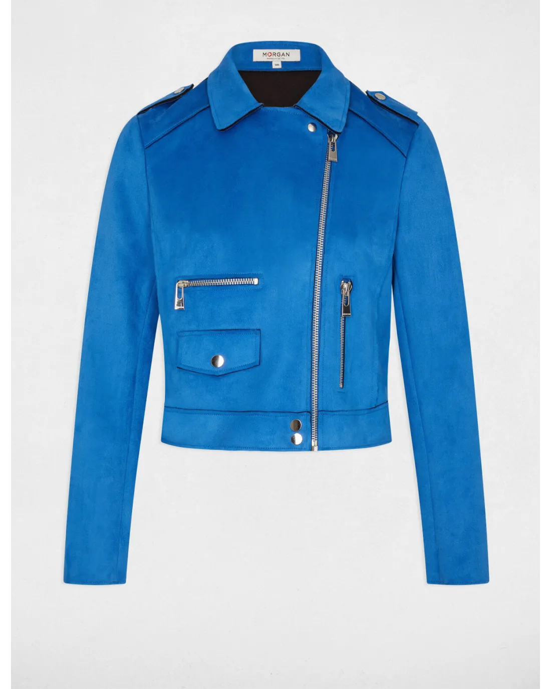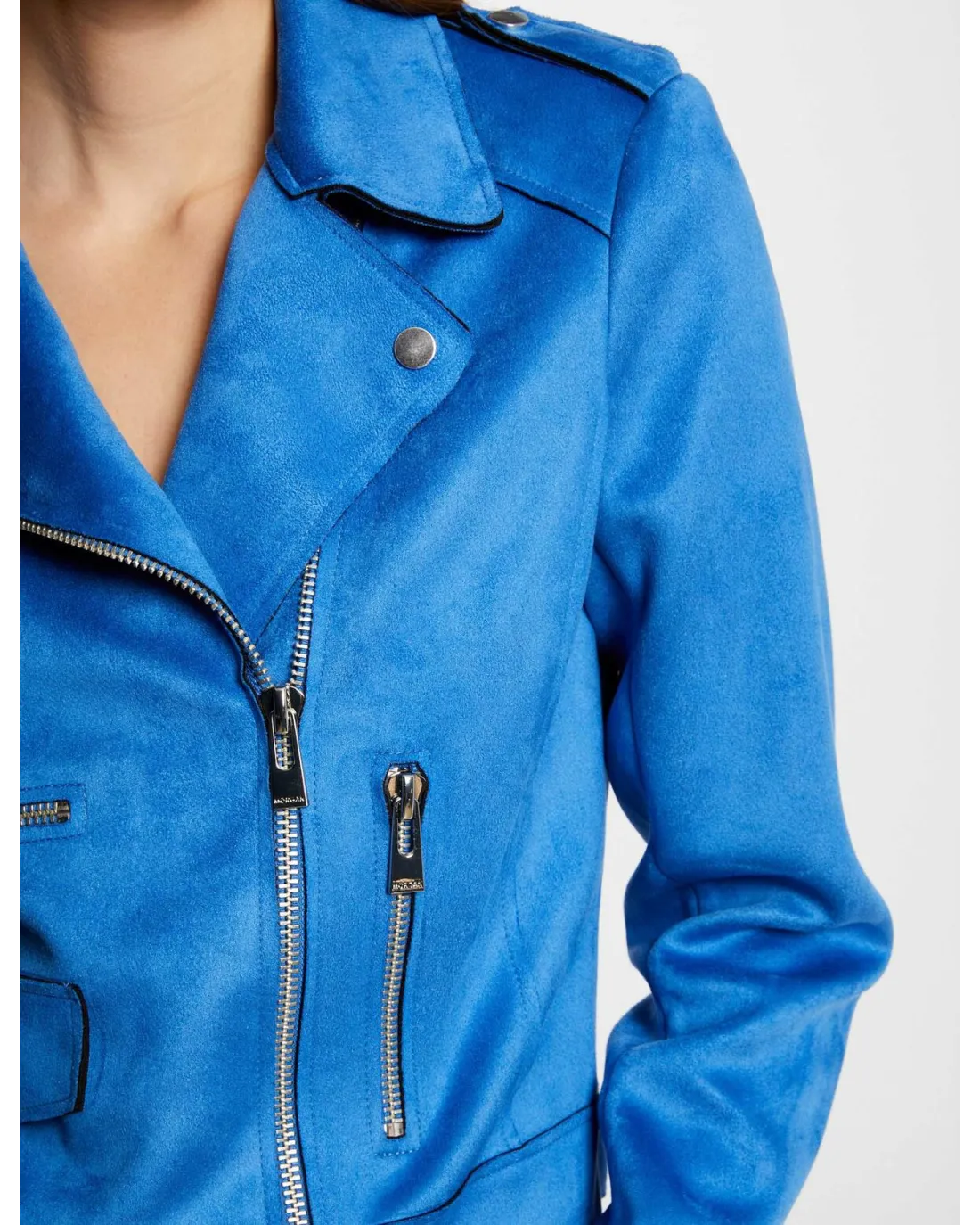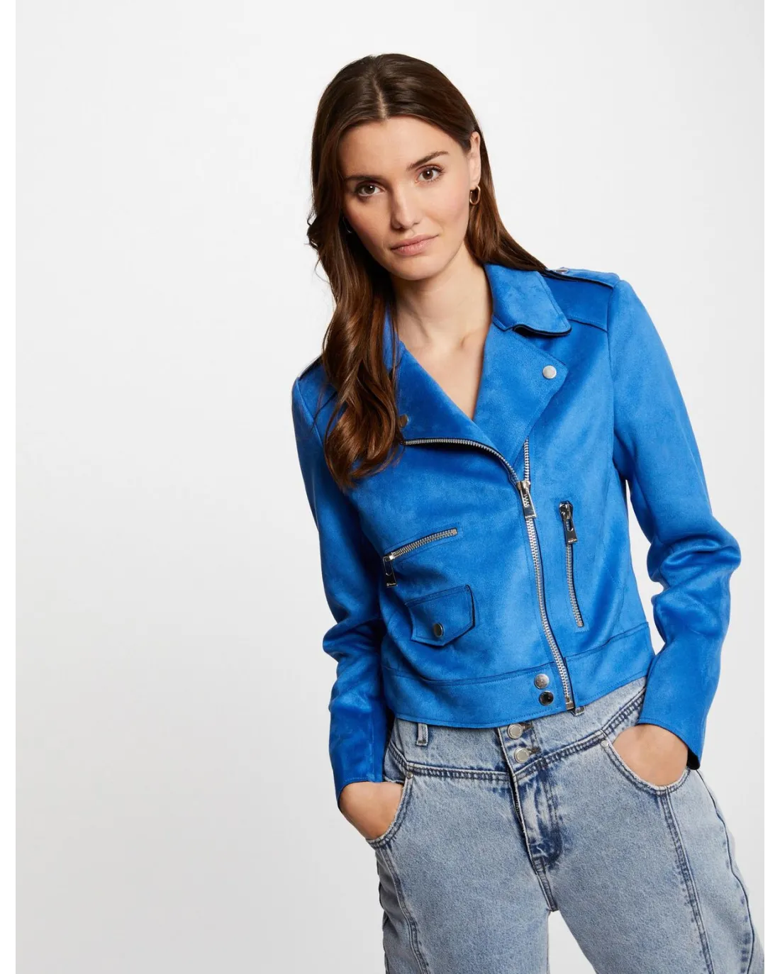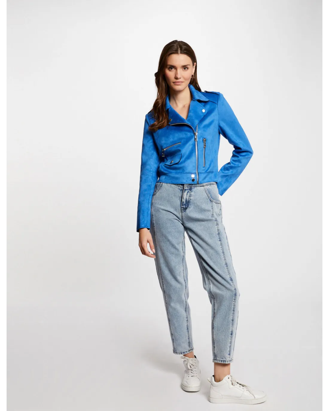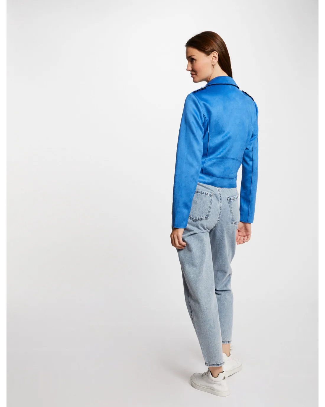 Chaqueta corta con efecto antelina, manga larga, cuello con muescas y cierre de cremallera lateral.