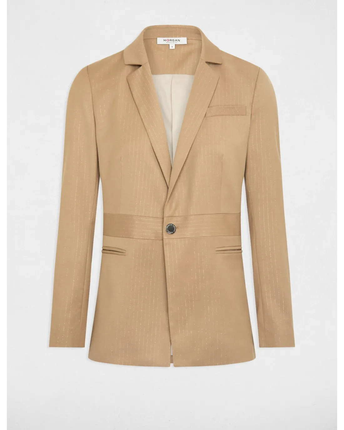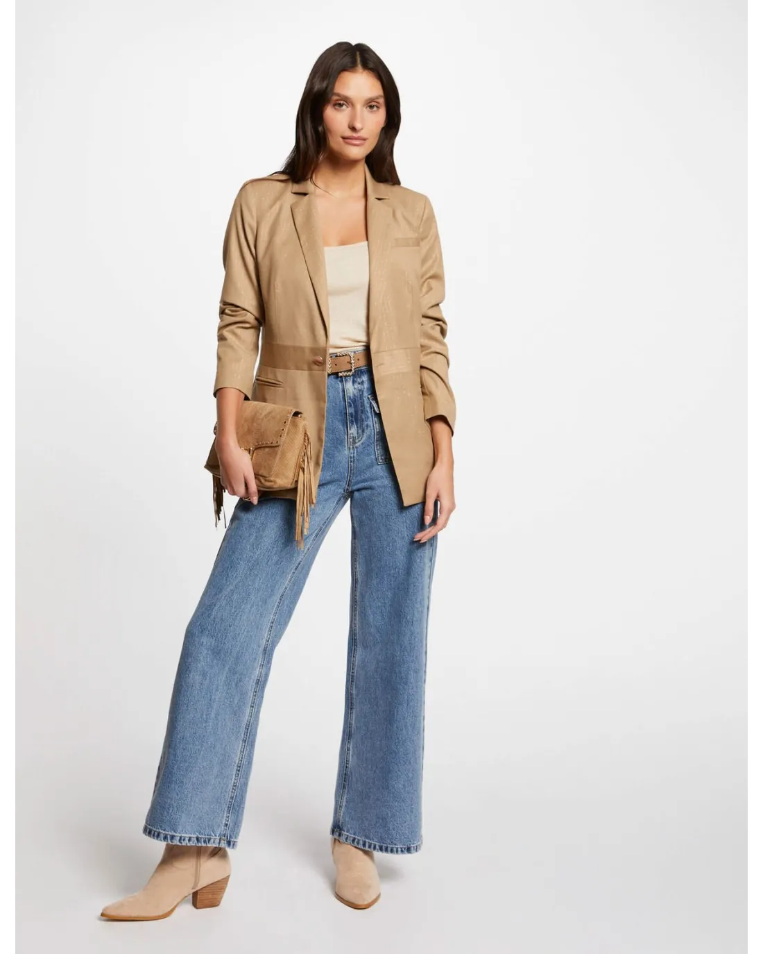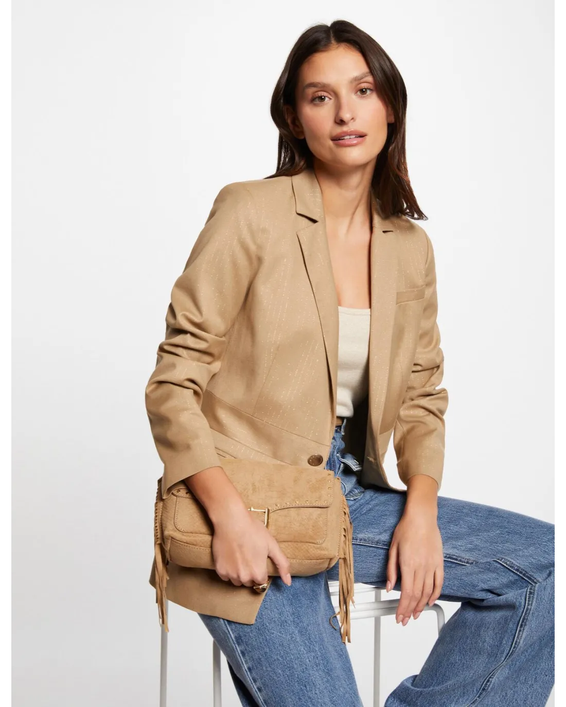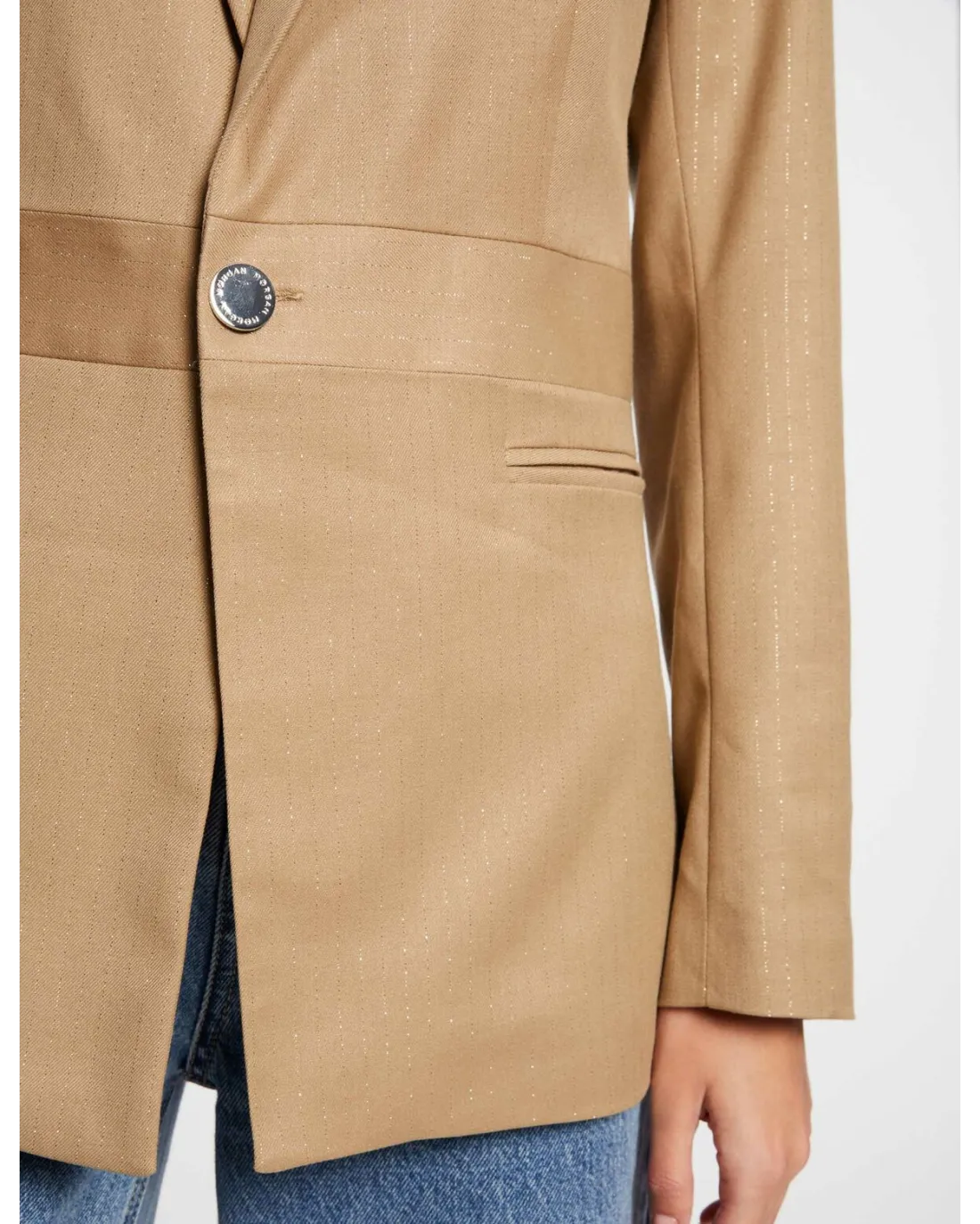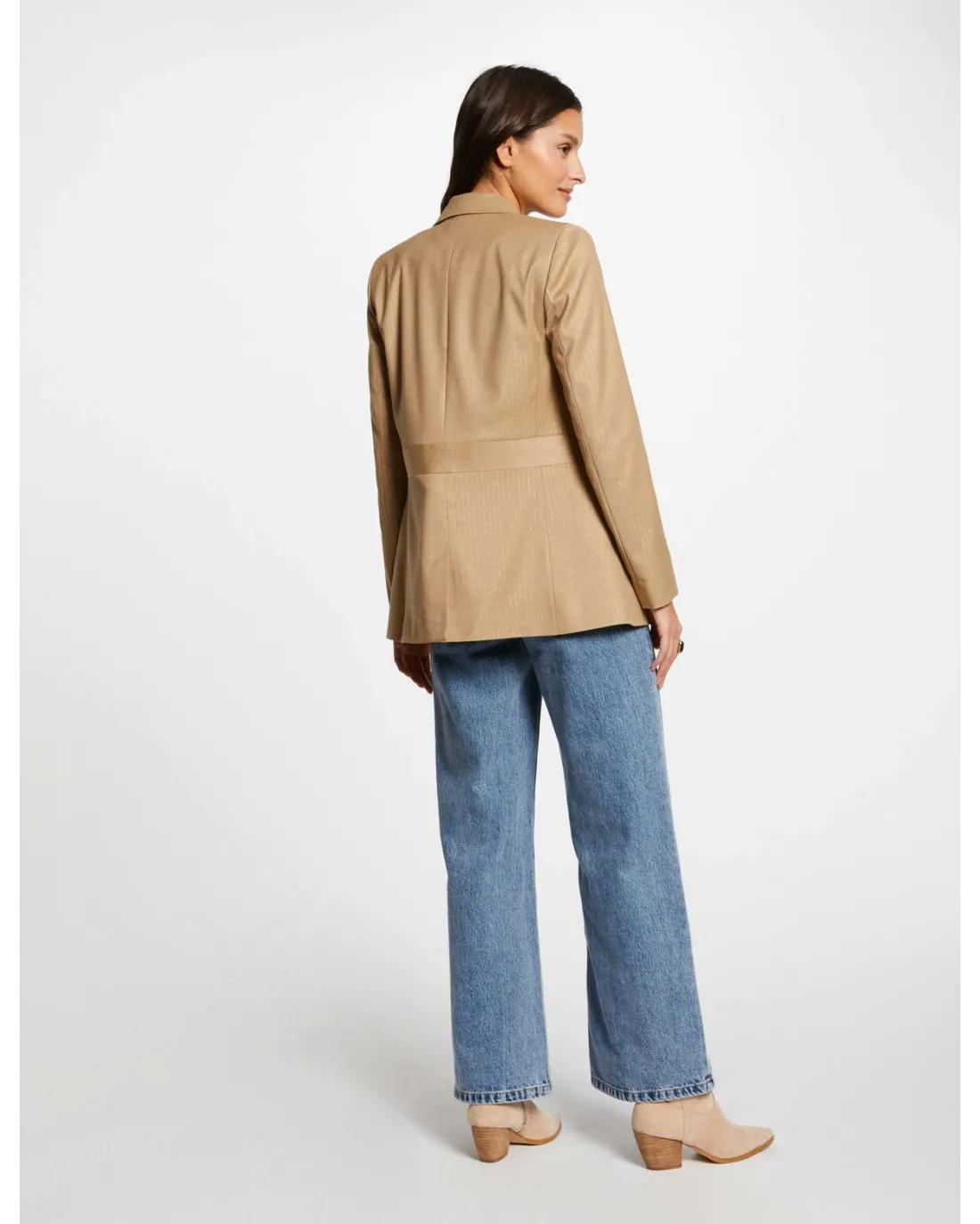 Chaqueta de corte entallado con estampado en pata de gallo, cuello con muescas, manga larga y cierre de dos botones.