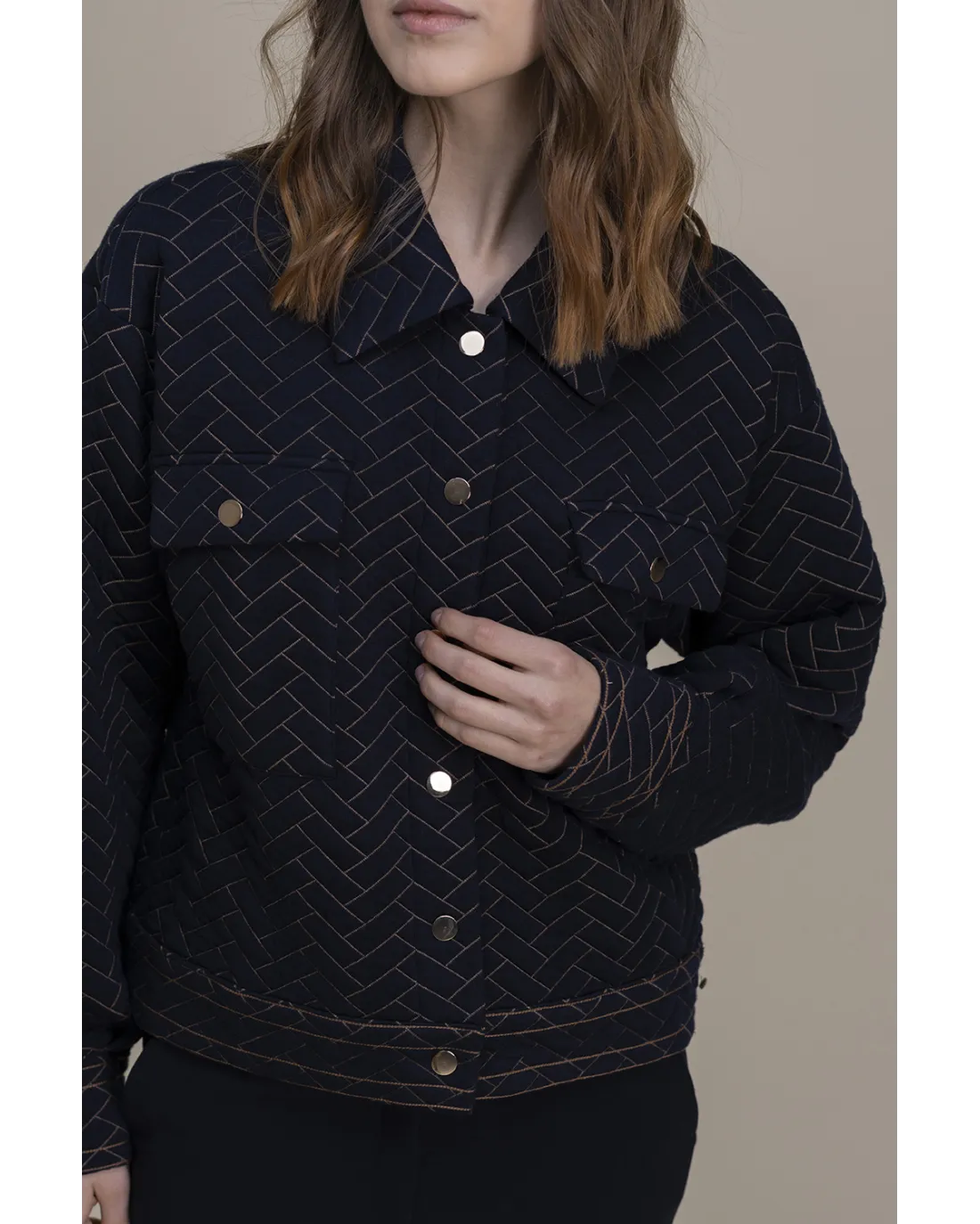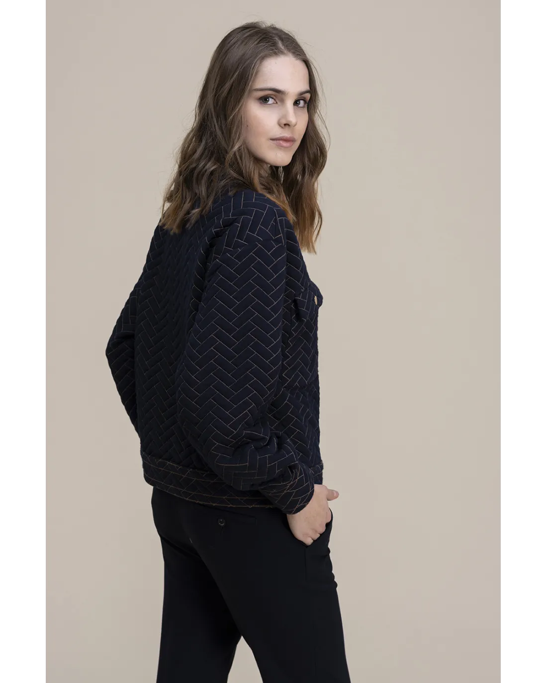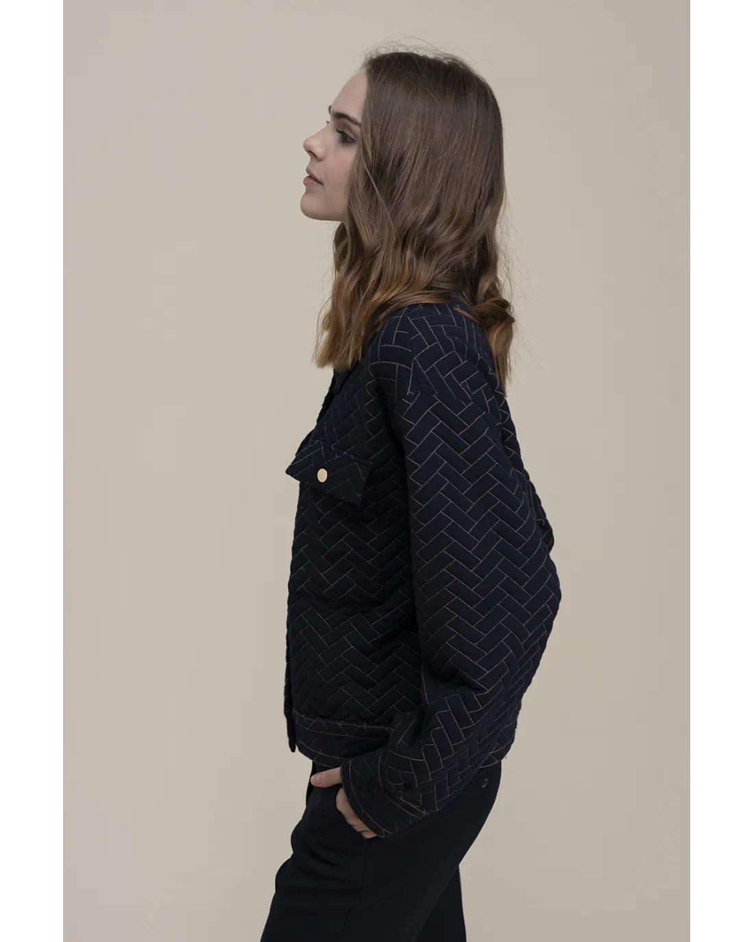Chaleco confeccionado en un punto medio con cuello redondo, botones y bolsillos centrales.