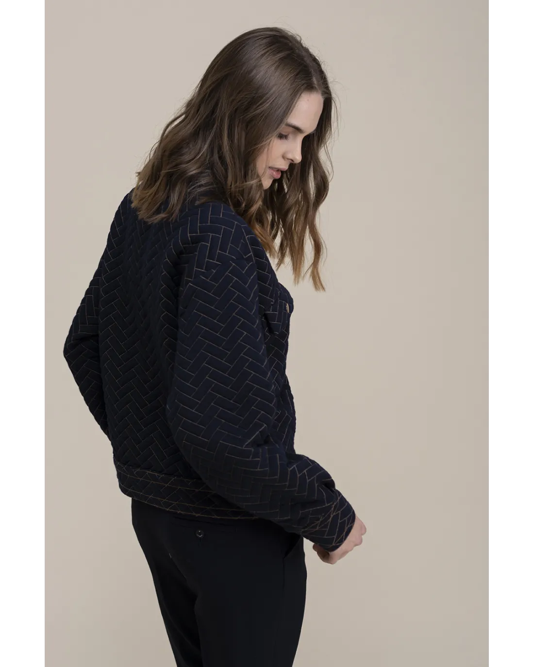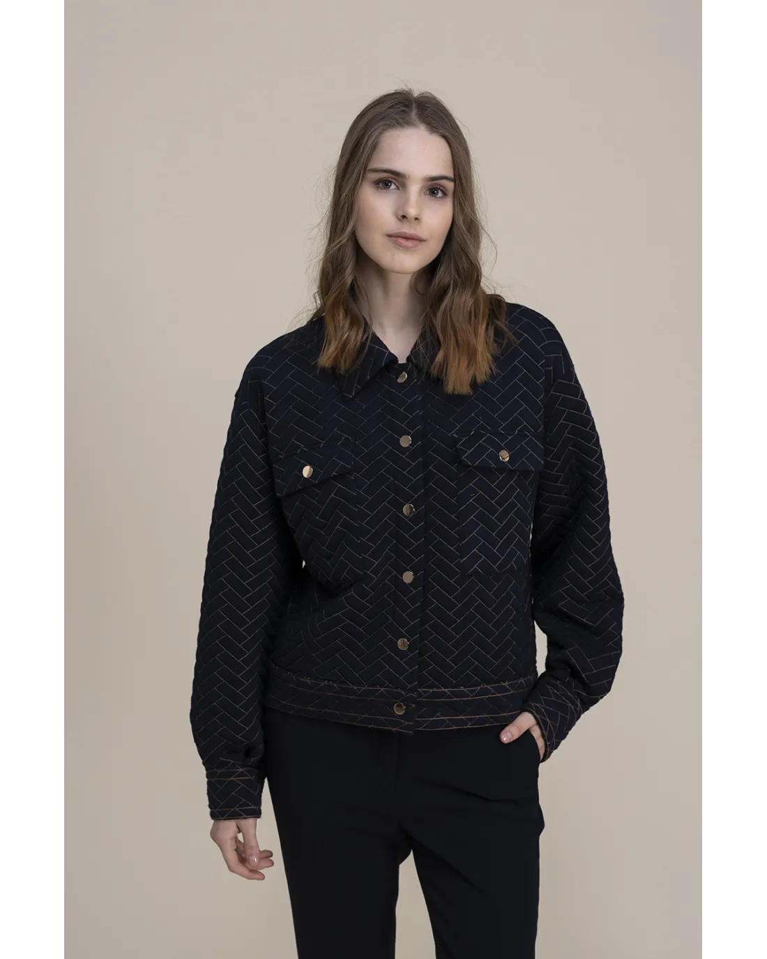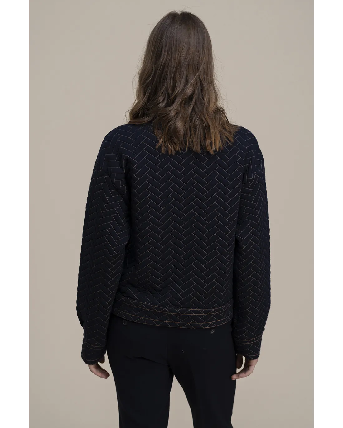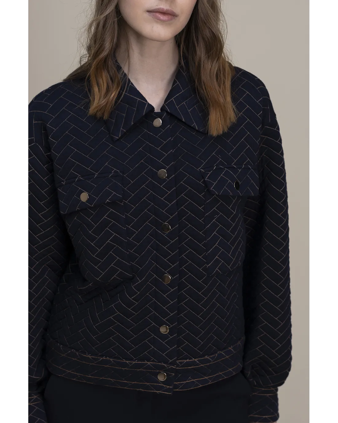 Chaleco confeccionado en un punto medio con cuello redondo, botones y bolsillos centrales.
