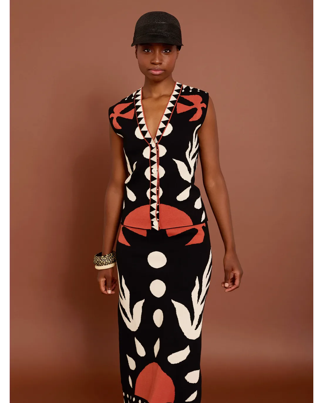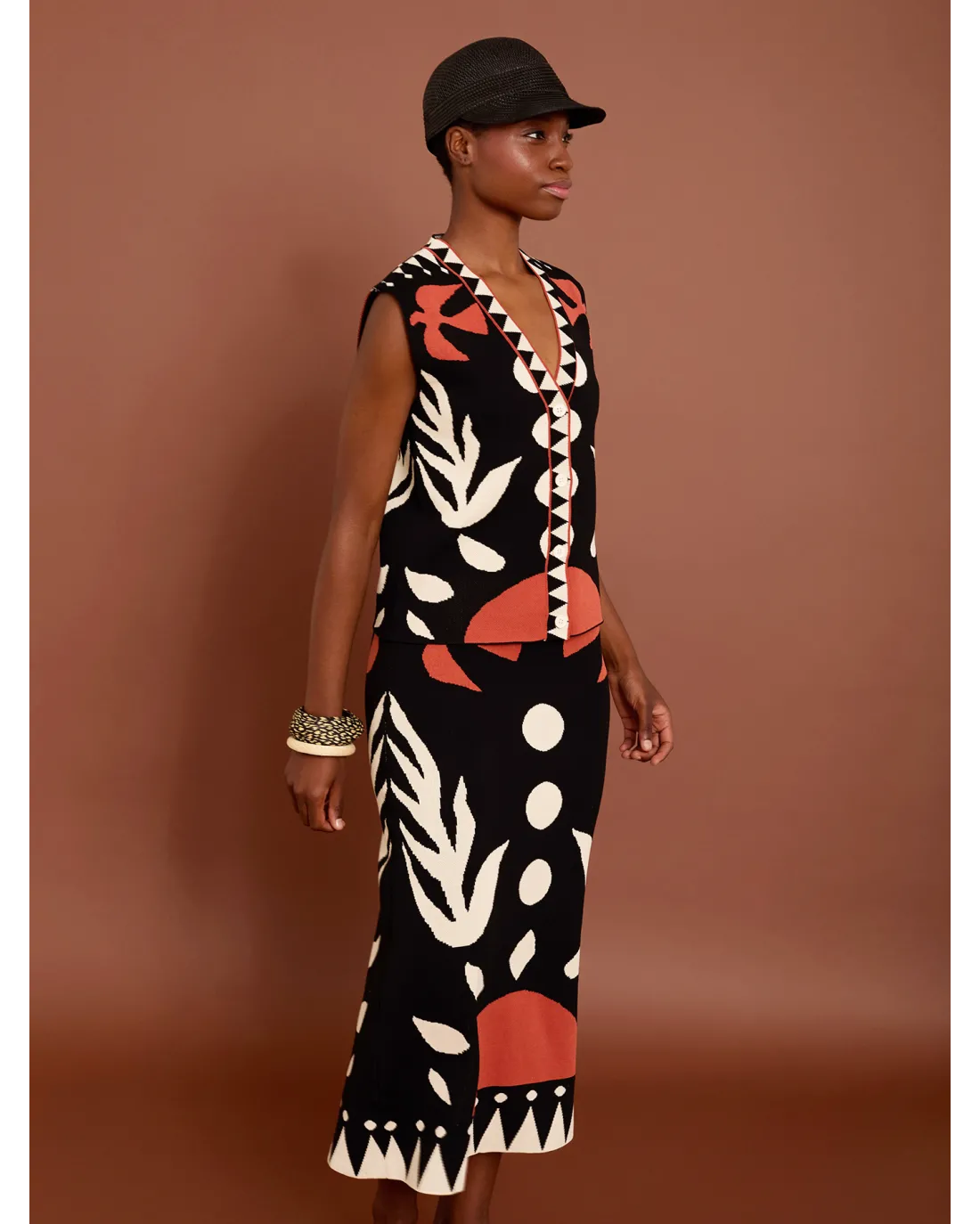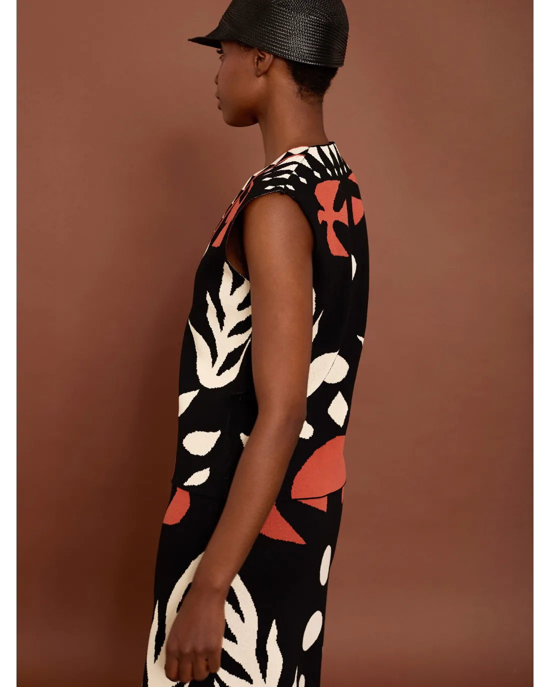 Chaleco confeccionado en tejido de punto medio con estampado étnico. Perfecto para combinar con falda M90F05CEM.