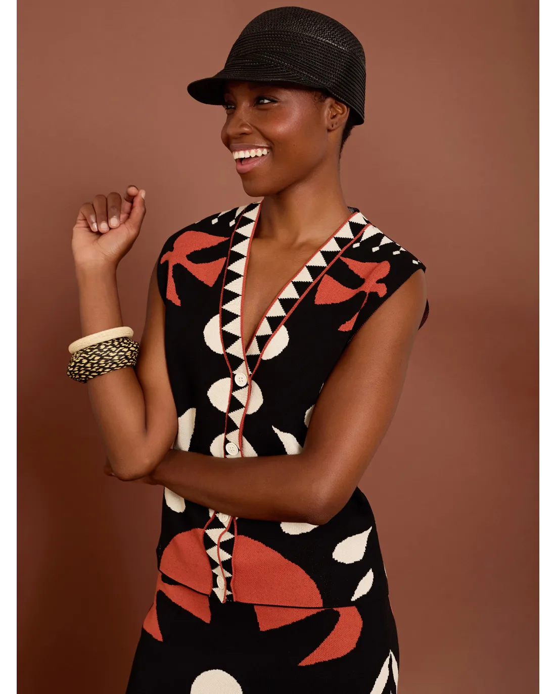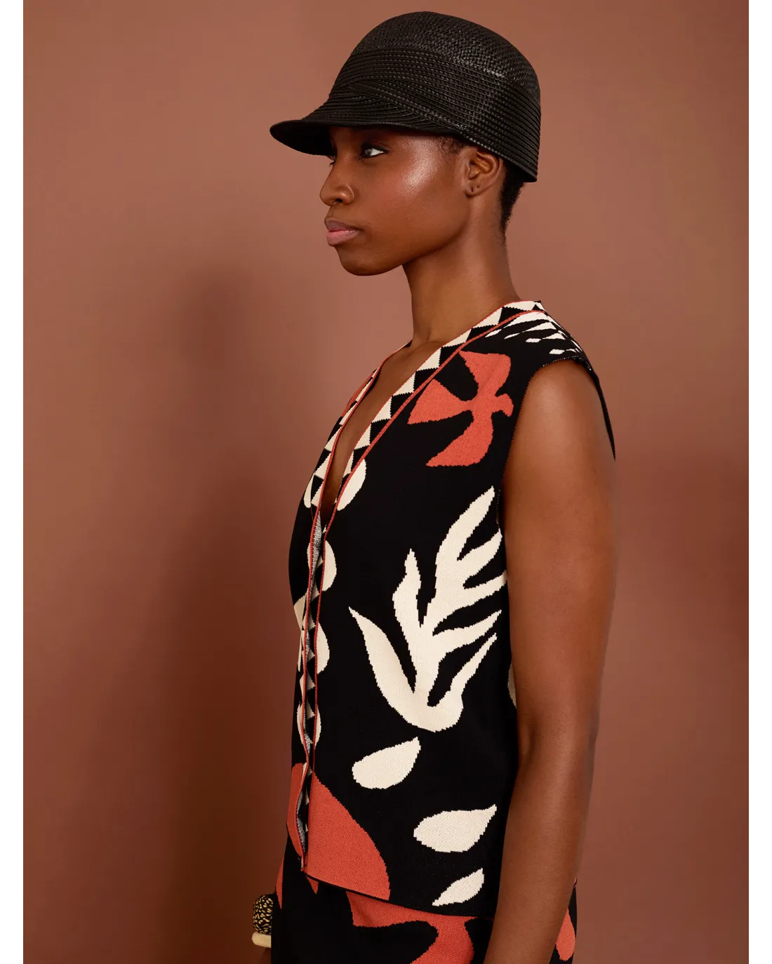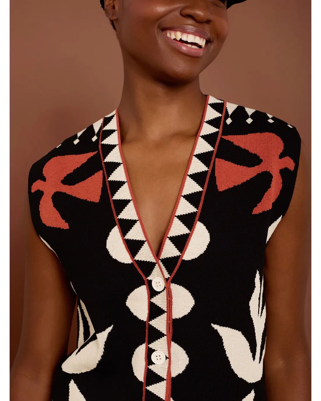 Chaleco confeccionado en tejido de punto medio con estampado étnico. Perfecto para combinar con falda M90F05CEM.