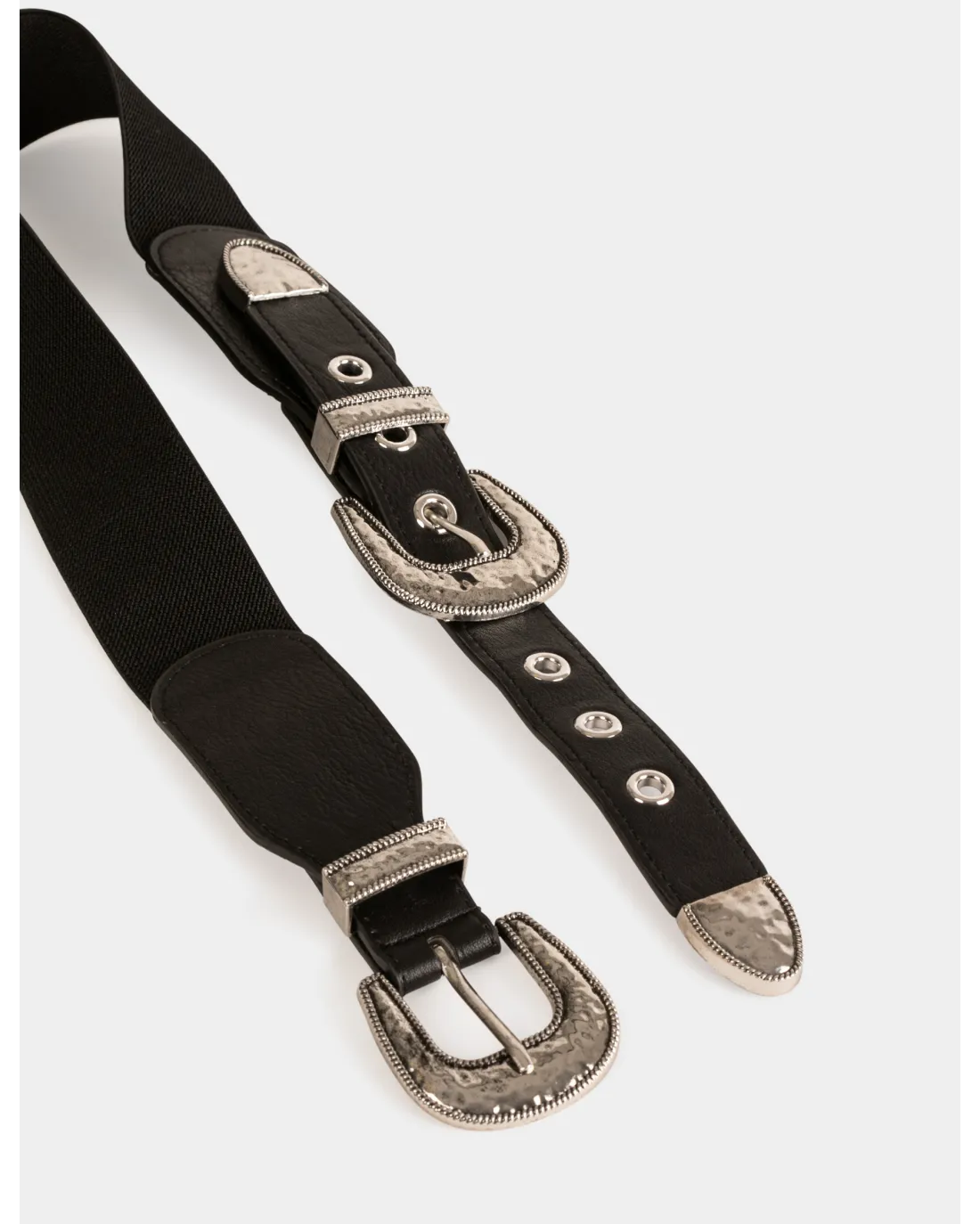 Cinturón elástico ajustable con doble hebilla martillada y trabilla fija.