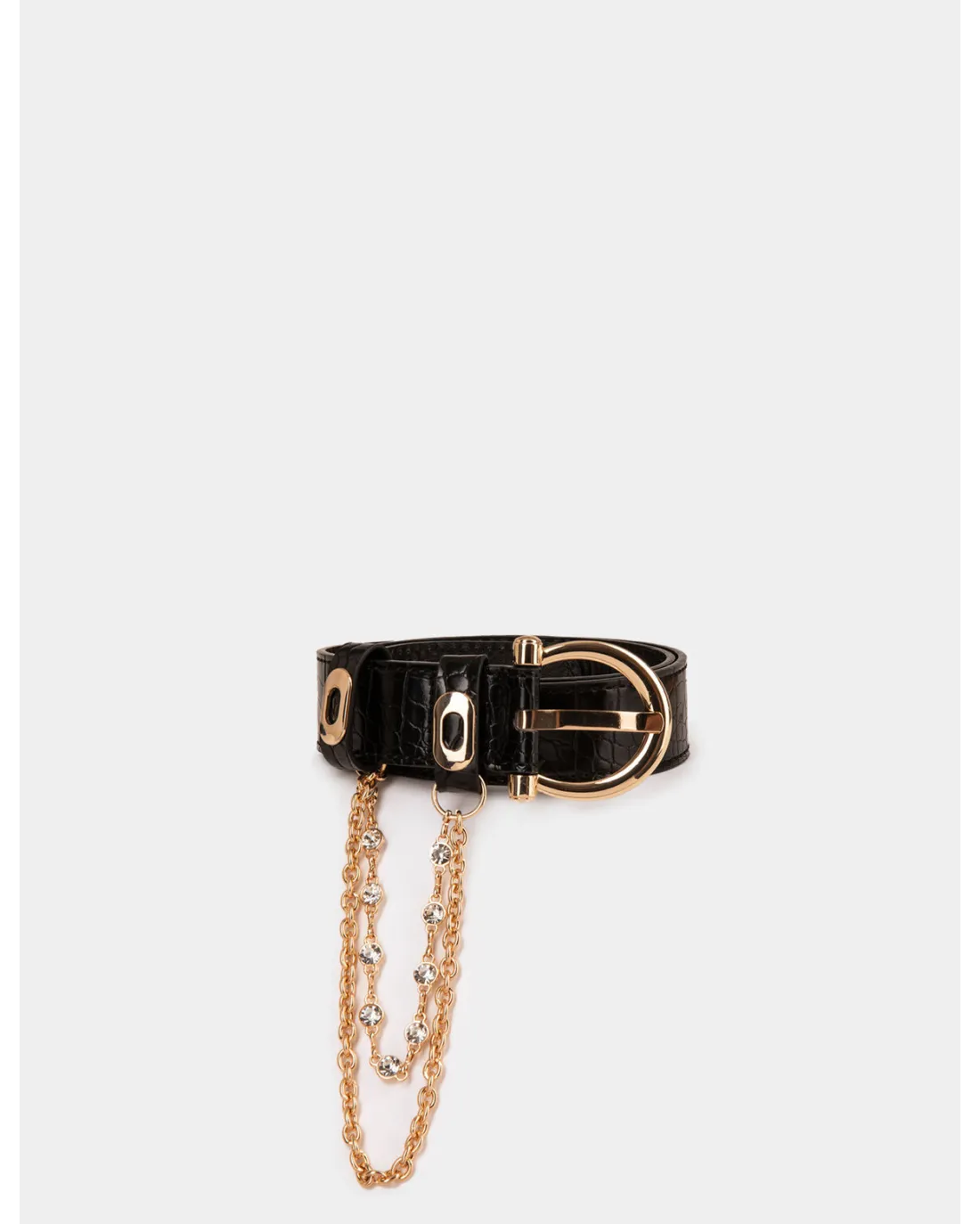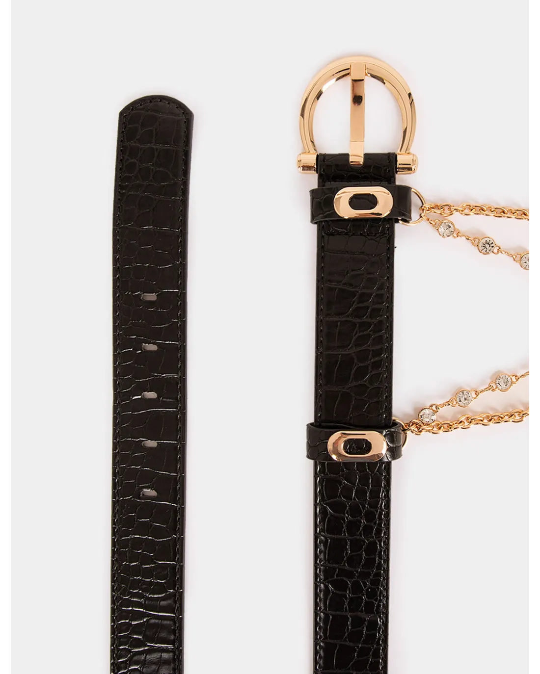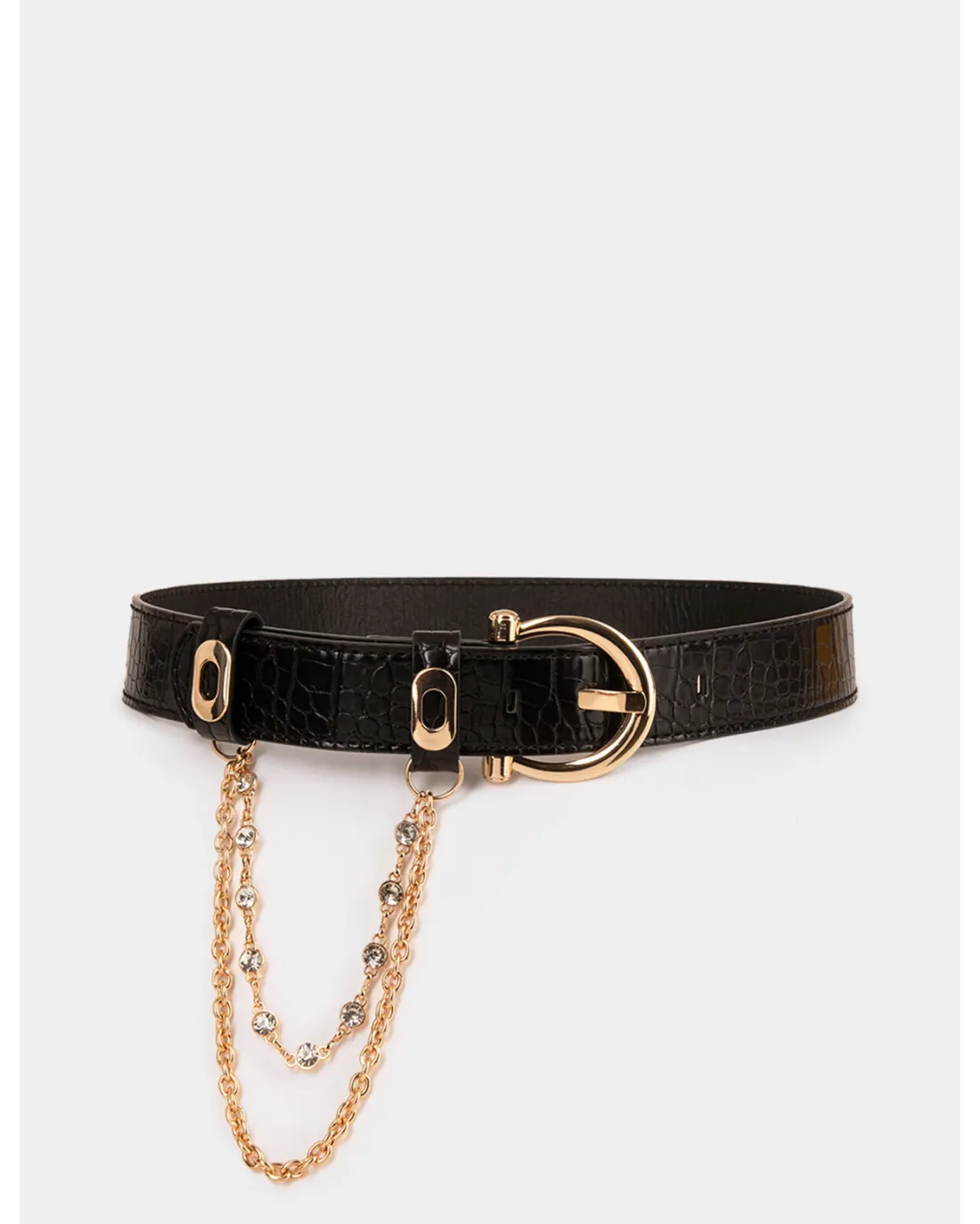 Cinturón ajustable efecto cocodrilo con hebilla dorada y detalle de cadenas efecto joya doradas.