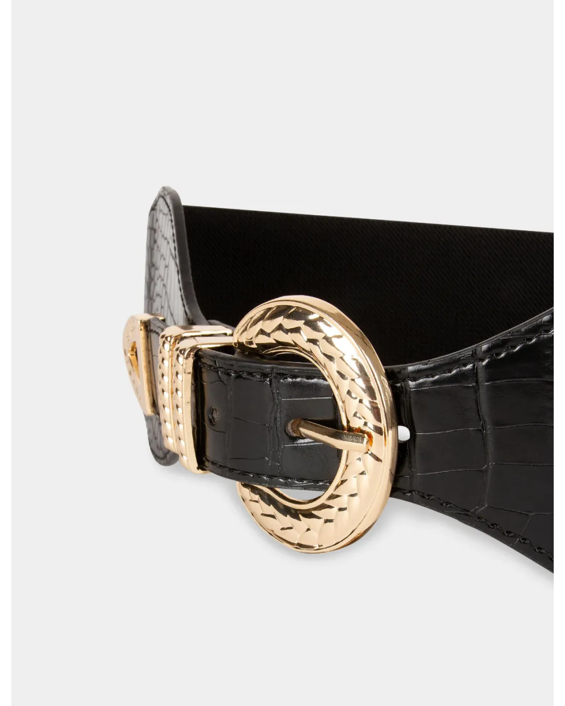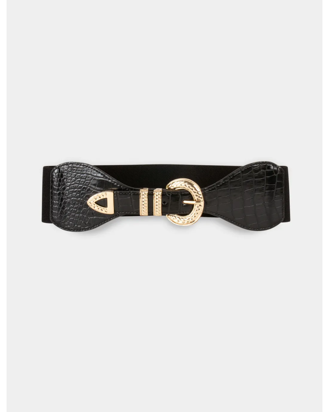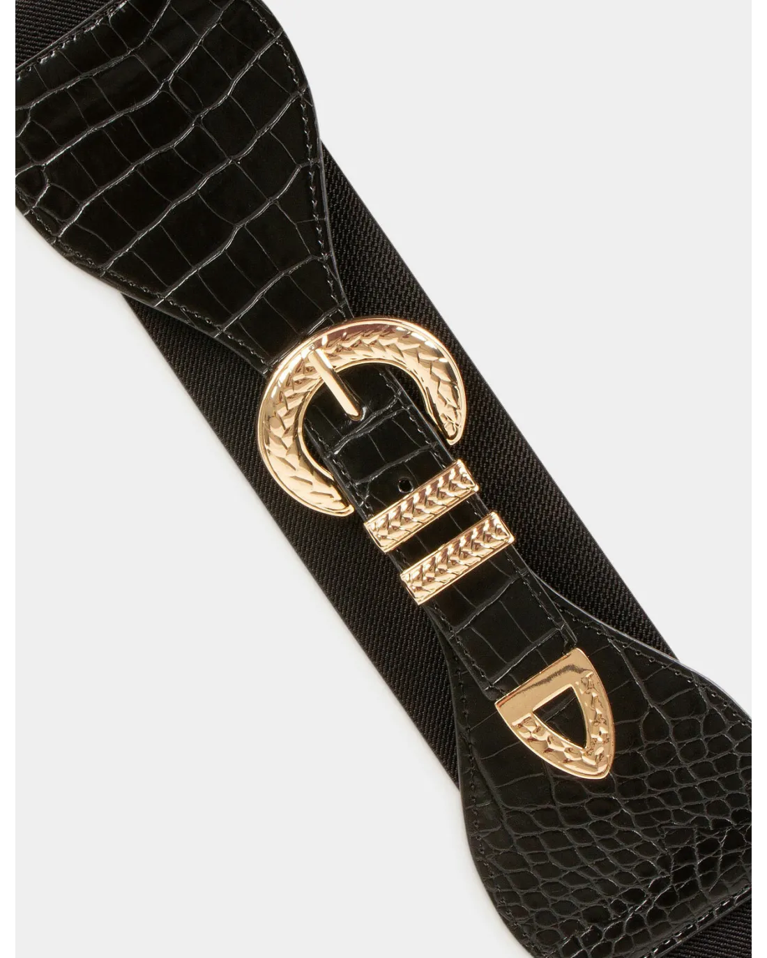 Cinturón ajustable efecto cocodrilo con hebilla dorada y detalle de cadenas efecto joya doradas.