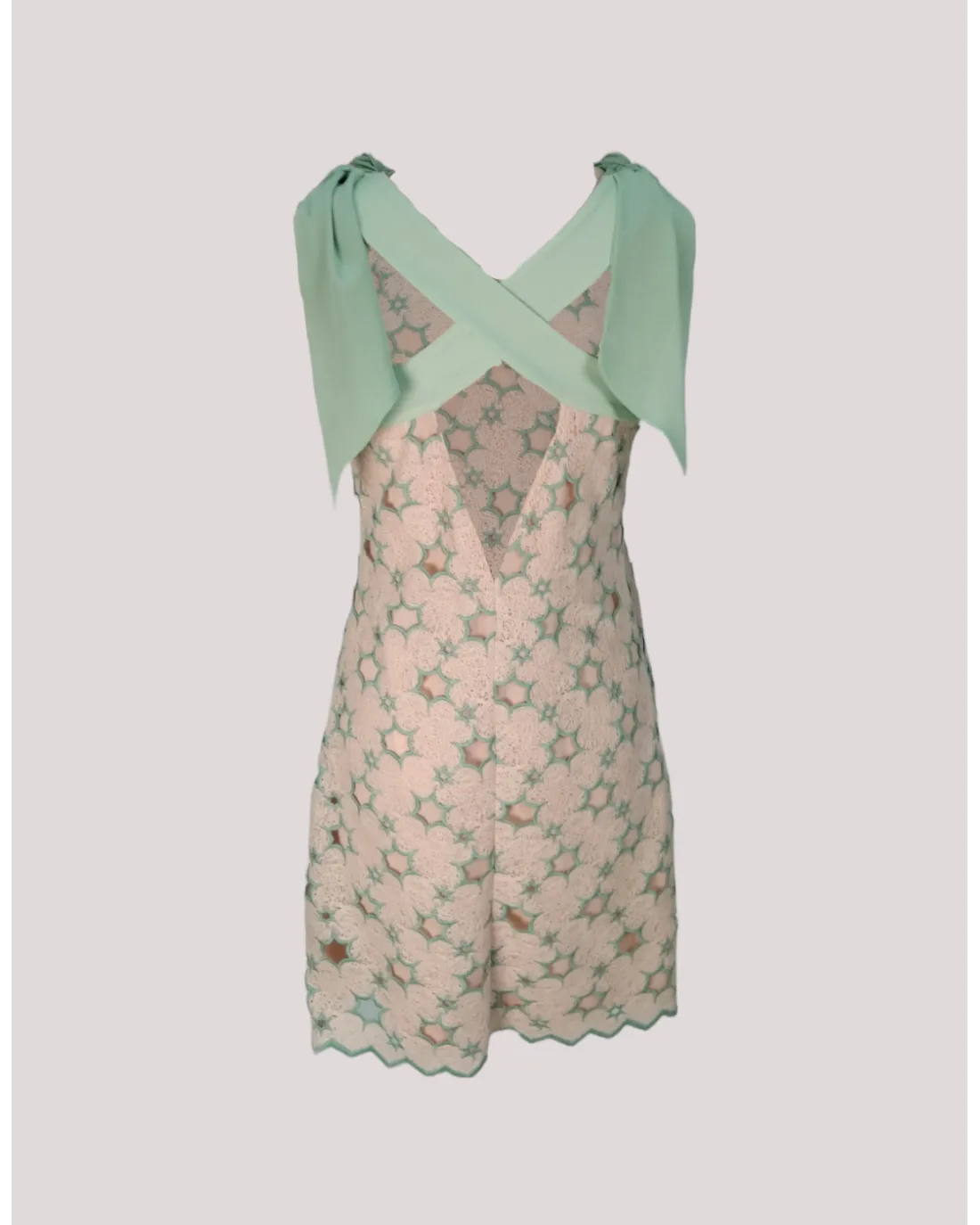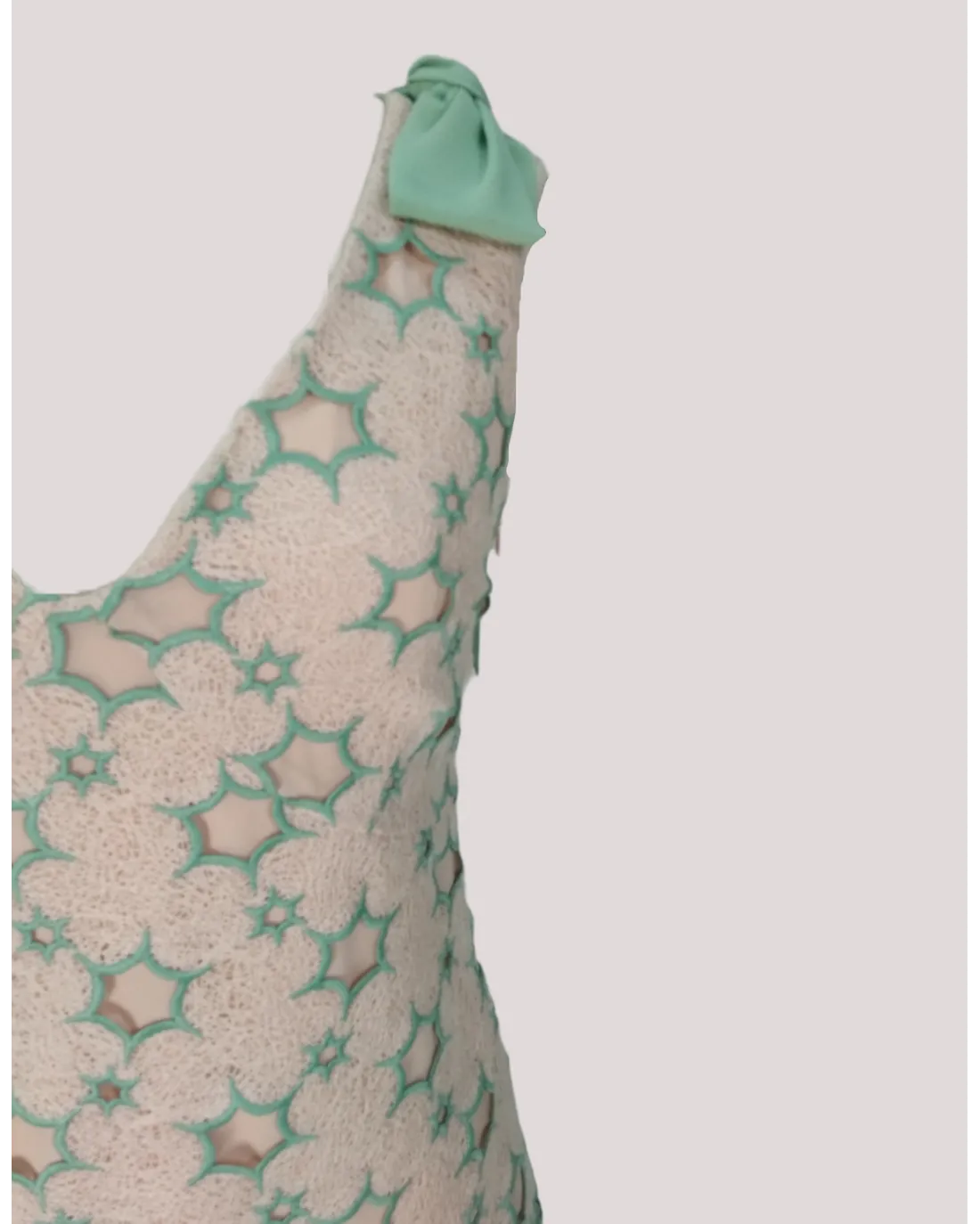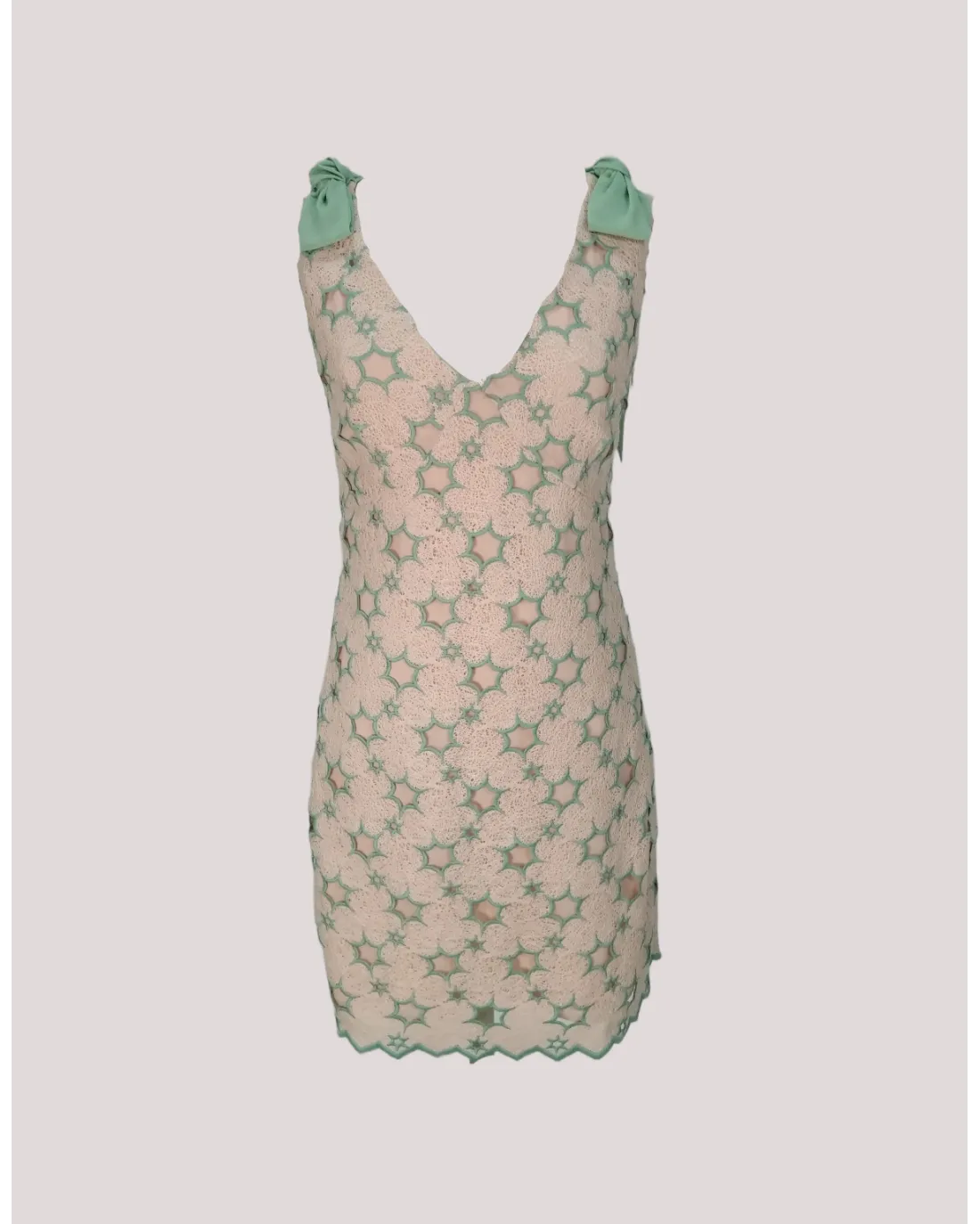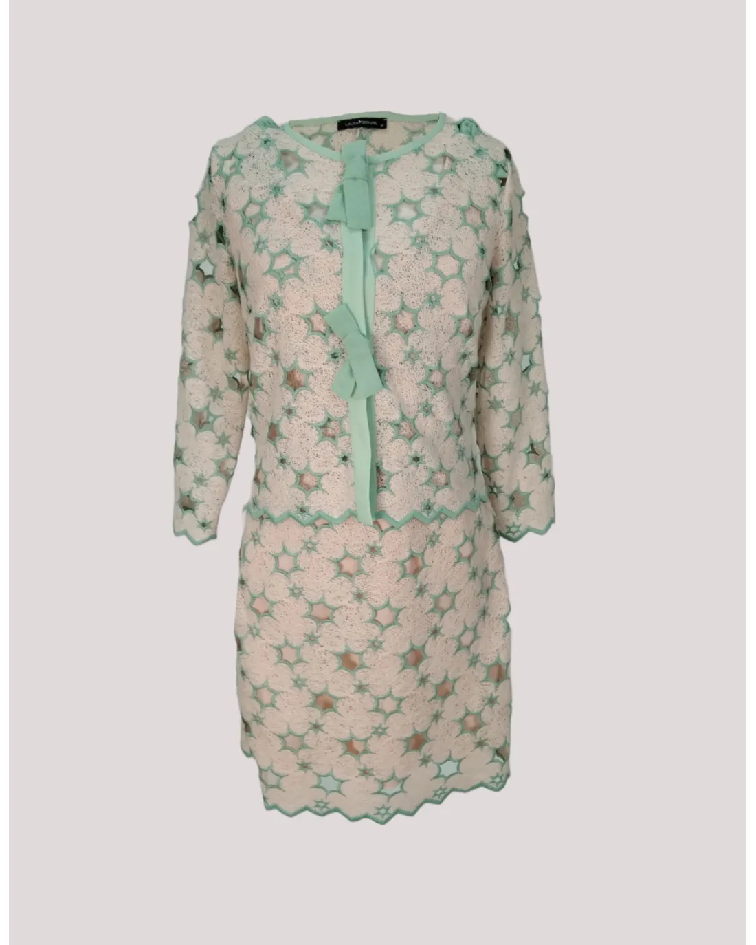 Conjunto de chaqueta y vestido confeccionados en un tejido calado, la chaqueta con bordes a contraste y cierre de dos botones metálicos centrales con lazos y el vestidos de tirantes con espalda cruzada y hombros con detalle de lazos a contraste, escote en V.