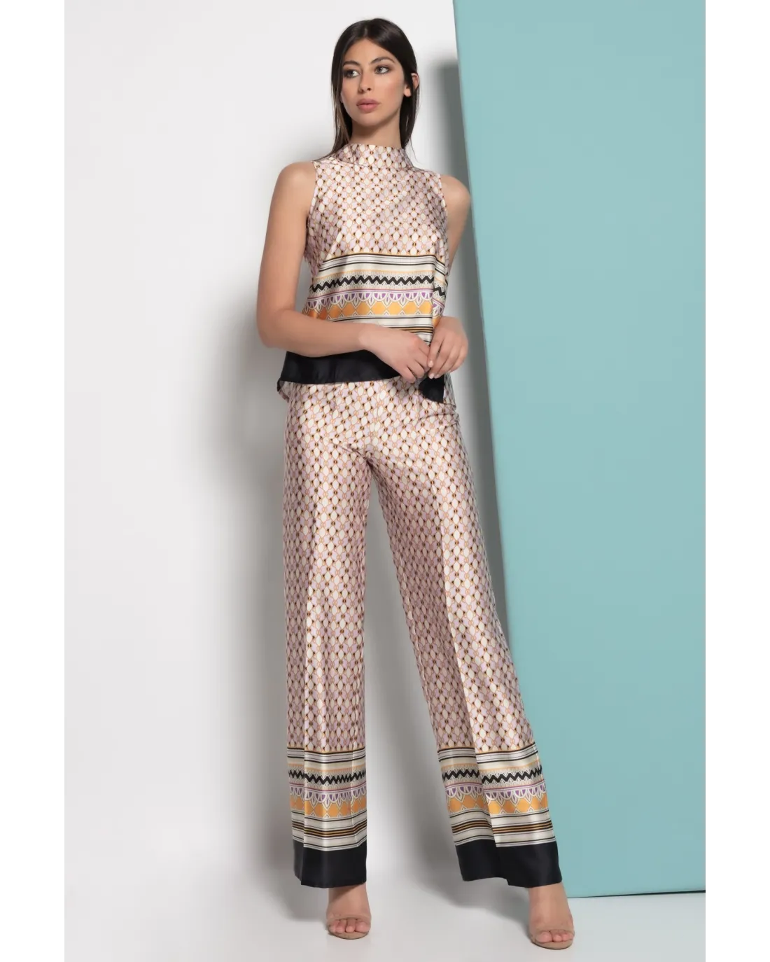 Elegante conjunto de blusa y pantalón confeccionado en tejido crepé estampado. Blusa de corte holgado con escote halter y pantalón fluido con cierre de cremallera invisible trasera.