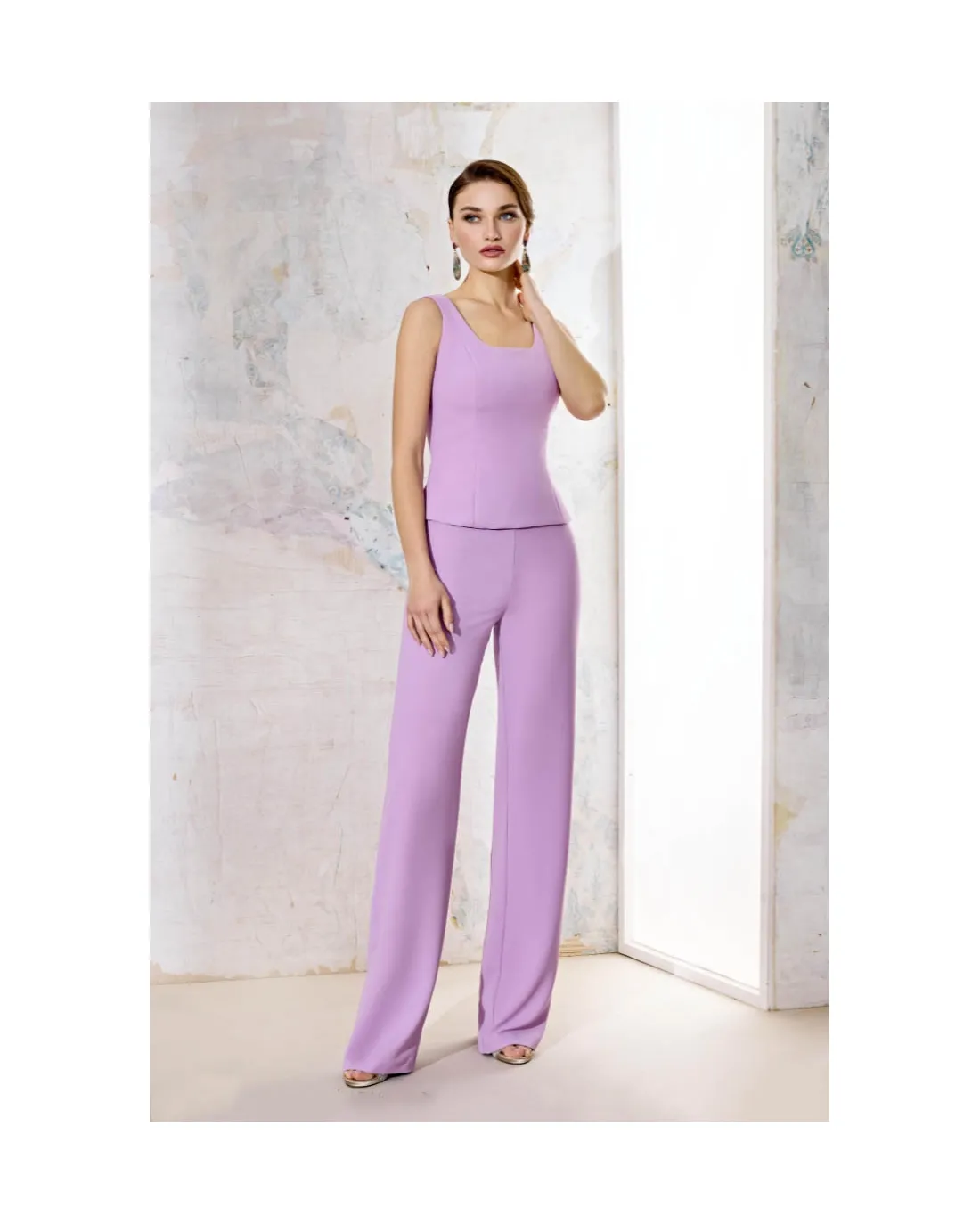 Conjunto Esthefan de blusa y pantalón. Blusa confeccionada en gasa con escote abierto cruzado acabado en lazada, manga francesa acabada en elástico y aplique floral en un lado de la blusa. Pantalón recto de talle medio confeccionado en un tejido mikado.