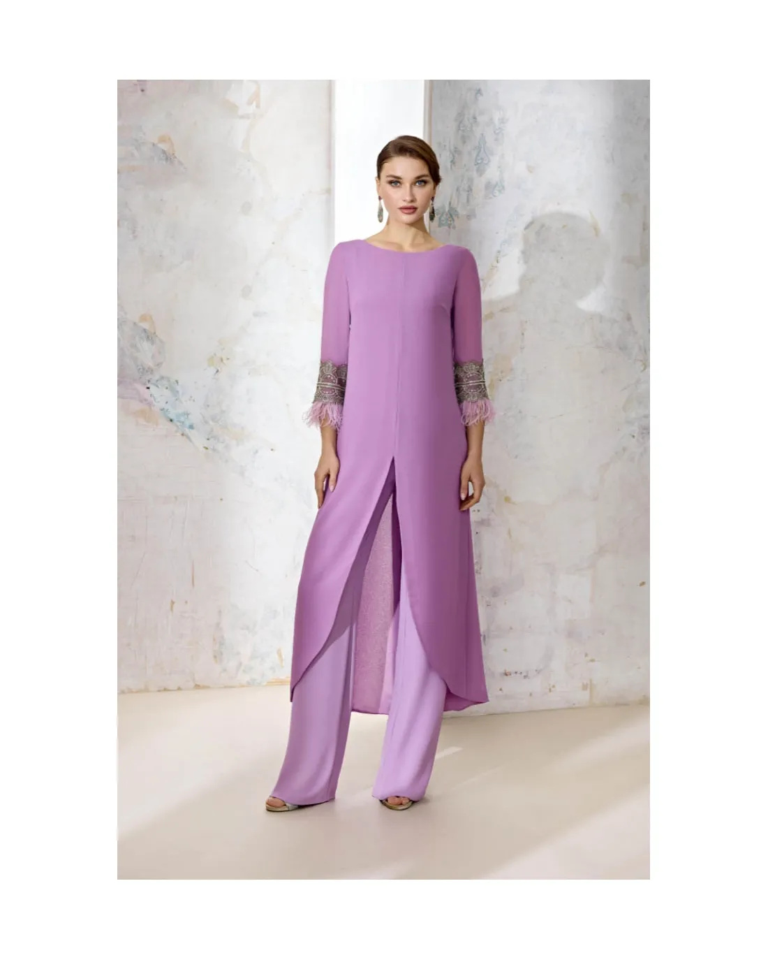 Conjunto de top de tirantes anchos con cremallera trasera, pantalón confeccionado tejido crepé y casaca en gasa georgette con cuello redondo, manga 3/4 acabada en pedrería con plumas y con abertura en la parte delantera de la casaca.