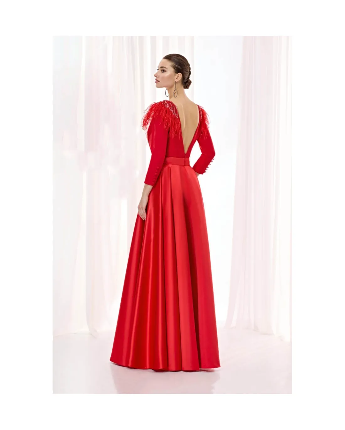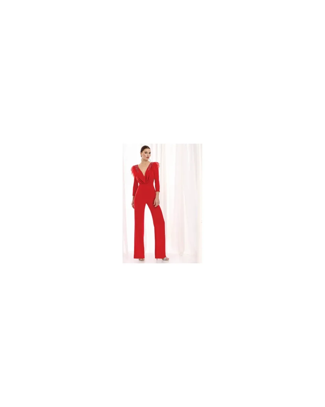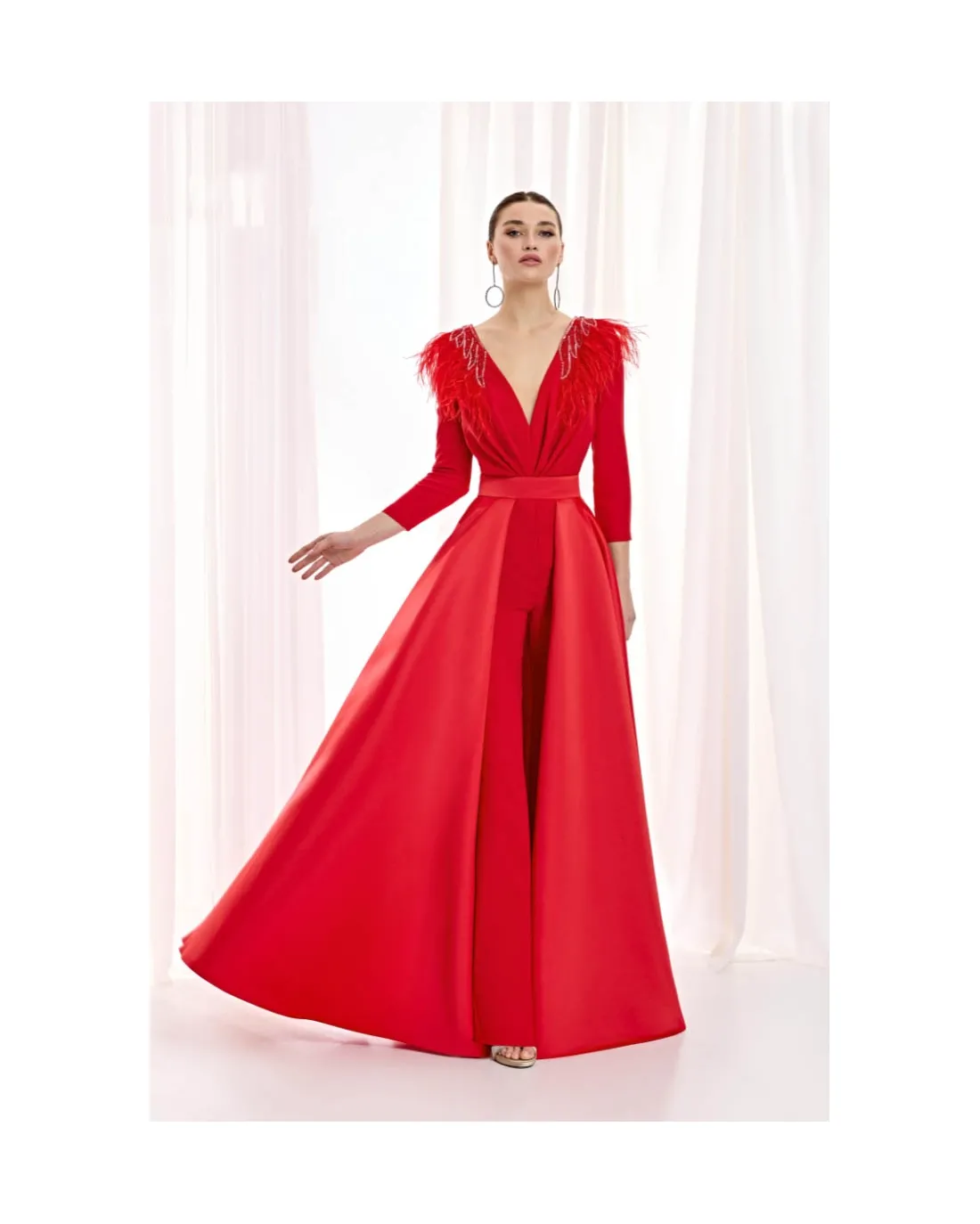 Mono confeccionado en tejido crepé con escote en V prolongado hasta la espalda, de manga larga con apliques de plumas en hombros y drapeado en el pecho. Sobrefalda con volumen confeccionada en tejido mikado con cinturilla. Conjunto ideal para destacar y ser la más diferente.