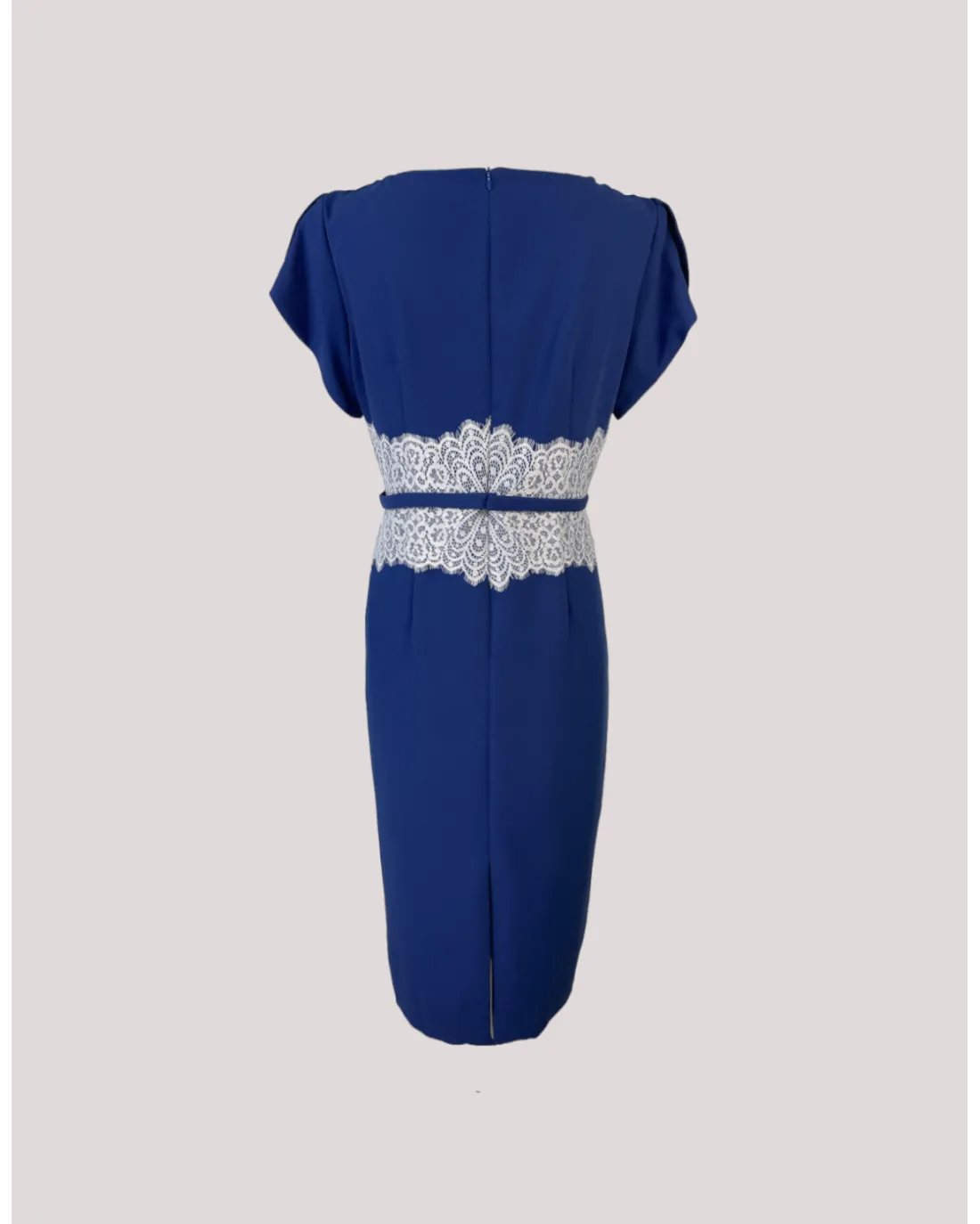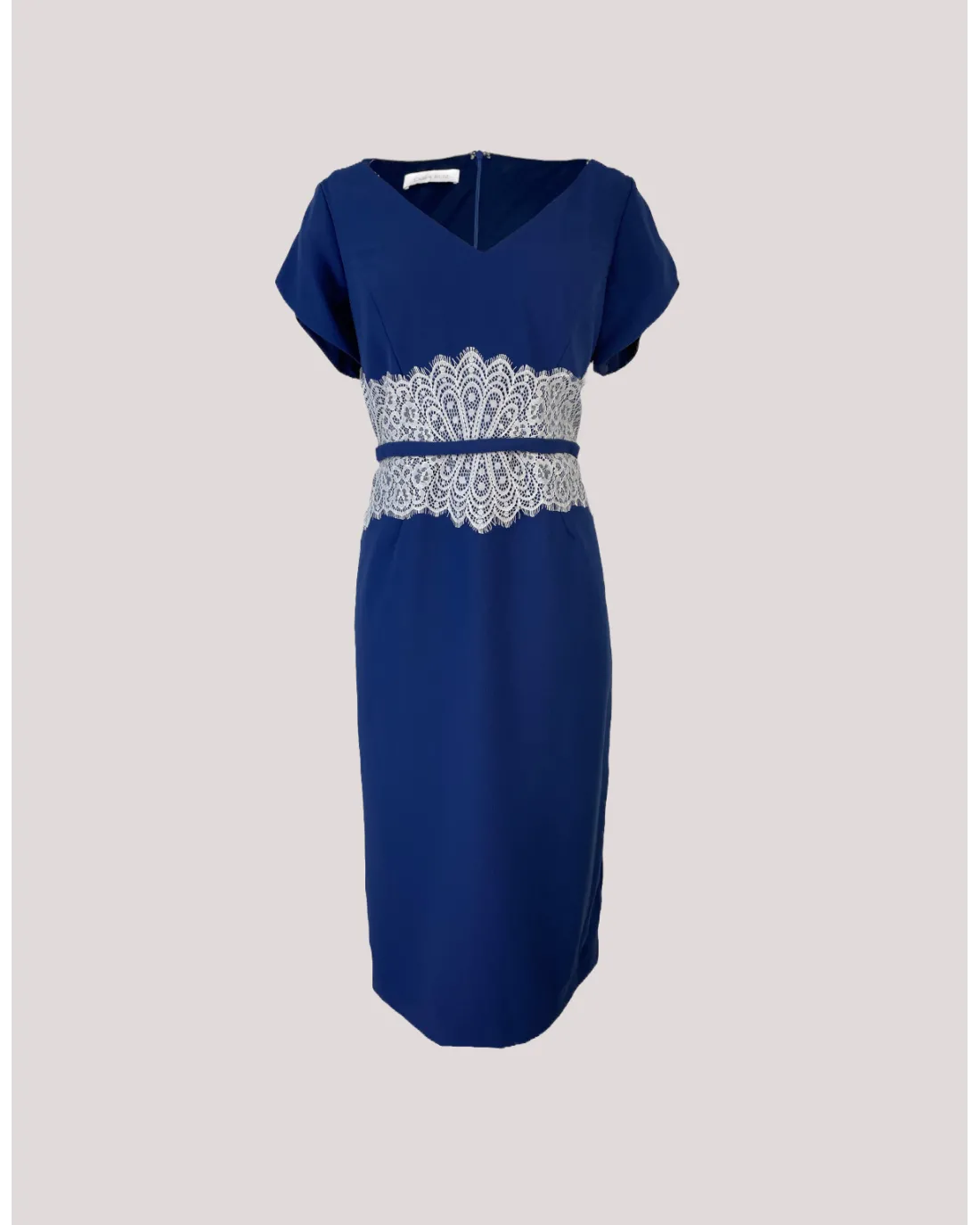 El vestido a media pierna confeccionado en tejido crepé con escote en V, manga corta y aplique de encaje en cintura a contraste con un cinturón finito en la tonalidad del vestido. La chaqueta confeccionada en tejido mikado efecto cruzado a rayas horizontales con amplio cuello, manga larga y aplique joya en el centro. Su cierre es de botones.