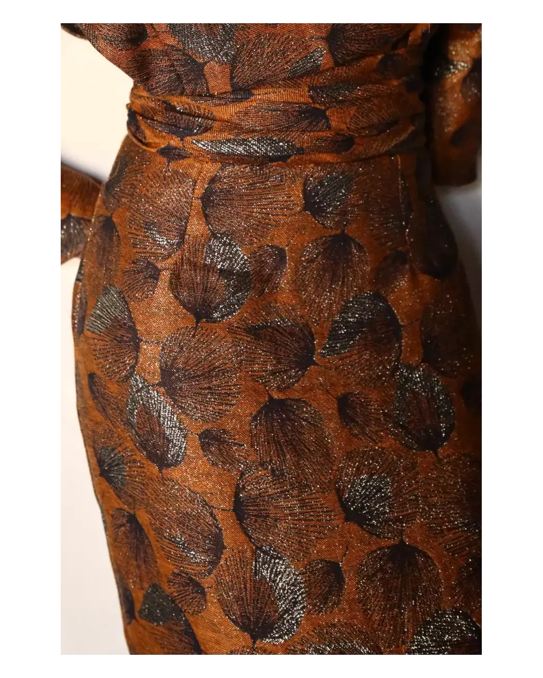 Falda de corte entubado y largo midi con una abertura trasera, estampada con hojas metalizadas y tonos cobre. De talle alto con cinturilla y cierre de cremallera trasera invisible.