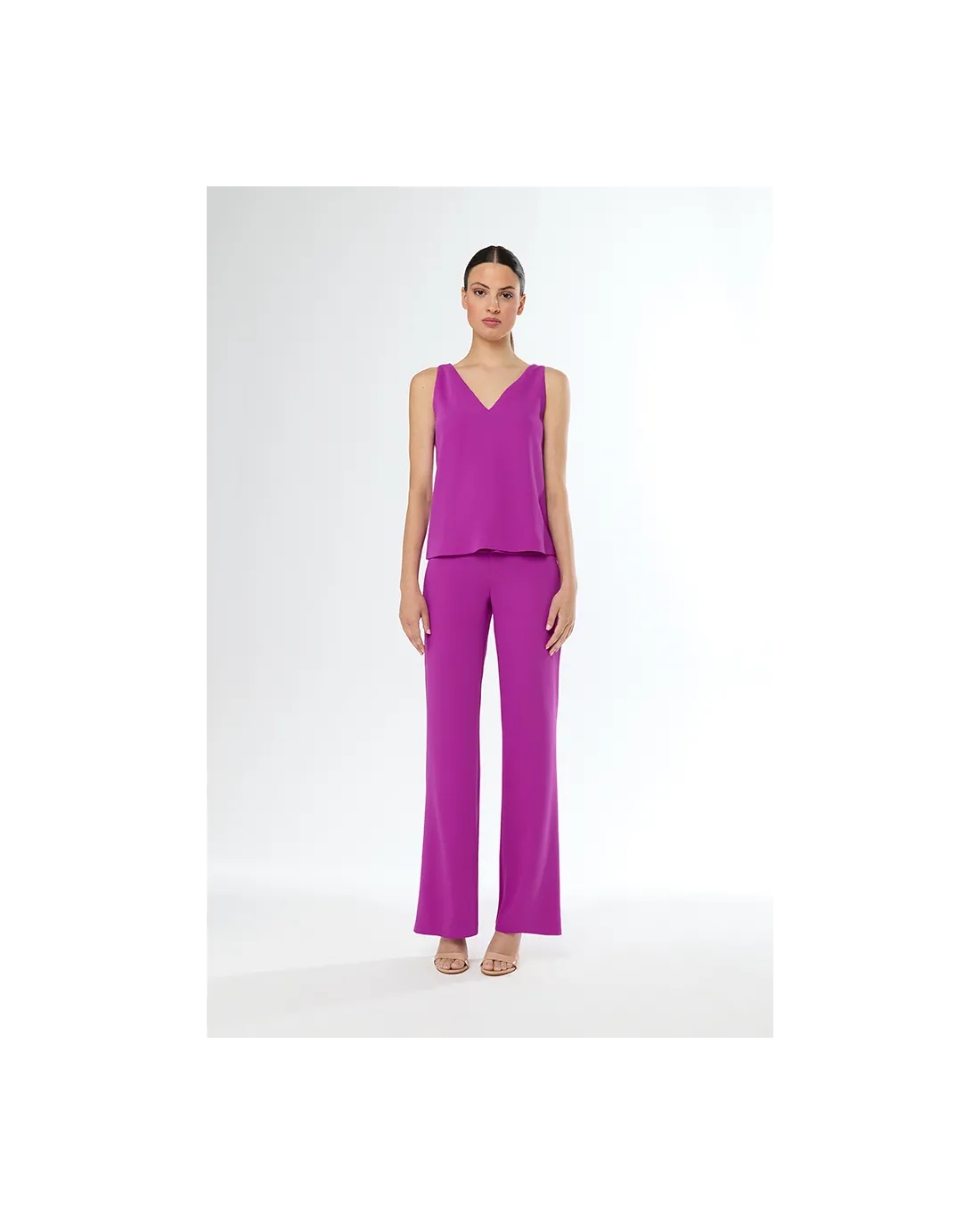 Elegante conjunto de blusa y pantalón confeccionado en tejido crepé estampado. Blusa de corte holgado con escote halter y pantalón fluido con cierre de cremallera invisible trasera.