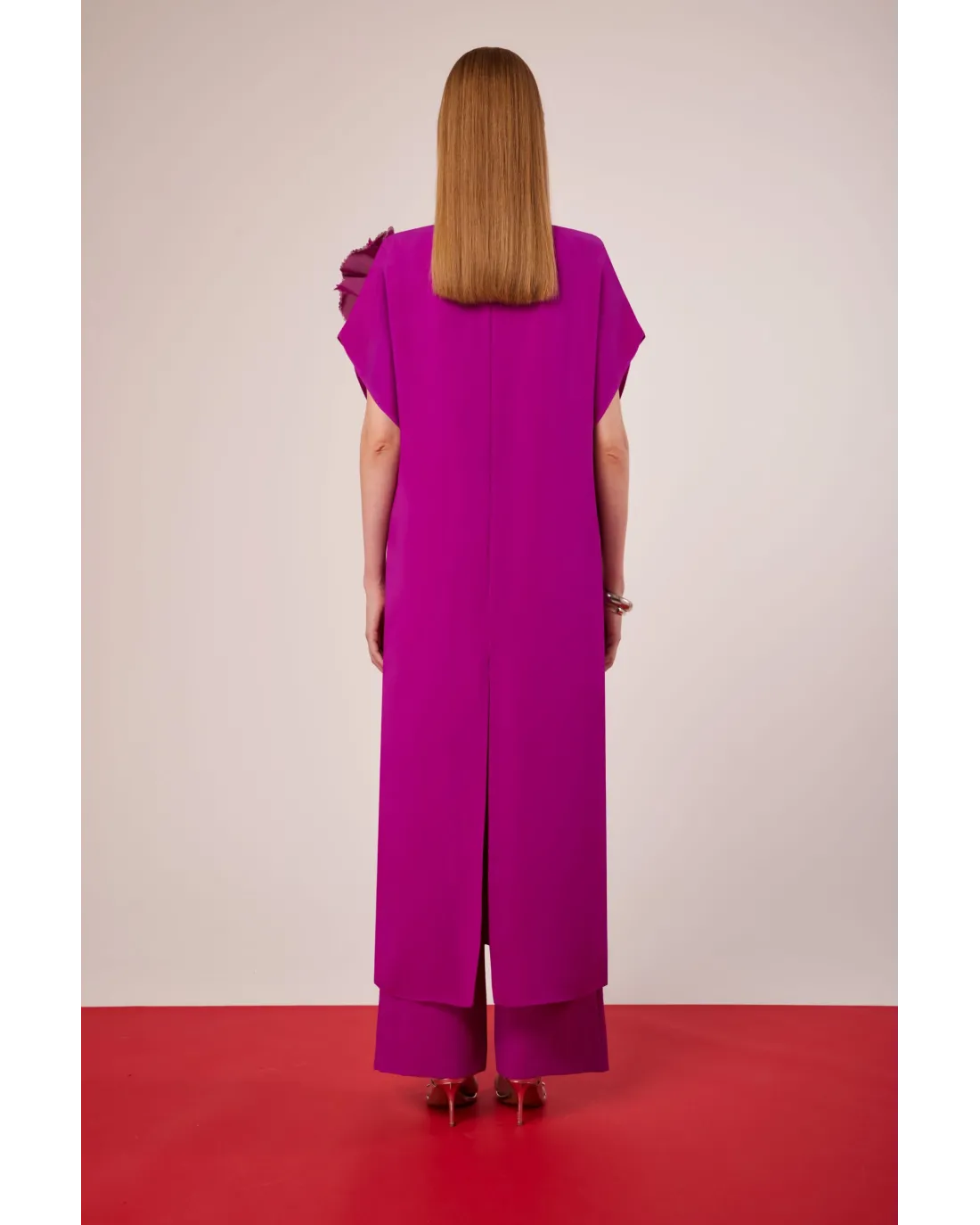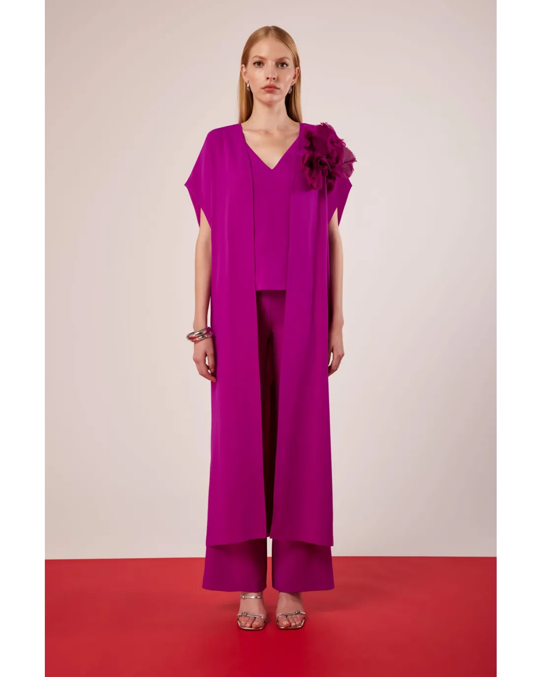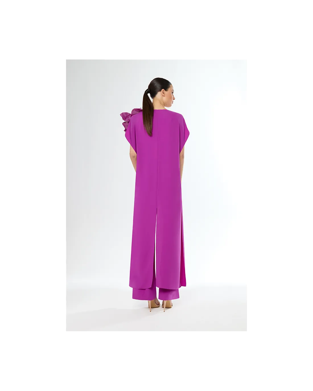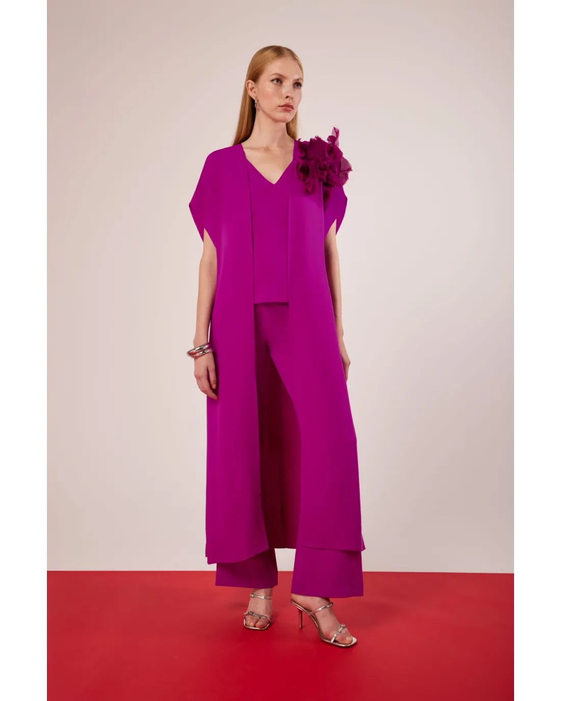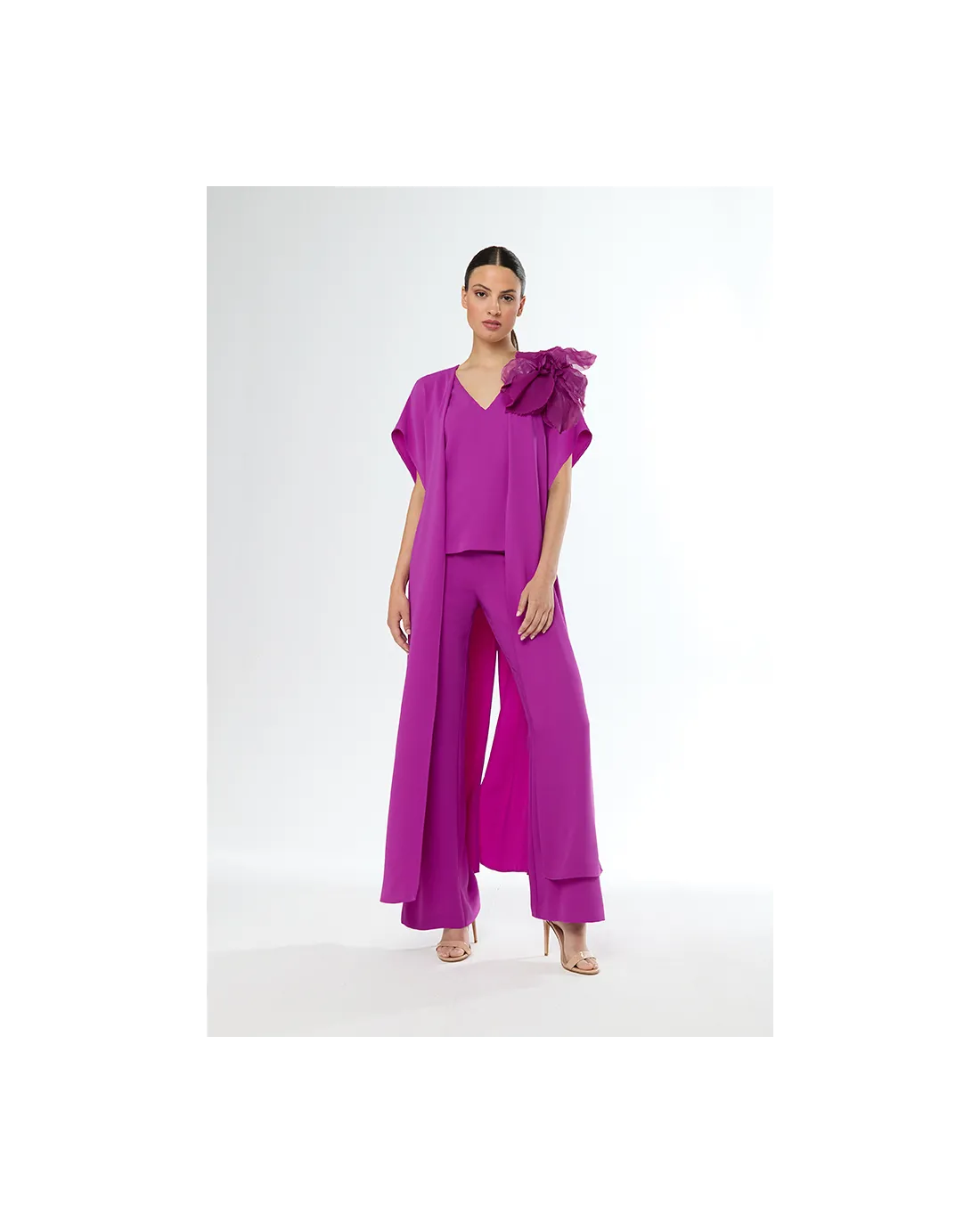 Conjunto de tres piezas confeccionado en tejido crepé vaporoso compuesto por: caftán de manga ranglan con aberturas laterales, blusa de hombros anchos y pantalón fluido con cinturilla y cierre de cremallera invisible lateral.