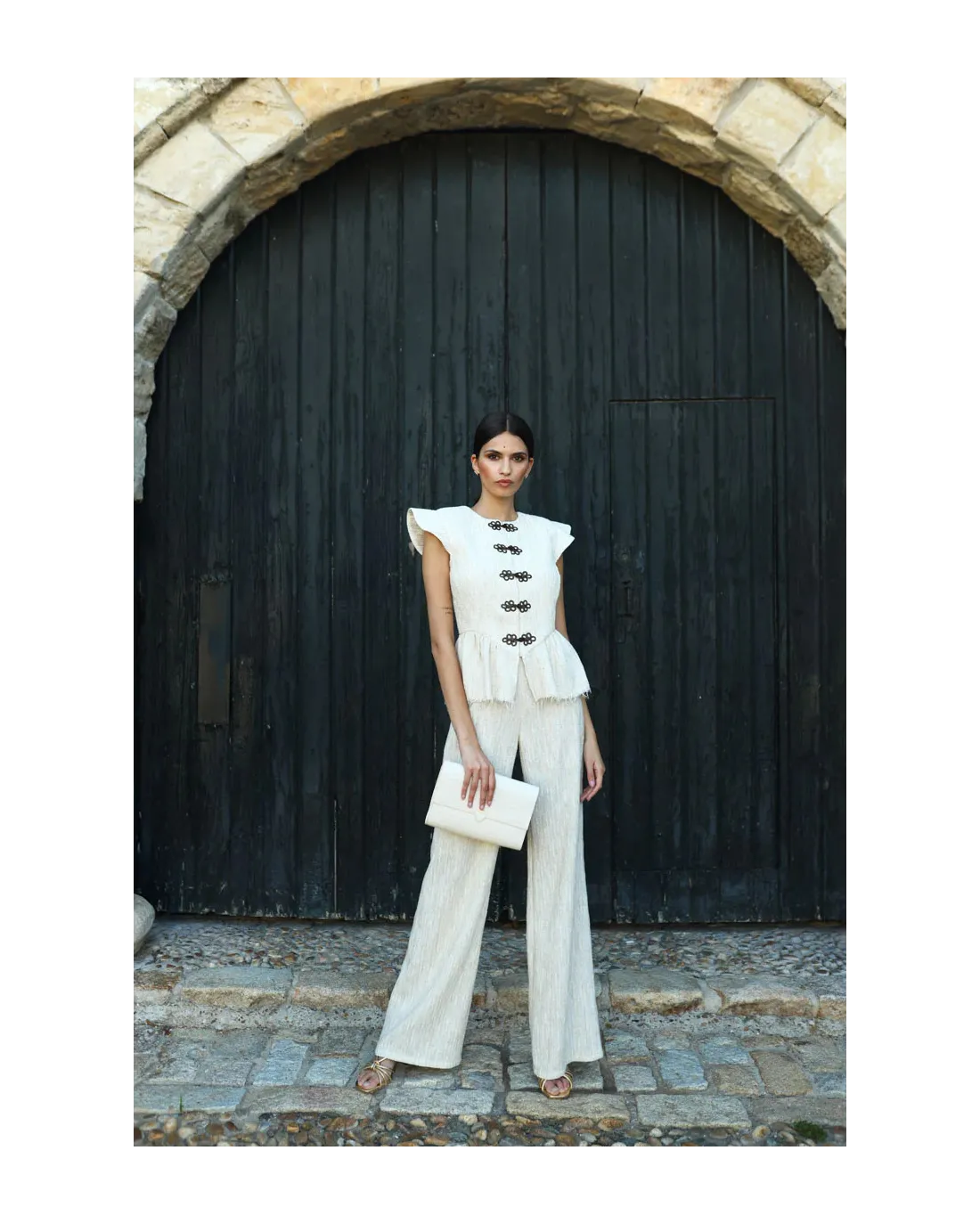 Chaqueta confeccionada en tejido rugoso con cuello redondo, hombros estructurados con volante, cierres a contraste y peplum en el final de la chaqueta.