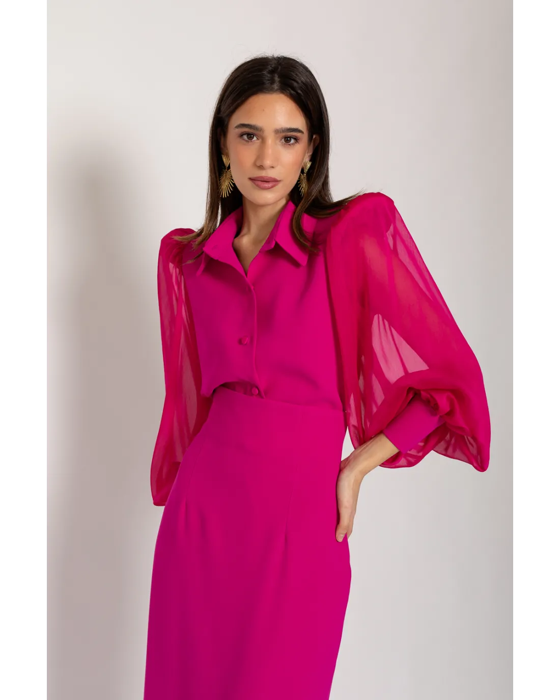 Conjunto de camisa confeccionada en tejido crepé con cuello camisero y mangas abullonadas confeccionadas en gasa acabadas en puño. La falda es de talle alto confeccionada en tejido crepé con abertura trasera y cierre de cremallera trasera.
