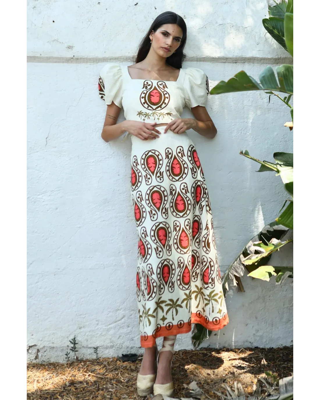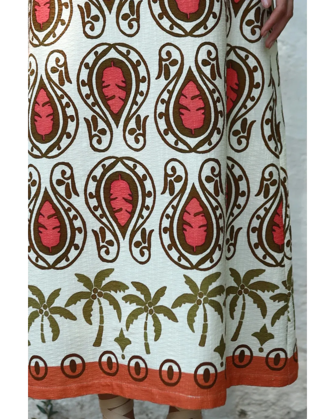 Falda de largo midi con corte evasé, confeccionada en tejido estampado en tonos cálidos con franja final es tono coral, cinturilla y cierre de cremallera trasera invisible. Perfecta para combinar con top OROCO.