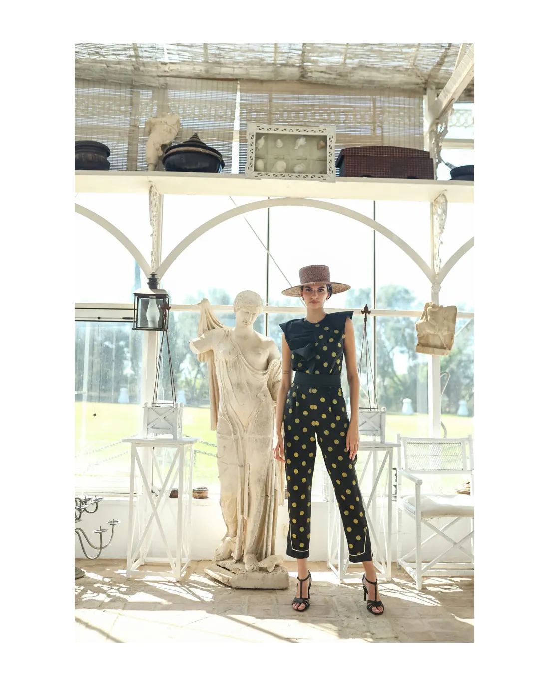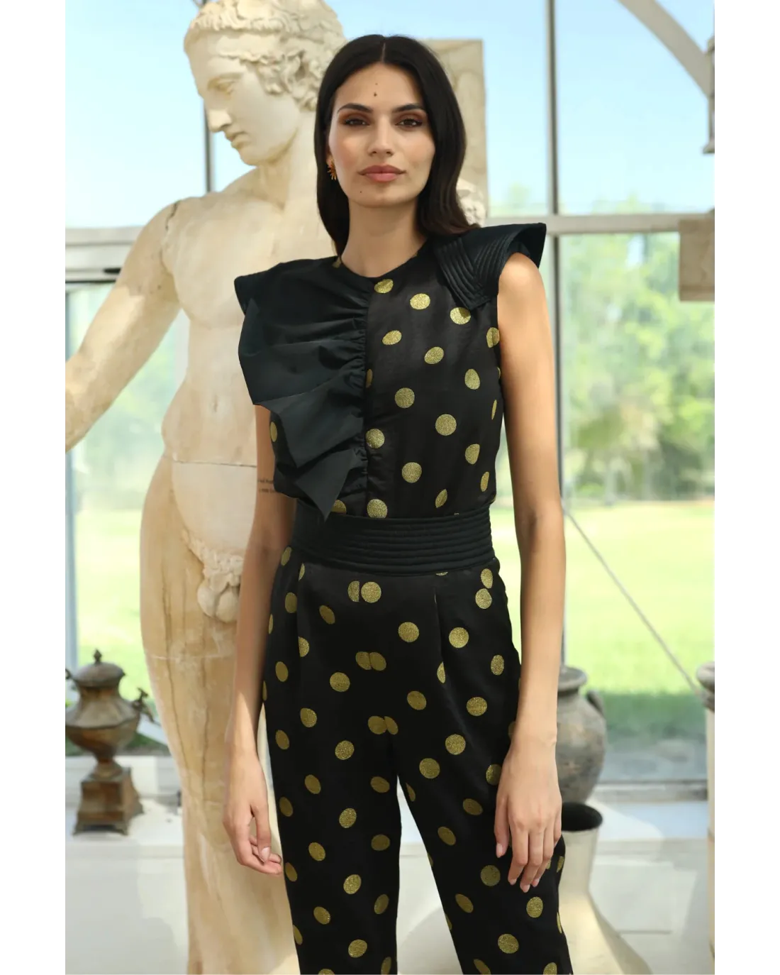 Top confeccionado en tejido ligero en tono negro con lunares dorados, hombros constructivos con volante delantero. Su cierre es de cremallera trasera invisible y botón. Perfecto para combinar con pantalón YABUC.