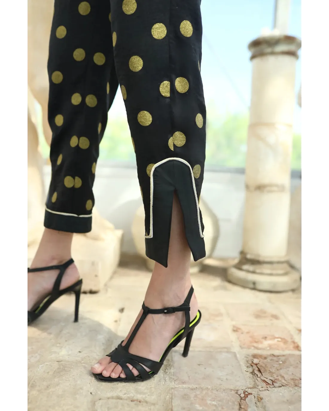Pantalón de corte recto en tono negro con lunares dorados con cinturilla drapeada y final del bajo con vivos en dorado y aberturas laterales. Su cierre es de cremallera trasera invisible. Perfecto para combinar con top YABUC.