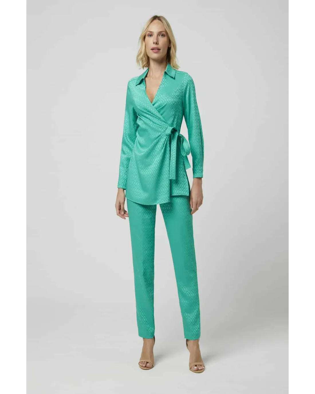 Conjunto de chaqueta y pantalón confeccionado en un ligero tejido haciendo dibujo de rombos. La chaqueta de corte cruzada con cuello camisero, manga larga y cierre de lazada en un lateras. El pantalón de corte recto con cierre de cremallera lateral invisible.