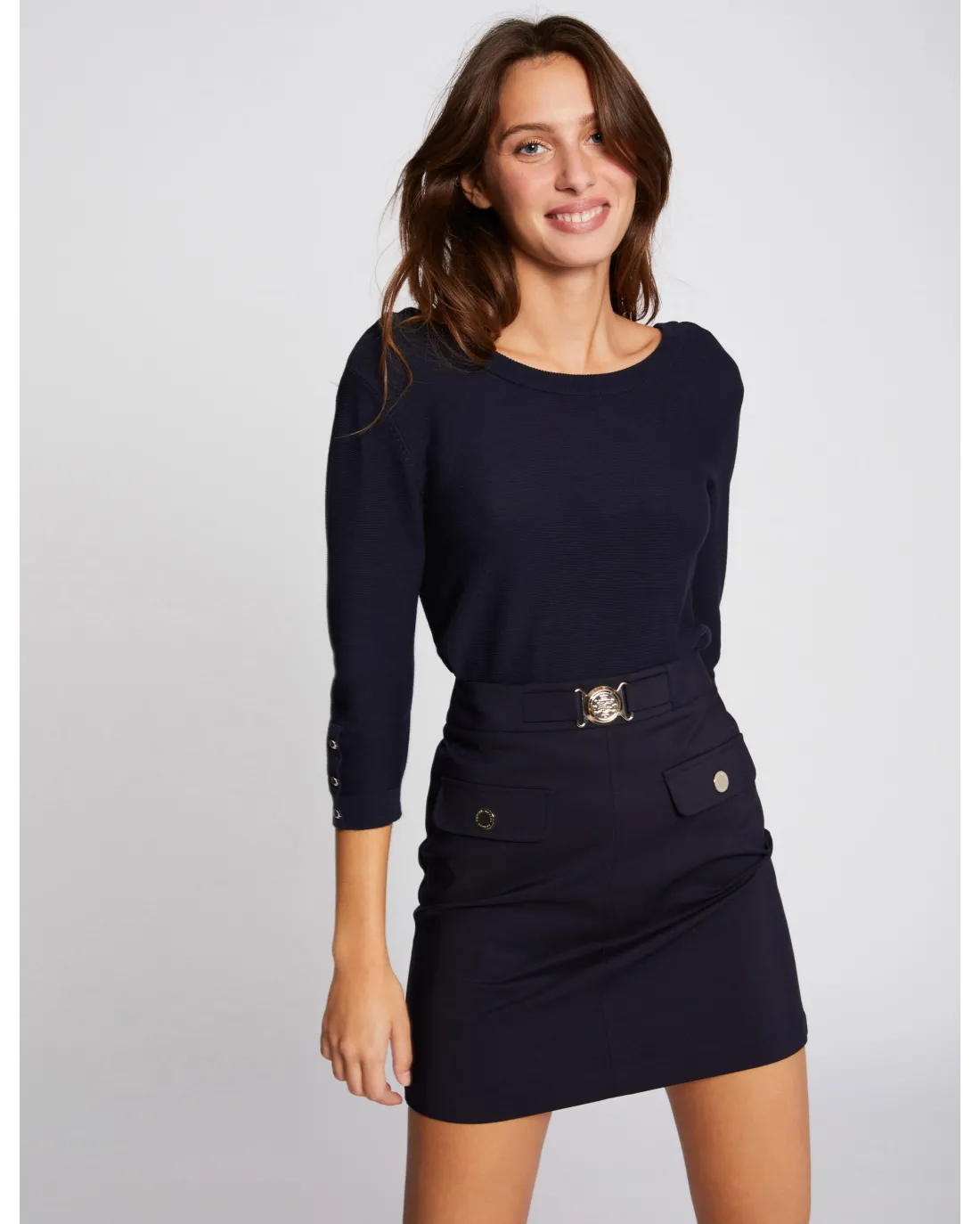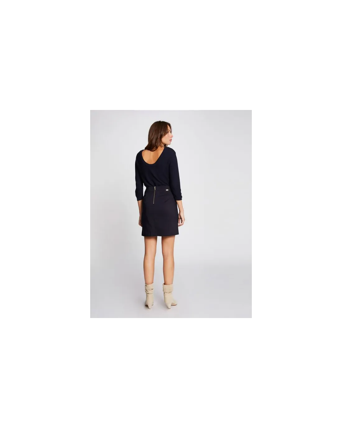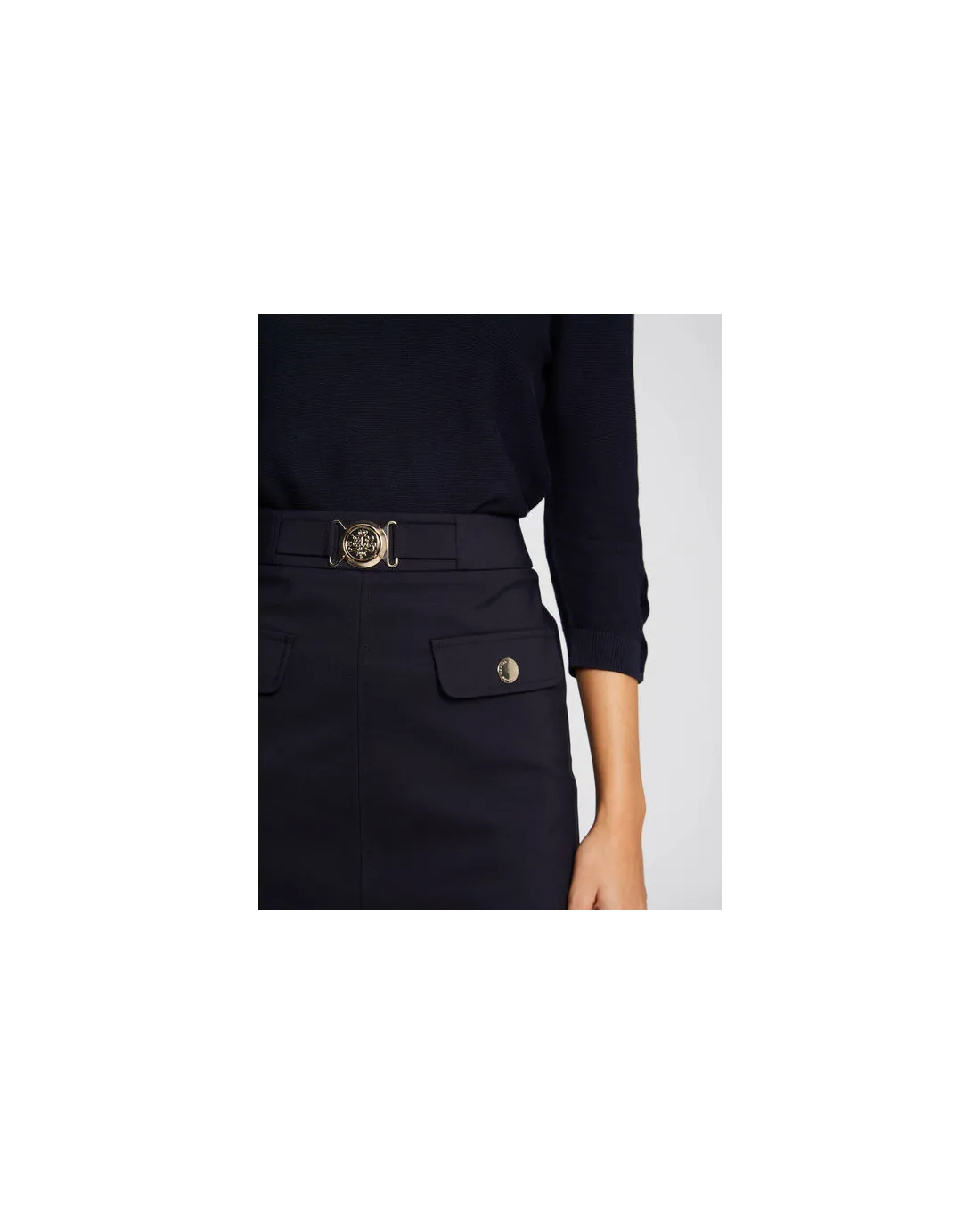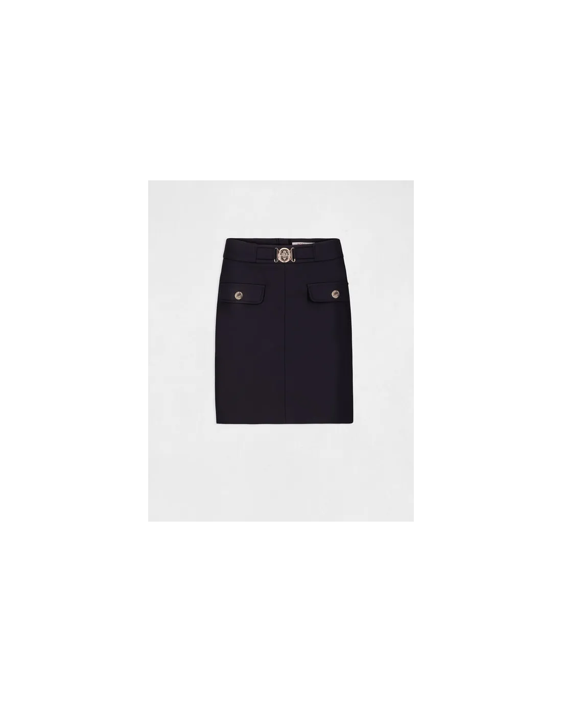 Falda corta con cinturilla, hebilla plateada con dos solapas de bolsillos centrales y cierre con cremallera trasera.