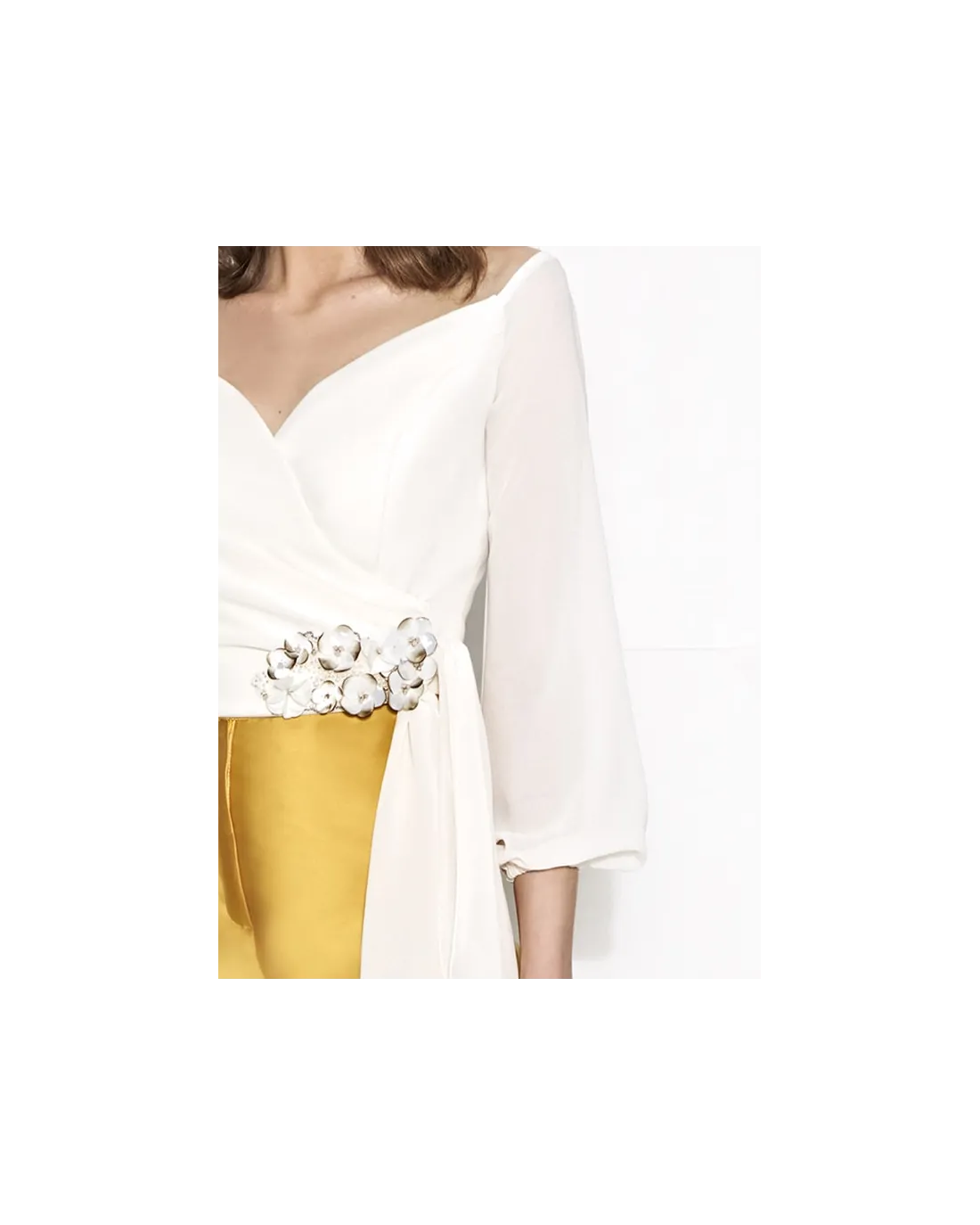 Conjunto Esthefan de blusa y pantalón. Blusa confeccionada en gasa con escote abierto cruzado acabado en lazada, manga francesa acabada en elástico y aplique floral en un lado de la blusa. Pantalón recto de talle medio confeccionado en un tejido mikado.