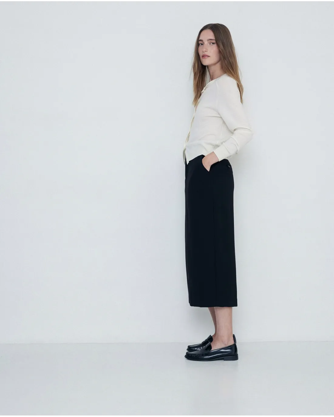 Falda de largo midi recta confeccionada en tejido reciclado con bolsillos laterales, traseros y cierre de cremallera y botón central.